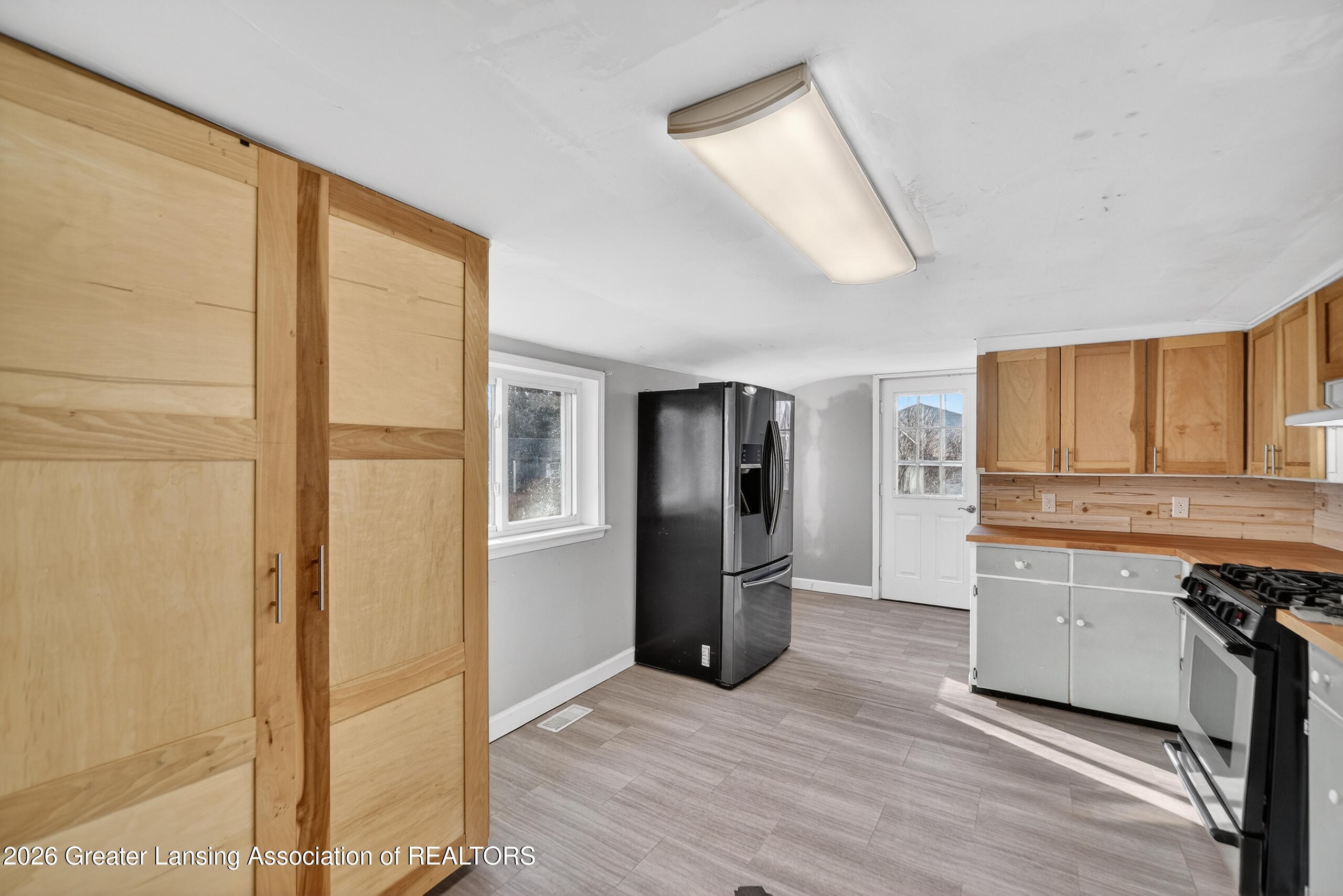This spacious 4 bedroom, 1 bath home offers 1,769 sq ft of comfortable living space and is just blocks from downtown St. Johns - Home of the popular Mint Festival - and the Rails to Trails. Step onto the charming wrap-around front porch - Ideal for morning coffee or handing out candy on Halloween night. Inside, you're greeted by a beautiful staircase with generous storage underneath. To the left is a bright family room with lovely stained glass and a large picture window. The adjacent dining area is large enough to serve as a second living space and includes a pellet stove for added warmth and ambiance. The kitchen offers an open layout with room for a breakfast nook.