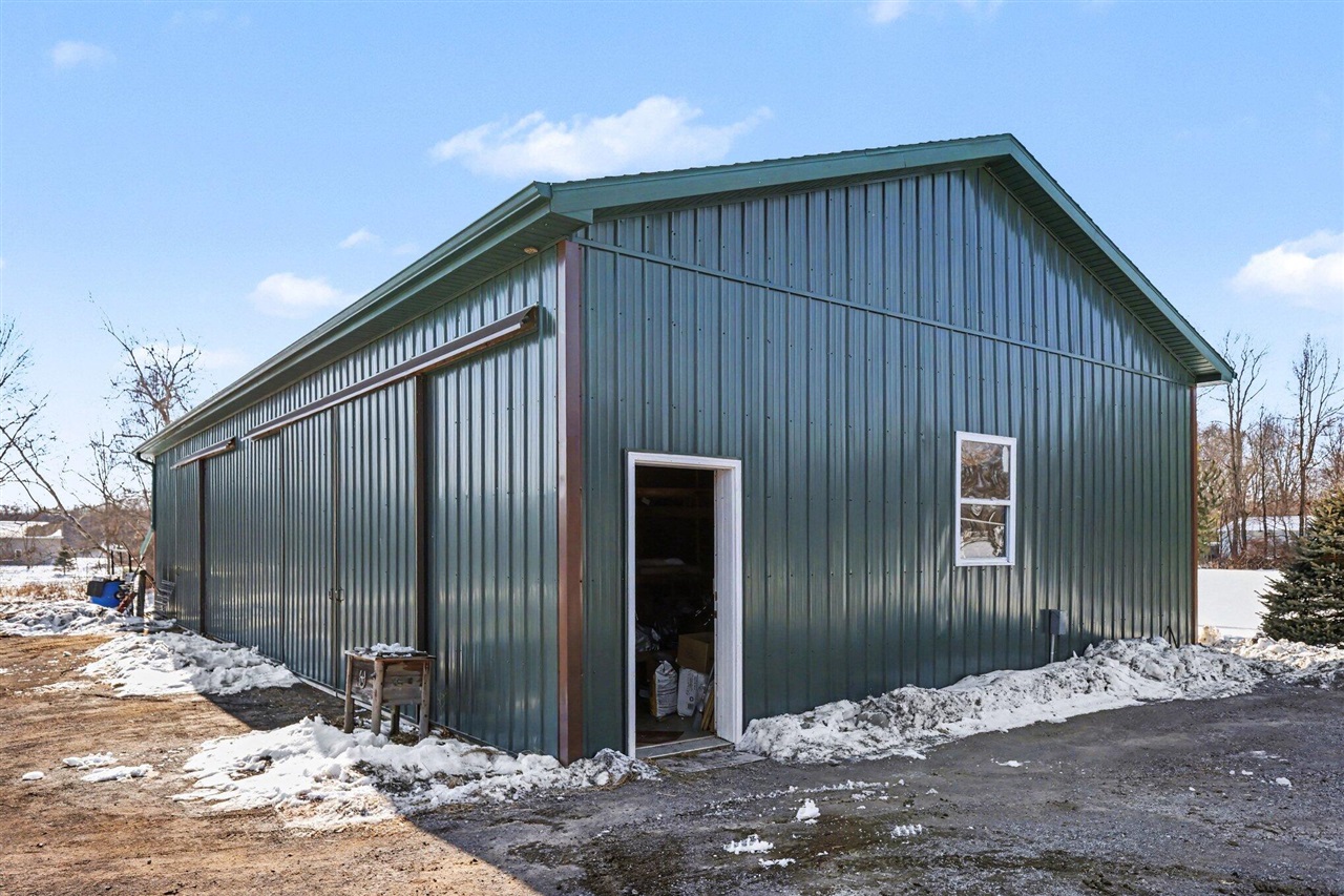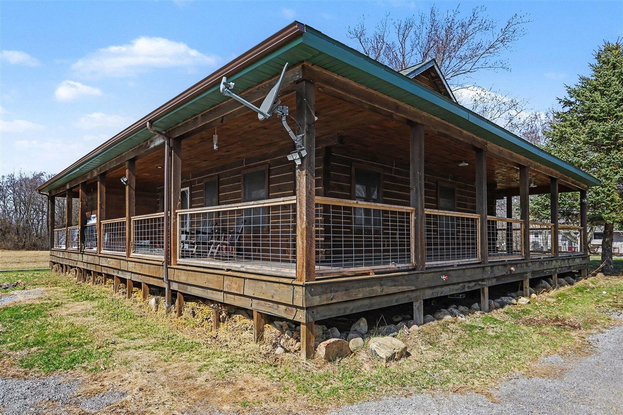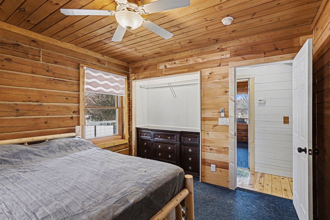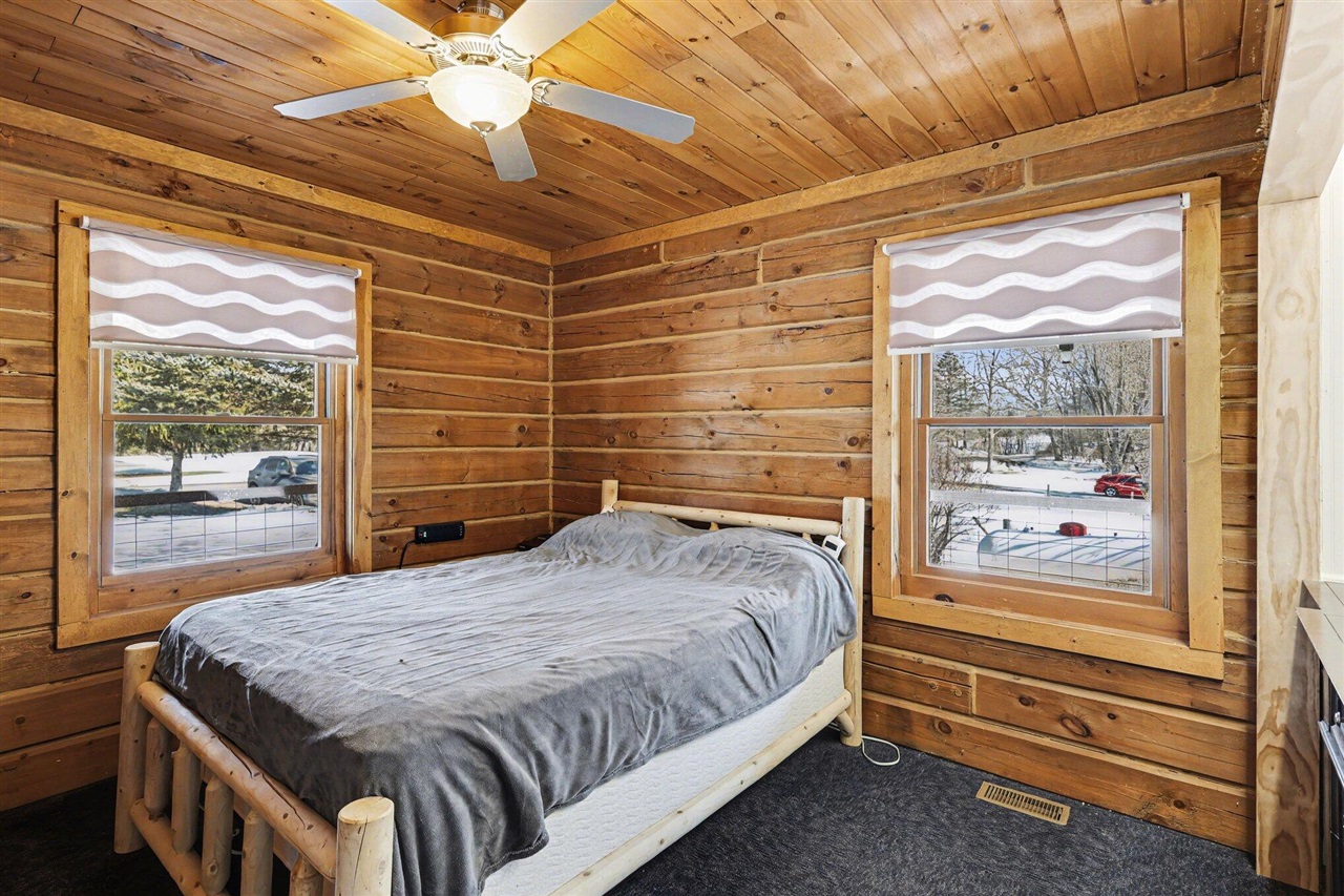 Nestled on peaceful acreage, this charming country log home offers the perfect blend of rustic character and everyday comfort. A welcoming wraparound covered porch invites you to slow down, sip your morning coffee, and soak in the surrounding nature.Inside, the home features soaring vaulted ceilings and warm wood flooring that highlight the open living space. The kitchen flows seamlessly into the living room making it ideal for gatherings and casual entertaining. With two comfortable bedrooms plus a spacious upper-level den or potential third bedroom overlooking the living room, there's flexibility for guests, a home office, or a cozy retreat.The full basement provides abundant storage with built-in shelving, keeping everything organized and out of sight. Outside, the impressive pole barn, built in 2009, is ready for hobbies or livestock and includes three horse stalls and a fenced pasture area. All of this and located in Northwest School District.