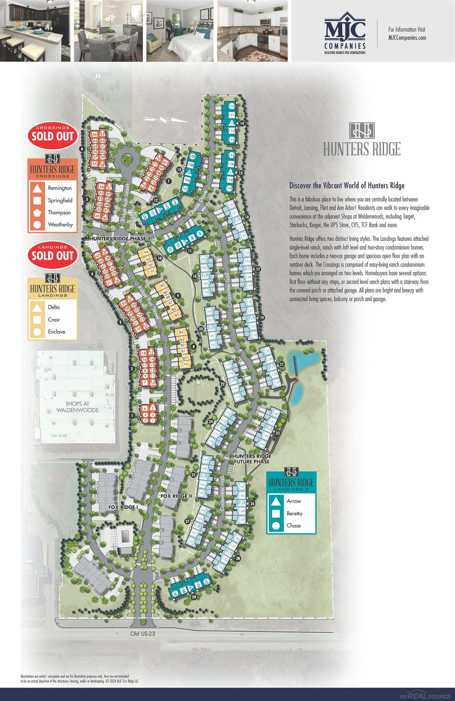 Welcome to Hunters Ridge. Beautiful new 1-1/2 story unit under construction in Hartland. The Arrow--spacious condominium home with 3 bedrooms, 2 baths, powder room, large great room, dining area, kitchen, patio and 2-car attached garage. Kitchen includes stainless steel electric range, dishwasher, disposal, microwave, upgraded cabinets and granite countertops. Owner's suite on the first floor with large walk-in closet and private bath. Two second floor bedrooms and bath. Swing door to the deck is in the great room. Luxury vinyl floor in standard areas. Three-piece rough plumbing.basement. High efficiency furnace and water heater. Programmable thermostat. Convenient access to US-23 and within walking distance to the Shops at Waldenwoods. Equal Housing Opportunity. Photos are a similar home.