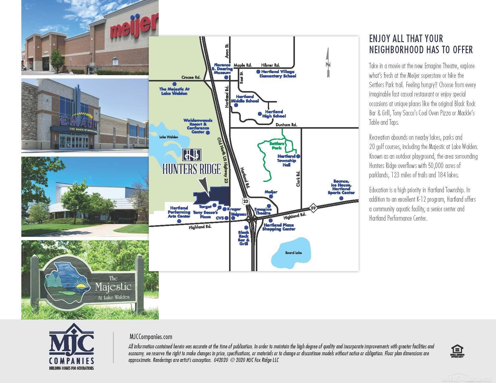 Welcome to Hunters Ridge. Beautiful new 1-1/2 story unit under construction on a premium site in Hartland. The Arrow--spacious condominium home with 3 bedrooms, 2 baths, powder room, large great room, dining area, kitchen, patio, daylight basement with extra tall walls and 2 windows and 2-car attached drywalled and painted garage. Kitchen includes stainless steel range, dishwasher, disposal, microwave, granite countertops and upgraded kitchen faucet. Owner's suite on the first floor with large walk-in closet and private bath. Two second floor bedrooms and bath. Swing door in the great room leads to the deck. Luxury vinyl floor in foyer. Ceiling fan prep and install in great room. Plumbing custom options. Three-piece rough plumbing in basement. High efficiency furnace and water heater. Programmable thermostat. Convenient access to US-23 and within walking distance to the Shops at Waldenwoods. Equal Housing Opportunity. Photos are a similar home.