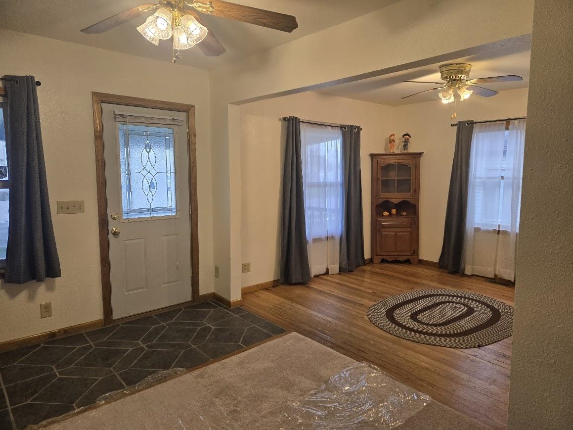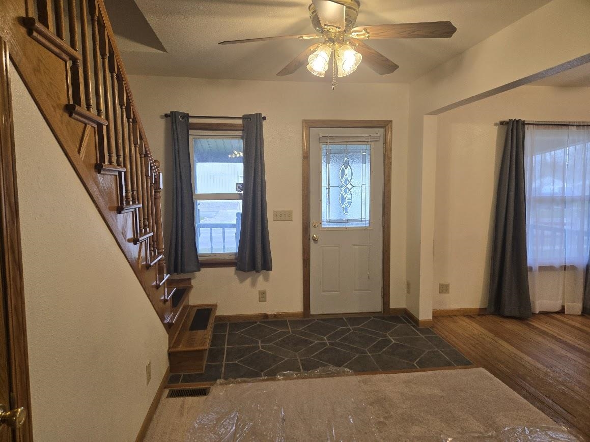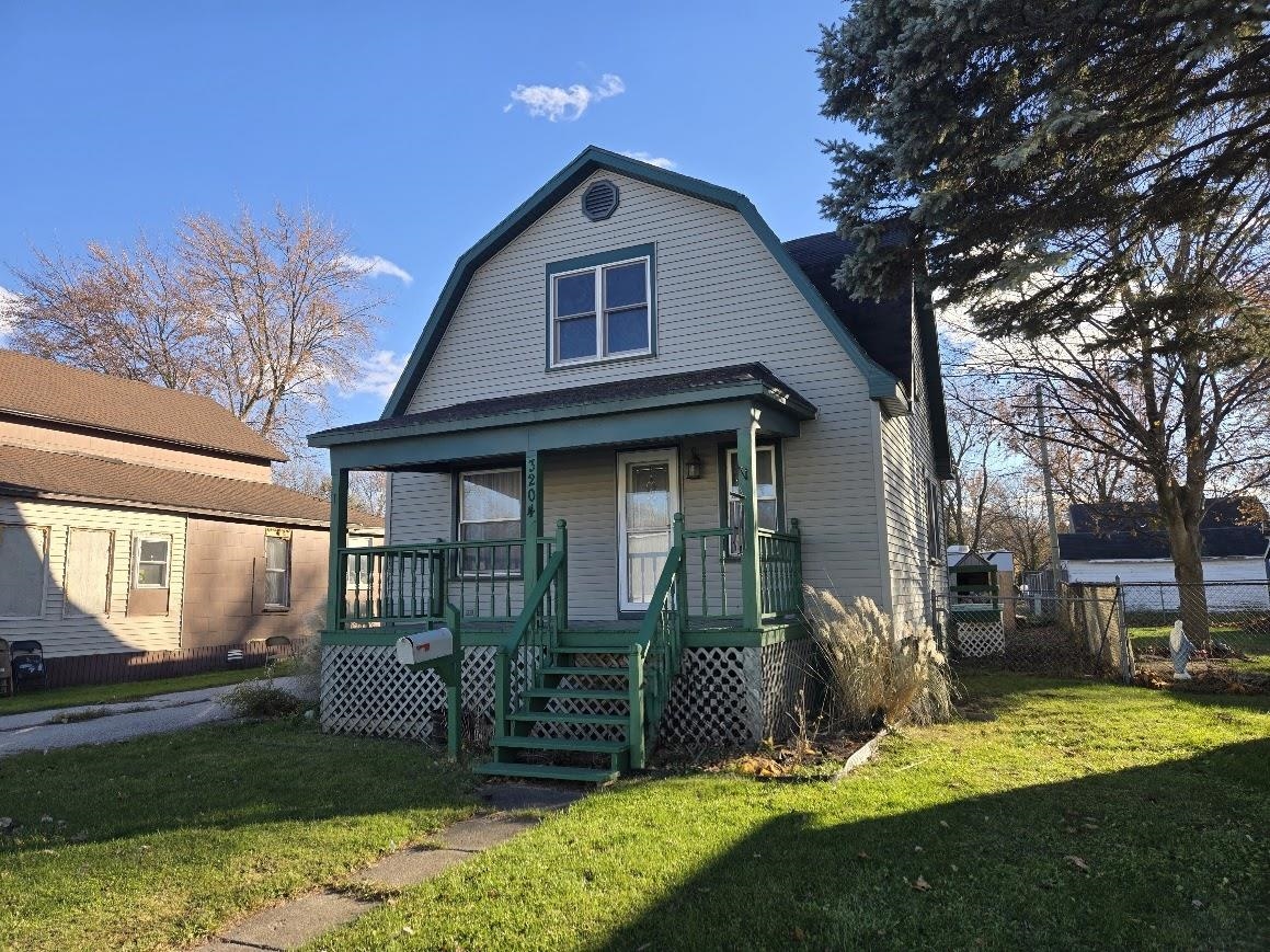 This charming 1910 Dutch Colonial Sears Catalog kit home has undergone a thoughtful renovation, preserving its historic character while incorporating modern conveniences. The foyer showcases ceramic tile and carpeting, perfect for a home office or library. The living room features natural wood flooring, and the dining room flows seamlessly onto a 12' x 16' deck just beyond the patio door. The kitchen boasts ceramic tile counter, backsplash and flooring complemented by generous oak cabinetry. An open oak staircase ascends to two bedrooms and a spacious full bath. A practical back entryway serves as a laundry room, complete with a toilet that can be easily enclosed for convenience. Other features include some newer vinyl windows, a freshly painted basement, and a fenced yard with a shed. Schedule a tour today.
