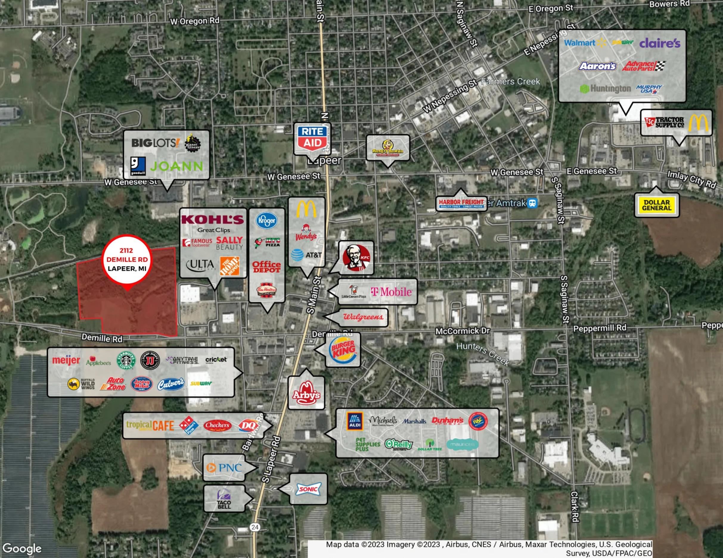 Discover the potential of this exceptional 43-acre property in Lapeer, MI! With Farmer's Creek running through the site, this land is divided into two distinct sections: 20 acres of scenic, park-like land to the north and 23 acres of high, buildable land to the south. Its prime location is nestled near retail giants like Kohl's, Home Depot, NCG Theaters, and Ulta, while directly across the street are Meijer, Applebee's, and the Blind Fish Restaurant. The property’s current zoning is single-family, but the city is ready to rezone to accommodate an array of development opportunities including big box retail, a regional shopping center, or a multi-family project with a natural water feature. Splits into smaller lot sizes are possible, and all utilities, including water, sewer, gas, and electric, are conveniently located at the road. This location is surrounded by amenities, with the Oakdale Trail to the west and Cramton Park to the east, and the city’s plans to link the two trails make it a key spot for a future scenic pathway. Plus, any tax credits associated with donating the 20 acres north of the river will transfer to the buyer, making this an exciting investment with endless possibilities.