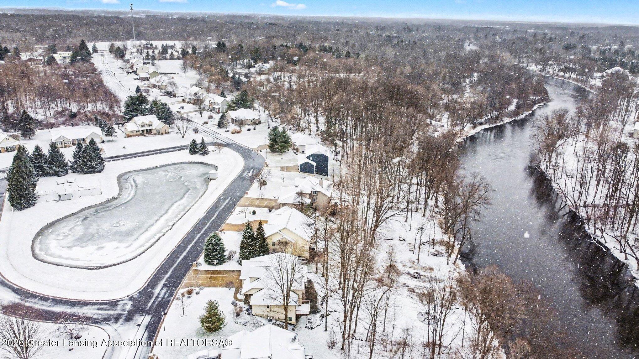 Beautiful 3-bedroom ranch featuring vaulted ceilings and an open floor plan filled with natural light. The home faces a serene community pond with a waterfall, creating a peaceful setting, and also backs to a wooded area with river views and direct river access. The unfinished walkout basement offers a blank canvas for future living space, while the expansive deck is perfect for outdoor entertaining. Located in a quiet, small cul-de-sac community with no through traffic, this home is just minutes from downtown Dimondale.This home is not in a flood zone. Flood insurance is not required.