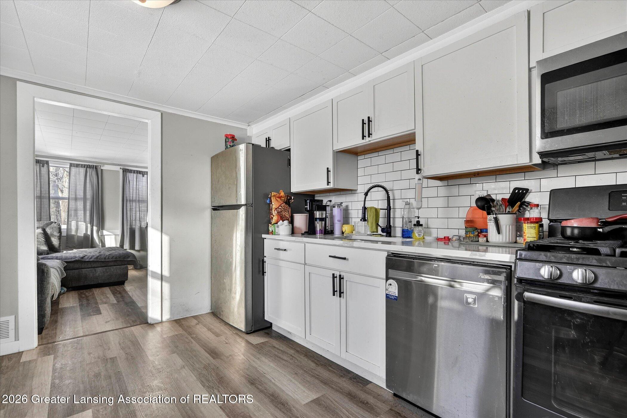 This charming remodeled ranch offers comfortable, practical living in a cozy footprint (about 816 sq ft) with 2 bedrooms and 1 full bathroom. Interior Highlights: Spacious and comfortable living room perfect for everyday living. Bright, updated kitchen featuring stainless steel appliances, quartz countertops, and new cabinetry ideal for modern convenience and easy entertaining. Both bedrooms include vaulted ceilings, and the primary bedroom is large enough to accommodate a king-sized bed. A large laundry room serves as a breezeway connecting the interior to the attached garage great for storage, mudroom space, or a small workshop area. On-demand water heater means you'll never worry about running out of hot water.