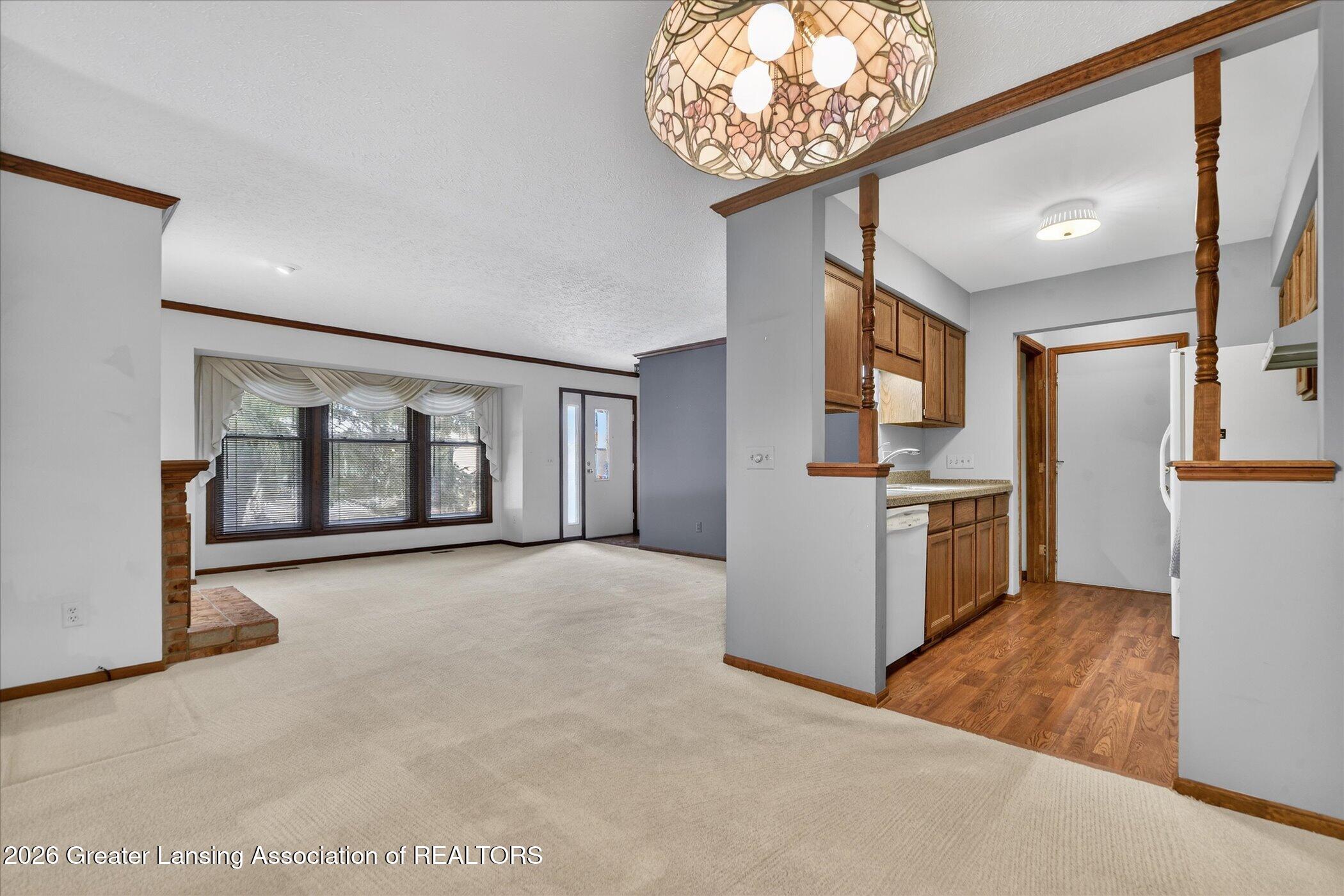 Welcome to Carrier Creek! Step inside to plush carpeting and an inviting open-concept living space. The living room is anchored by a stately brick fireplace and framed by large windows that fill the home with natural light. Just off the living area, a formal dining space offers the perfect setting for gatherings. The kitchen features a convenient pass-through window, making entertaining effortless and keeping everyone connected. The spacious primary bedroom includes a walk-in closet and a private half bath for added comfort. A second bedroom and a full bathroom complete the main level. Downstairs, the finished basement provides a versatile space ideal for a recreation room, family room, or home office. A separate utility area includes laundry and built-in shelving, offering plenty of