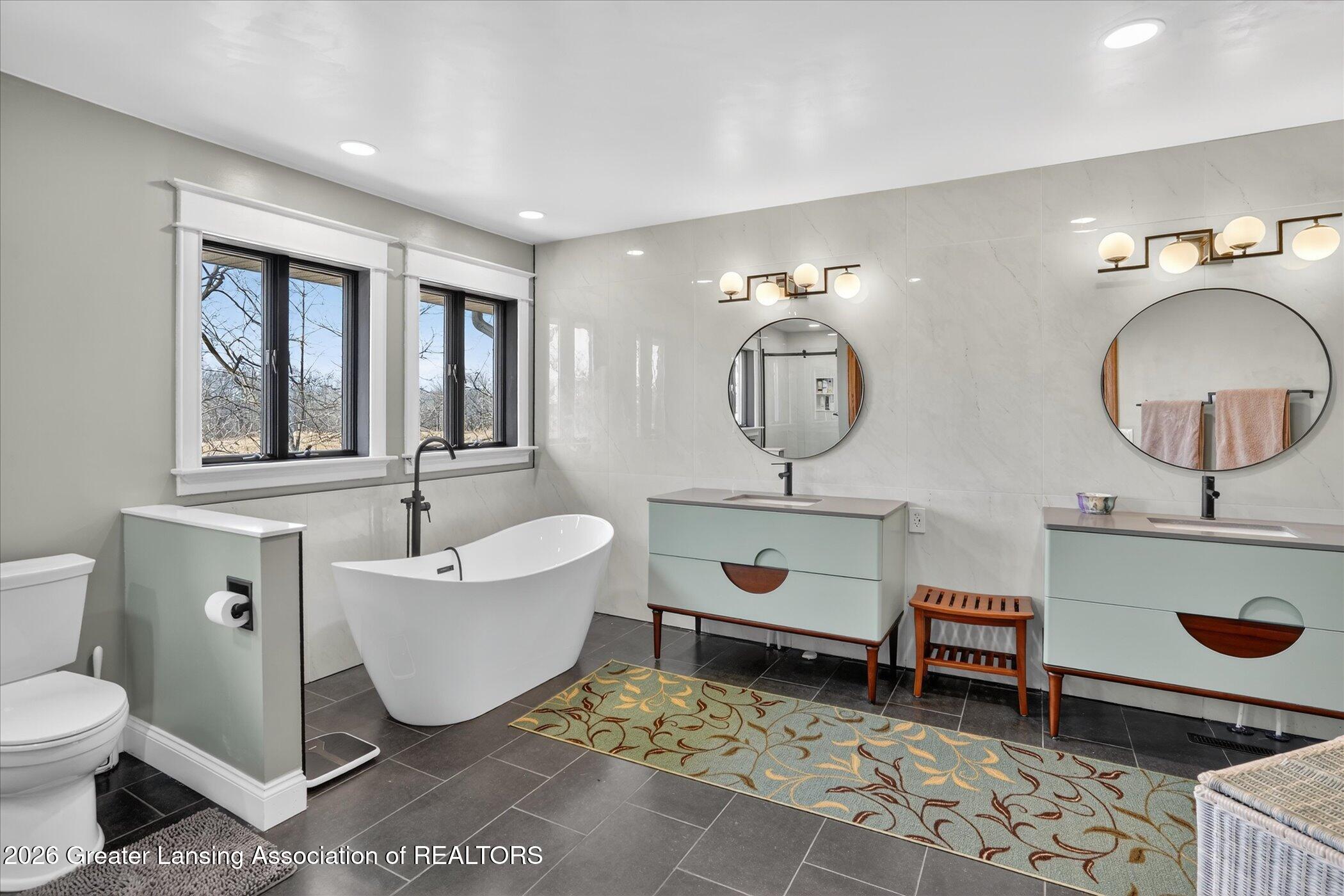 A Truly rare find on over 40 acres in Mason is this beautiful two story home with 5 bedrooms, 4 bathrooms, sprawling room sizes, fantastic views, tons of natural light and a well-appointed gourmet kitchen. On the main level we have 1 bedroom and 1/2 bath that could easily be converted into another primary suite. Cozy up in the family room next to the fireplace or spread out in the beautifully well lit living room. The gourmet kitchen opens up for formal or informal dining and flows right into the sunny 4 season room which offers picturesque views of the property and wildlife and a walkout to the deck. On the 2nd level is the very large primary suite with beautiful views of the front of the property, lots of natural light and the primary bath is stunningly large with double sinks.