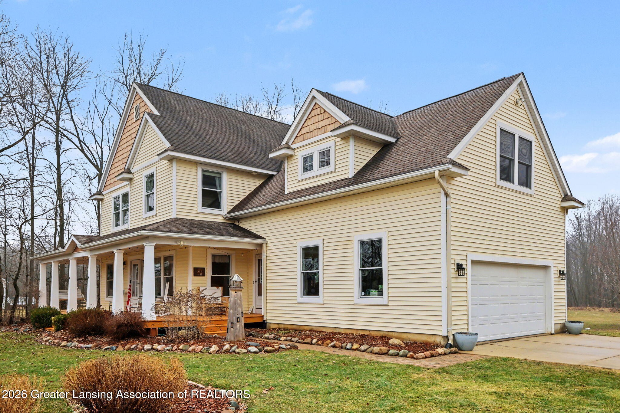 Tucked away on 2.75 scenic acres in Williamston Schools, this charming modern farmhouse offers 2,731 sq. ft. above grade plus nearly 1,000 finished sq. ft. in the walkout lower level. Built in 2005, the home features 5 bedrooms, 4 full baths, a bright, open floor plan, 9-foot ceilings, maple floors, and built-ins. The great room includes a gas fireplace with a stone surround and opens to a gathering kitchen with quartz countertops, stainless steel appliances, and a walk-in pantry. On the second floor there are 4 Bedrooms and 2 full baths, and lower level has a finished walkout level provides additional living space, a 5th bedroom, and a full bath, plus tons of storage. A 22 kW generator, a pool table, and 1 year home warranty are included.
