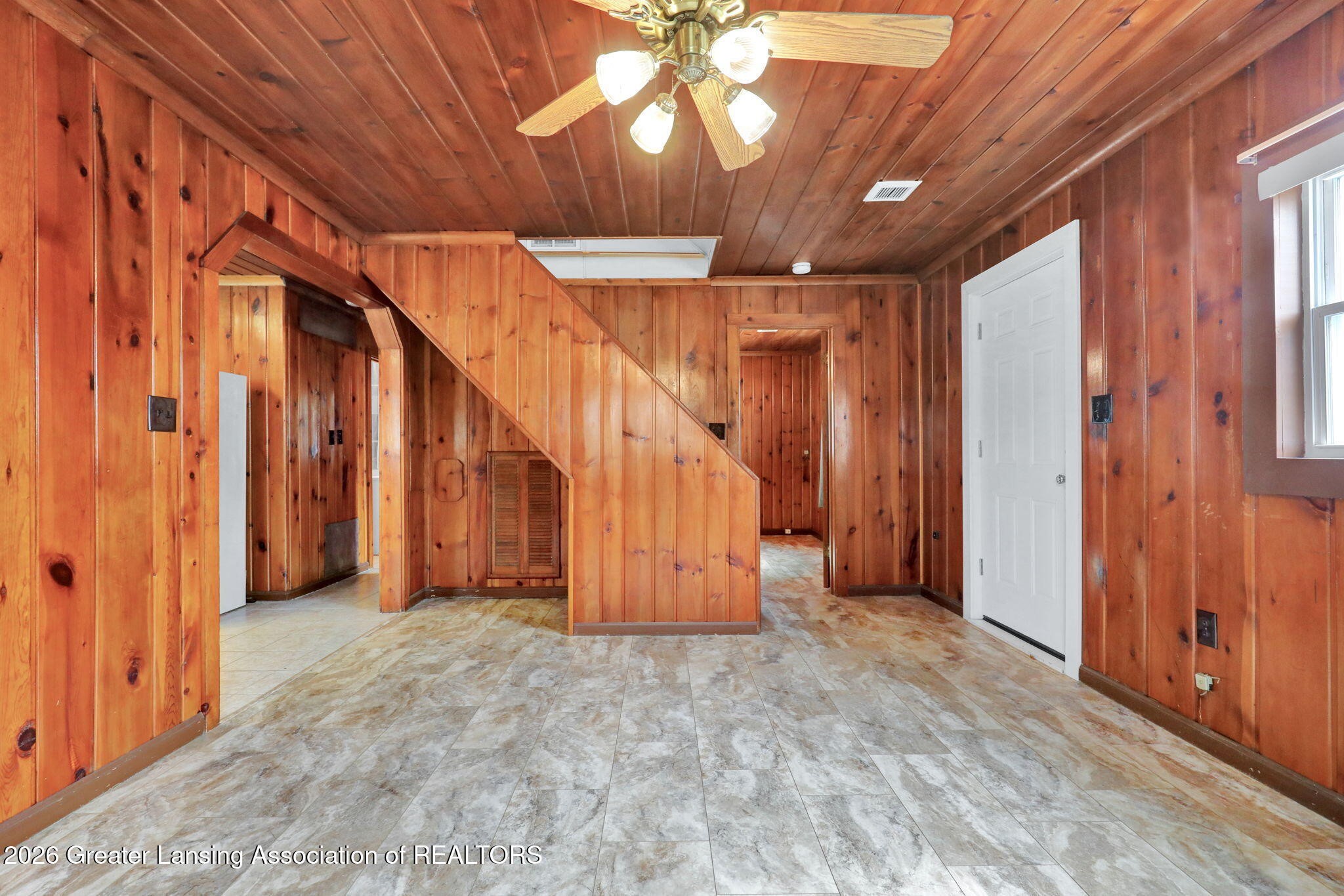 Welcome to Lake Life! This meticulously maintained, two-bedroom, cabin-style bungalow has so much to offer! Ideally located steps from Lake Lansing, across from a park, and minutes from shops & restaurants. The main floor features polished knotty pine walls, primary bedroom, and a welcoming kitchen with plenty of natural light! Upstairs offers a second bedroom & utility room with storage. Major 2021 updates include: Furnace, Central air & duct work; New electrical throughout with a 220v amp panel; Fridge & washer/dryer; LVT floors; Exterior doors; Added insulation between levels & ceiling; and conversion to public water, including new plumbing from the road & throughout the kitchen. Situated on .318 acres, with potential to build or expand. Live, Getaway, Invest--The choice is yours!