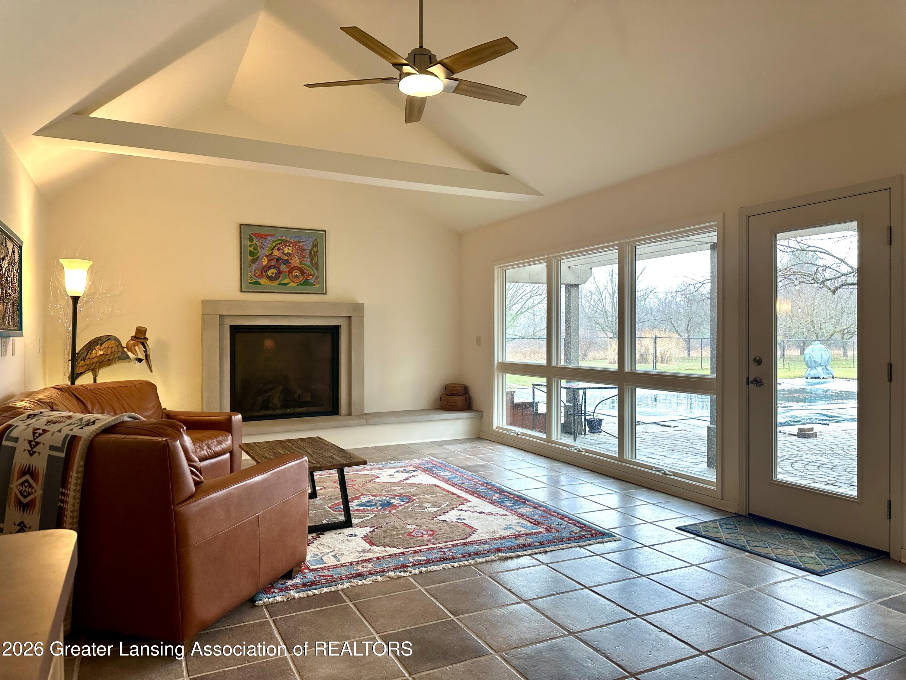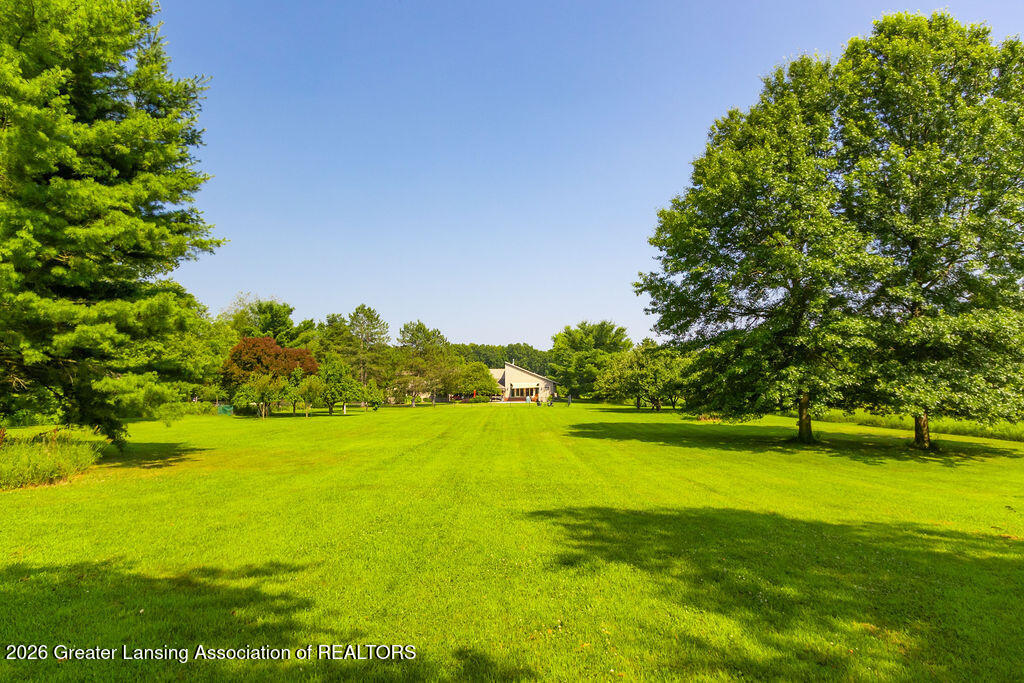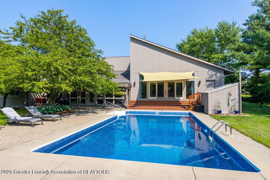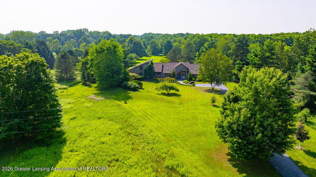 Tucked away on one of Williamston's most desired country roads, this 10-acre estate blends peaceful natural surroundings with expansive living spaces designed for everyday comfort! With 4,433 sq, 5 BRS, and 3.5 Baths, this home is equipped for modern living with impressive efficiency. Warm bamboo floors add natural elegance and comfort. Active solar panels, a generator, and EV charger add modern conveniences. A spacious kitchen includes cherry cabinetry, quartz counters, large island, 2 prep areas, & pantry. Vaulted living room with fireplace and expansive windows overlook & access the patio, heated pool, and sunporch. A 1,500 sq ft addition provides endless possibilities and impressive flexibility, including guest, office and entertainment space, while accessing the outdoor pool & views.