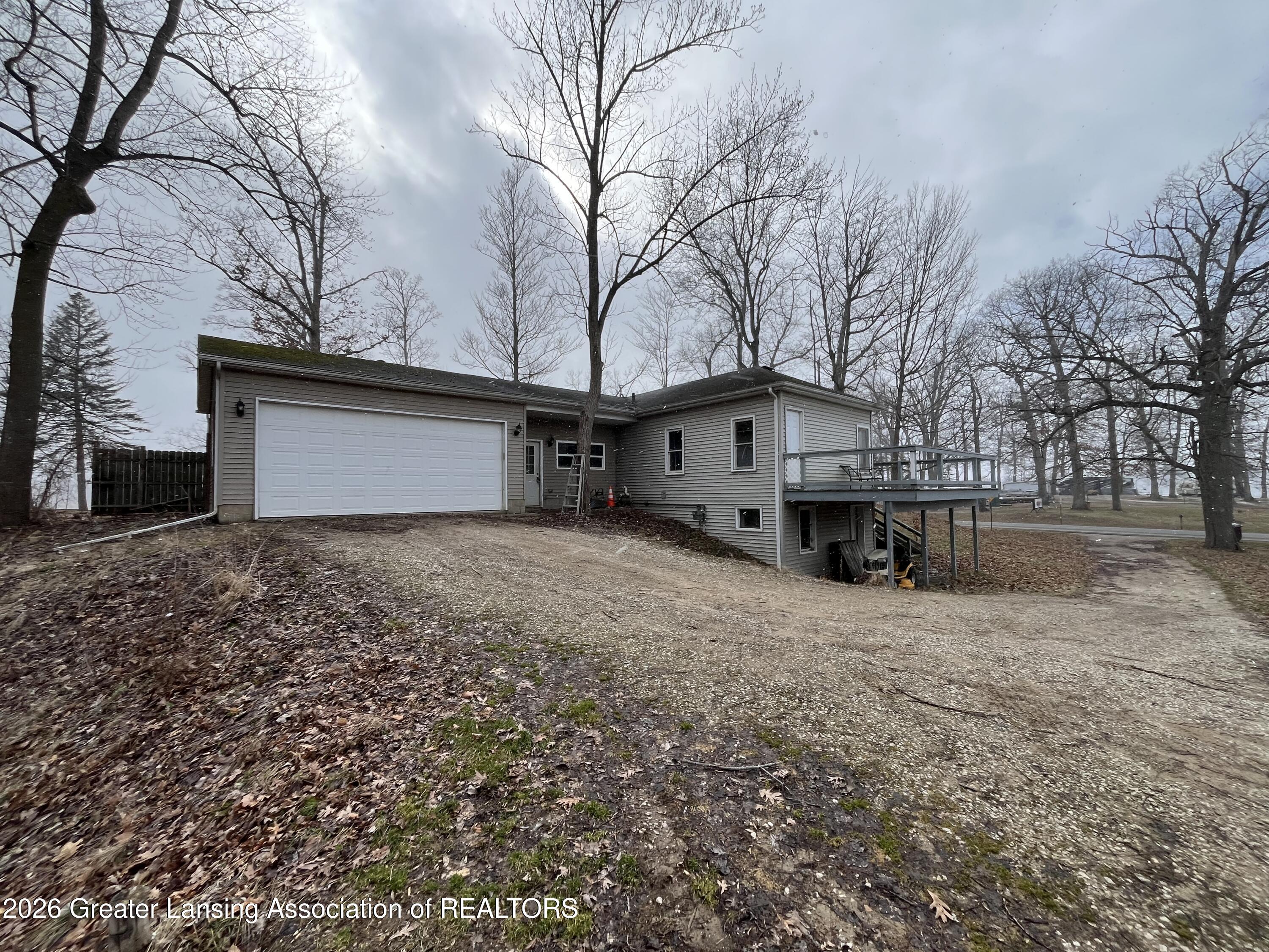 Charming 2-bedroom, 1-bath ranch just steps from beautiful Pine Lake! Situated on a large lot, this home features an oversized attached garage with space for two vehicles plus room for a workshop or all your lake toys. Enjoy an open floor plan with multiple lake views and a spacious deck perfect for relaxing or entertaining. The partially finished walkout basement offers additional living space and potential. Conveniently located near the public boat launch on Baseline Rd for easy water access, and just minutes from the University of Olivet. Ideal for year-round living or a peaceful getaway!