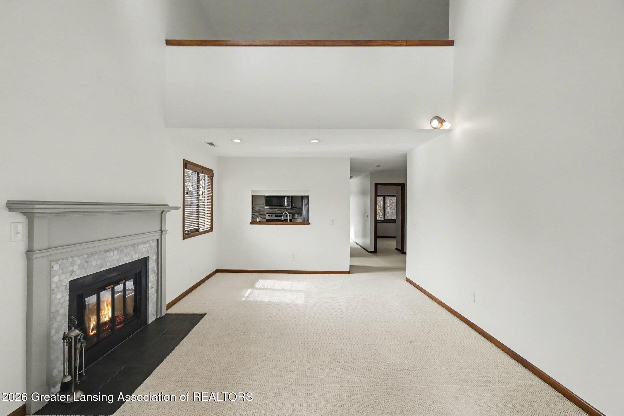 Welcome to one of the sharpest, most impeccably maintained condos in all of Wildwood Lakes, where every single inch reflects true pride of ownership and meticulous attention to detail. This is the definition of move-in ready nothing to fix, nothing to update, not a single detail overlooked. From the moment you step inside, you're greeted by a light-filled, welcoming interior that feels both stylish and comfortable. Vaulted ceilings and beautiful finishes throughout create an ideal setting for everyday effortless living. The inviting living room showcases a real wood-burning fireplace with a custom mantel and marble surround, adding warmth and character. Step outside to your private balcony with tranquil wooded views via a newer triple-panel slider.