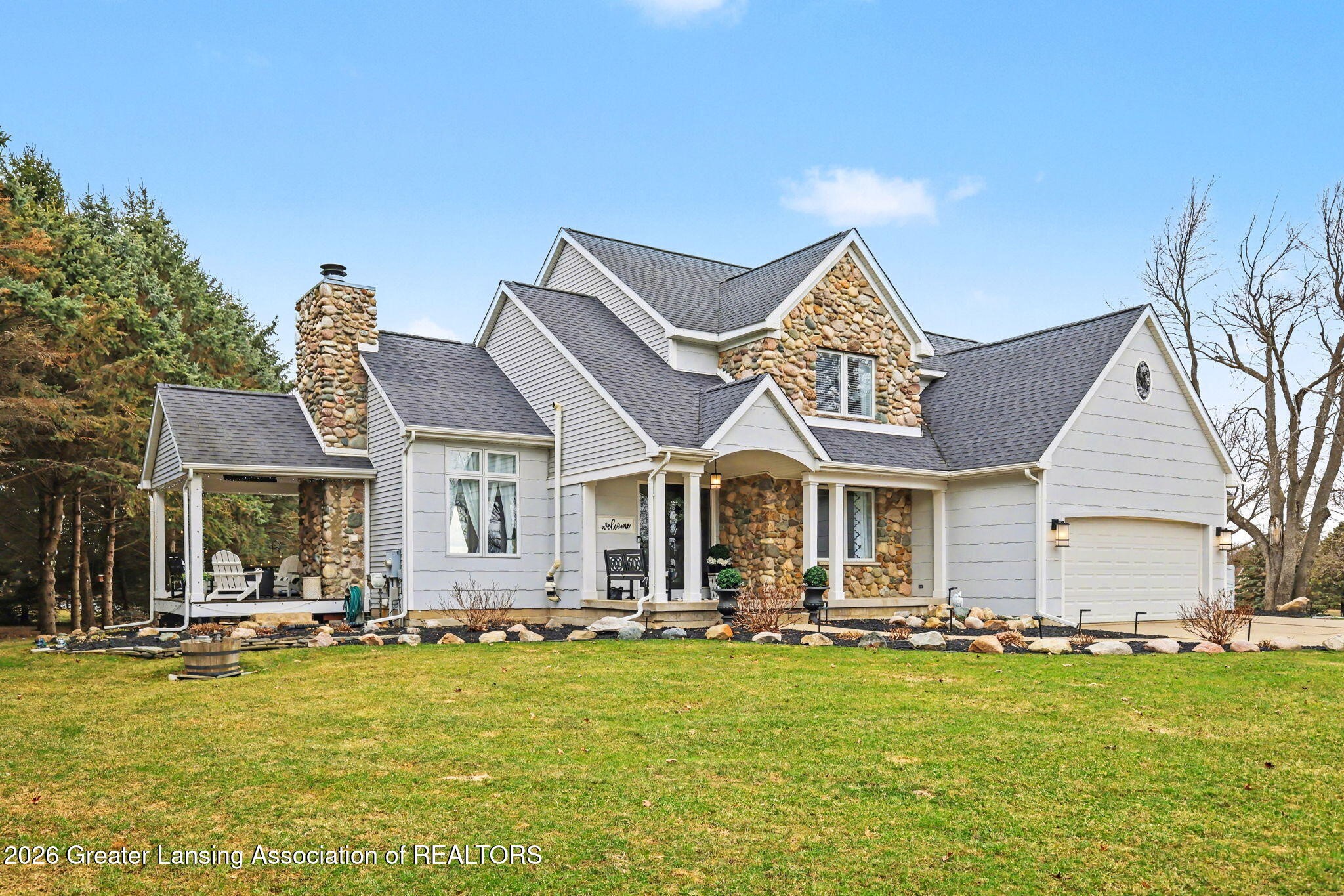 8573 W Lakeshore Dr... is a SHORE thing, where every day ends with a better view! Live your best life on the water at Scenic Lake in Laingsburg, one of Greater Lansing's few highly sought-after all-sports lakes. Enjoy year-round lake living across approximately 150 acres, with a private, tranquil lifestyle for those lucky enough to call it home. Set on 1.7 acres, this property offers the perfect blend of Craftsman charm and modern updates. Step inside the great room, where you'll immediately notice vaulted ceilings, exposed beams, and a stunning stone fireplace. The space feels open, warm, and inviting all at once. Natural light fills the room and beautifully frames your view, and your life...on the water. Just outside, the covered pergola is the perfect spot for morning coffee or