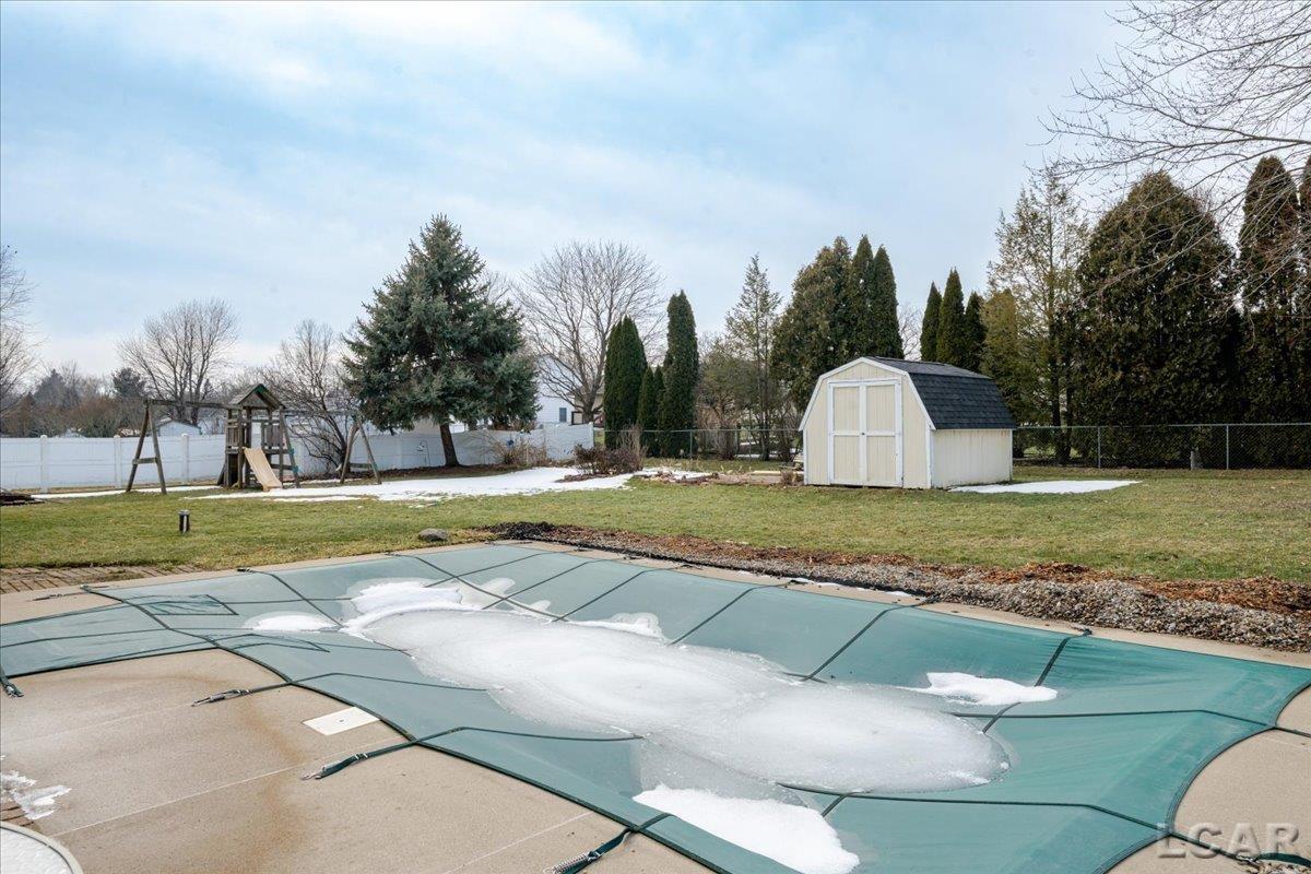 Immediate Occupancy! Welcome home to this beautiful property in Adrian Township, where modern updates, everyday comfort, and outdoor living blend seamlessly! Nestled in a quiet neighborhood with desirable township taxes, this move in ready property offers peaceful surroundings while remaining conveniently close to town amenities. Step outside and enjoy your own backyard retreat! Enjoy summer in your fully functional in ground pool, featuring a newer filtration system (replaced within the last two years). The fenced backyard offers mature trees, beautiful landscaping, a garden area, and a culvert drainage system to direct water away from the home. Inside, you’ll find thoughtful updates throughout. All three full bathrooms feature brand new ceramic tile, while the kitchen shines with modern countertops installed just months ago. New water softener system is also included. The spacious main floor offers a large kitchen and dining area perfect for gatherings, a comfortable family living room, and an additional formal living space. A conveniently located laundry room and full bathroom sit just off the pool area, ideal for summer entertaining. Upstairs, the generous primary suite includes a walk in closet and private full bath. Two additional large bedrooms with ample closet space share another full bathroom located directly at the top of the stairs, perfect for children or guests. The fully finished basement expands your living space even further, featuring a half bath, a large living area, a potential fourth bedroom with closet space, and a sizable utility room. This well maintained, beautifully updated home offers space, functionality, and outdoor enjoyment, all ready for your family to move in and start making memories. Don’t miss this opportunity to call it your own!