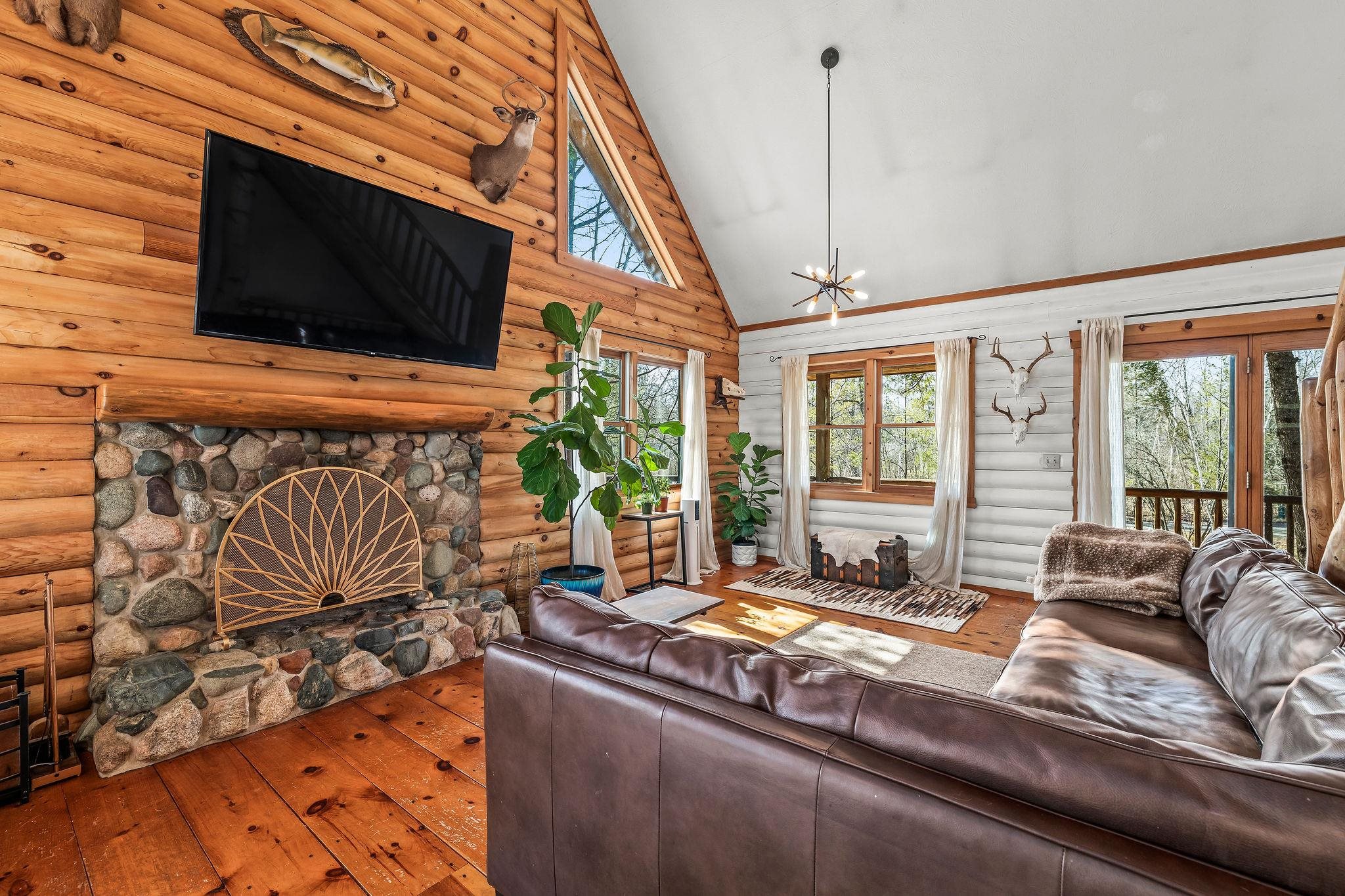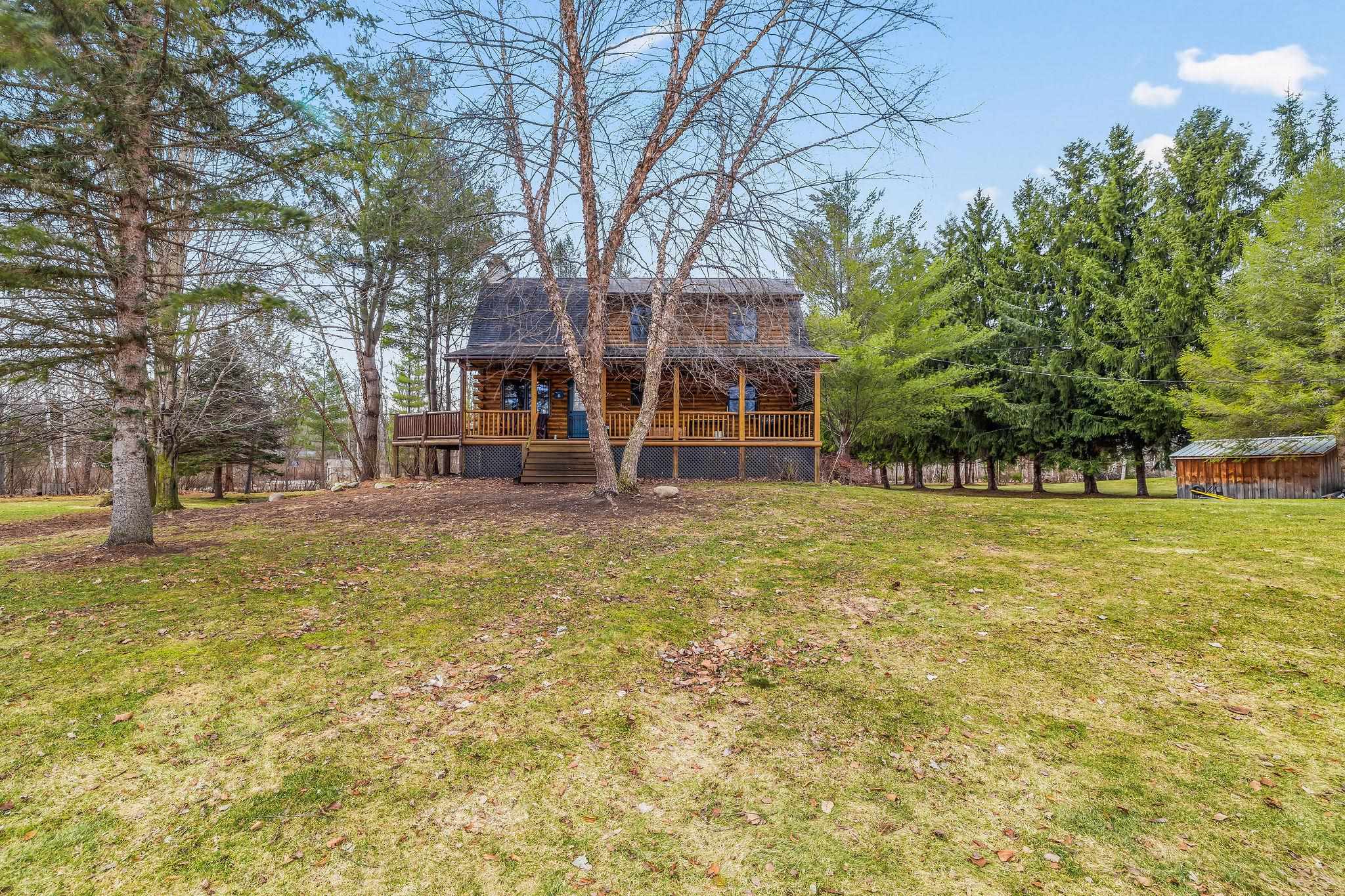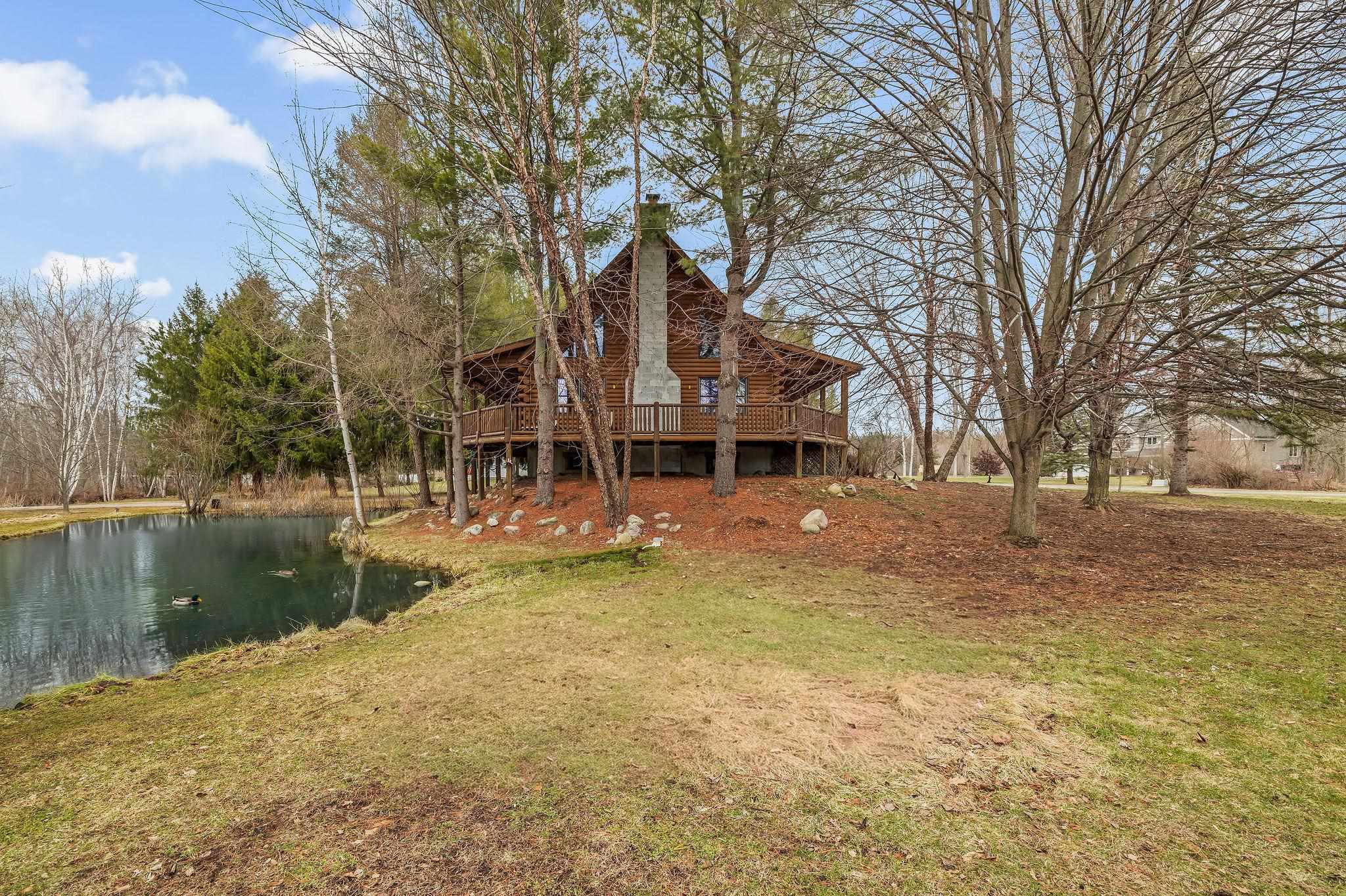 Discover your own private log cabin retreat. Set on a peaceful one-acre lot with a stunning artesian well fed pond and over 900 sq ft of wrap-around porch to enjoy it all. This home blends rustic charm with modern comfort in a quiet subdivision that feels wonderfully secluded. Inside, the main floor features an open-concept kitchen and family room with a wood-burning fireplace, plus two bedrooms and a full bath. The loft offers a cozy sitting area leading to the spacious primary suite with a large private bathroom, jacuzzi tub, and separate shower. The lower level adds flexible living space with a family room and a bonus room perfect for an office, guest room, or hobby area. All of this is located less than a mile from Deerfield Nature Park and just 6 miles from Mt. Pleasant, giving you the perfect balance of nature and convenience. A rare opportunity for buyers seeking privacy, character, and a unique setting.