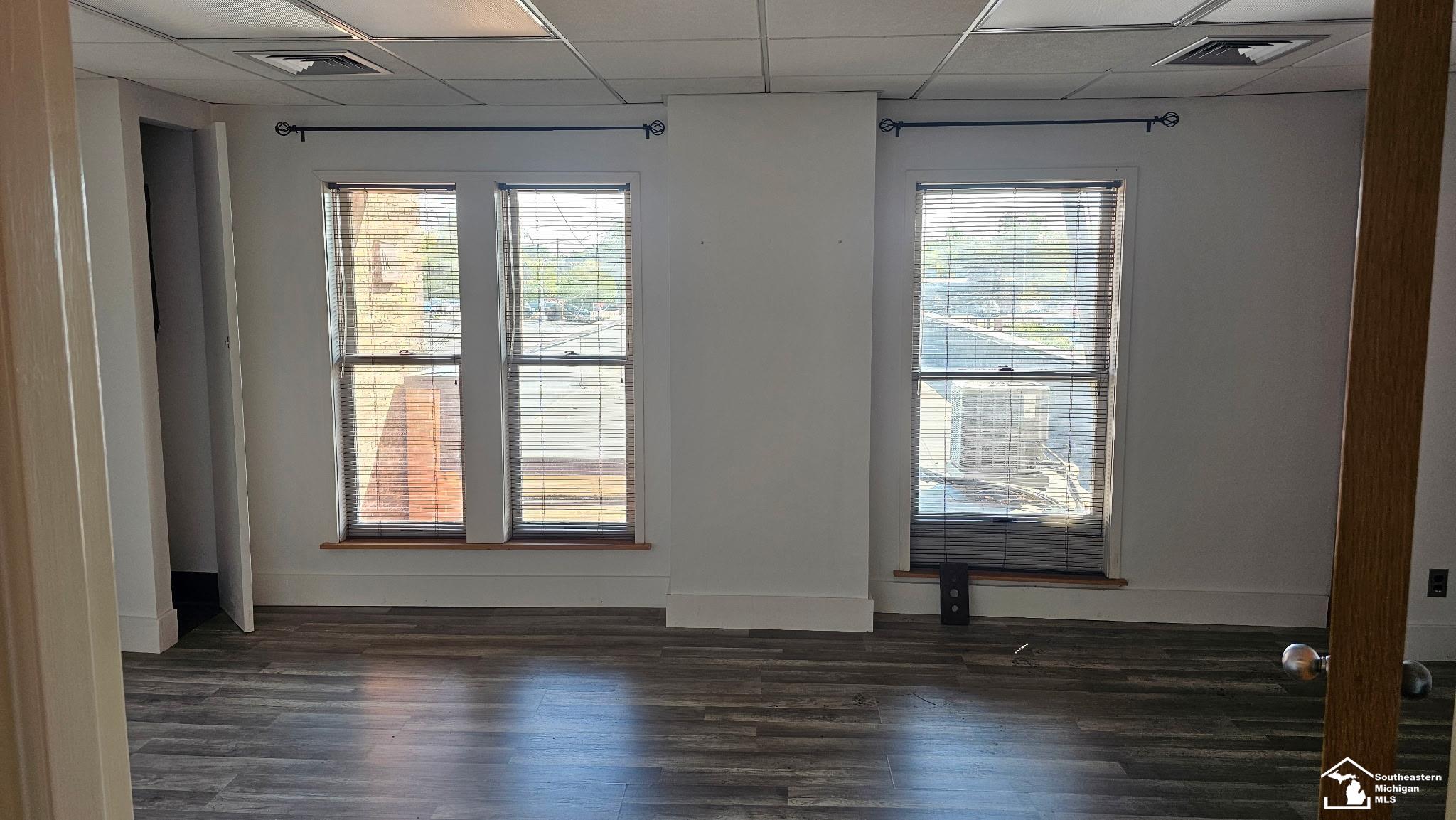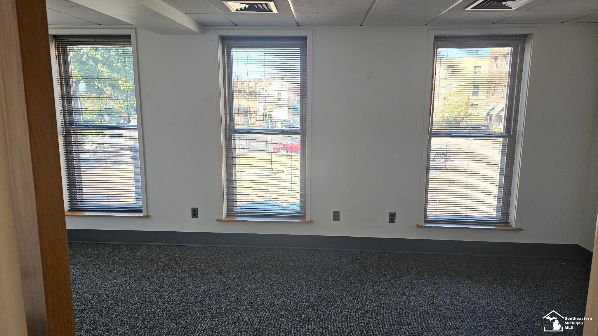 Prime Second-Floor Commercial/Office Space Available Location: Located on a vibrant street, the property is situated on the second floor of a charming, historic two-story brick building (highlighted in yellow in the exterior photo). It is flanked by other established commercial buildings, offering excellent visibility and a dynamic downtown presence. Space Details: Size & Layout: The unit includes multiple distinct rooms, suitable for private offices, a large open-concept workspace, or a combination of both. Room 1: Features dark speckled carpeting, white walls, and a modern drop ceiling. It includes three tall windows with blinds overlooking the street and surrounding buildings, offering abundant natural light and an urban view. Room 2: Features modern dark wood-look plank flooring. It has two sets of windows (one pair and one single) separated by a column, also featuring blinds and views to the outside. Additional Space: A smaller room/area with carpeting and a door leading to the Lavatory. Amenities: Kitchenette/Wet Bar: A dedicated area with dark, distressed-look base cabinets, a countertop with a stainless steel sink, a tiled white-brick-look backsplash, and two wooden floating shelves above. Restroom: A private restroom featuring toilet, a corner sink vanity with gray cabinets, and dark wood-look plank flooring. Access: Access to the second-floor unit is via a straight, internal staircase with dark speckled carpeting and a wooden handrail. The unit entrance is a light wood door with a peep hole, a metal door closer, and a small rug on the threshold. Key Features: Excellent Natural Light: Multiple tall windows throughout the main workspaces provide bright, welcoming environments. Mix of Flooring: Offers a professional mix of durable speckled commercial carpet and attractive modern plank flooring. Move-In Ready: Freshly painted white walls and updated fixtures make the space ready for immediate occupancy. Historic Charm: Situated in a classic brick downtown building, offering a unique and appealing aesthetic. Ideal For: Professional offices, creative studio space, or small business headquarters, seeking a prominent downtown address.