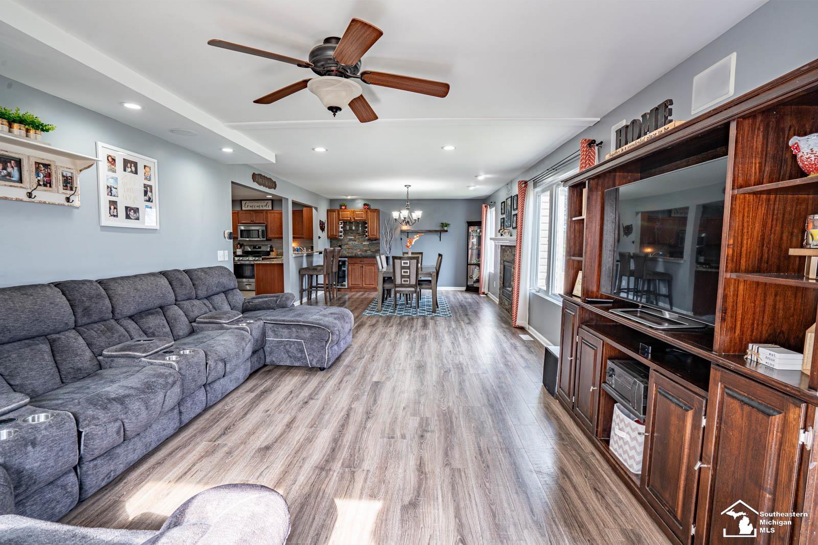 Welcome to this beautifully maintained 4-bedroom, 2.5-bath home located in the highly desirable Golf Ridge subdivision! Designed with both comfort and entertaining in mind, this home features an open-concept layout that seamlessly connects the kitchen, dining, and living spaces. The kitchen is a standout with stainless steel appliances, granite countertops, tile flooring, and a custom bar-height counter—perfect for casual meals or gathering with guests. The dining area offers a cozy gas fireplace along with a built-in wine bar and fridge, creating an ideal space for hosting. From there, step into the spacious family room, which overlooks the deck and fully vinyl-fenced backyard. The primary suite is a true retreat, featuring a walk-in closet with a custom organization system, a beautifully tiled shower, and a stylish herringbone-pattern shiplap accent wall. Three additional generously sized bedrooms share a large full bath with double sinks and granite countertops. Additional highlights include a dedicated den/office, perfect for working from home, and a partially finished basement offering plenty of space for entertaining or watching the big game. Don’t miss your opportunity to own this move-in-ready home in one of the Dundee’s most sought-after neighborhoods!