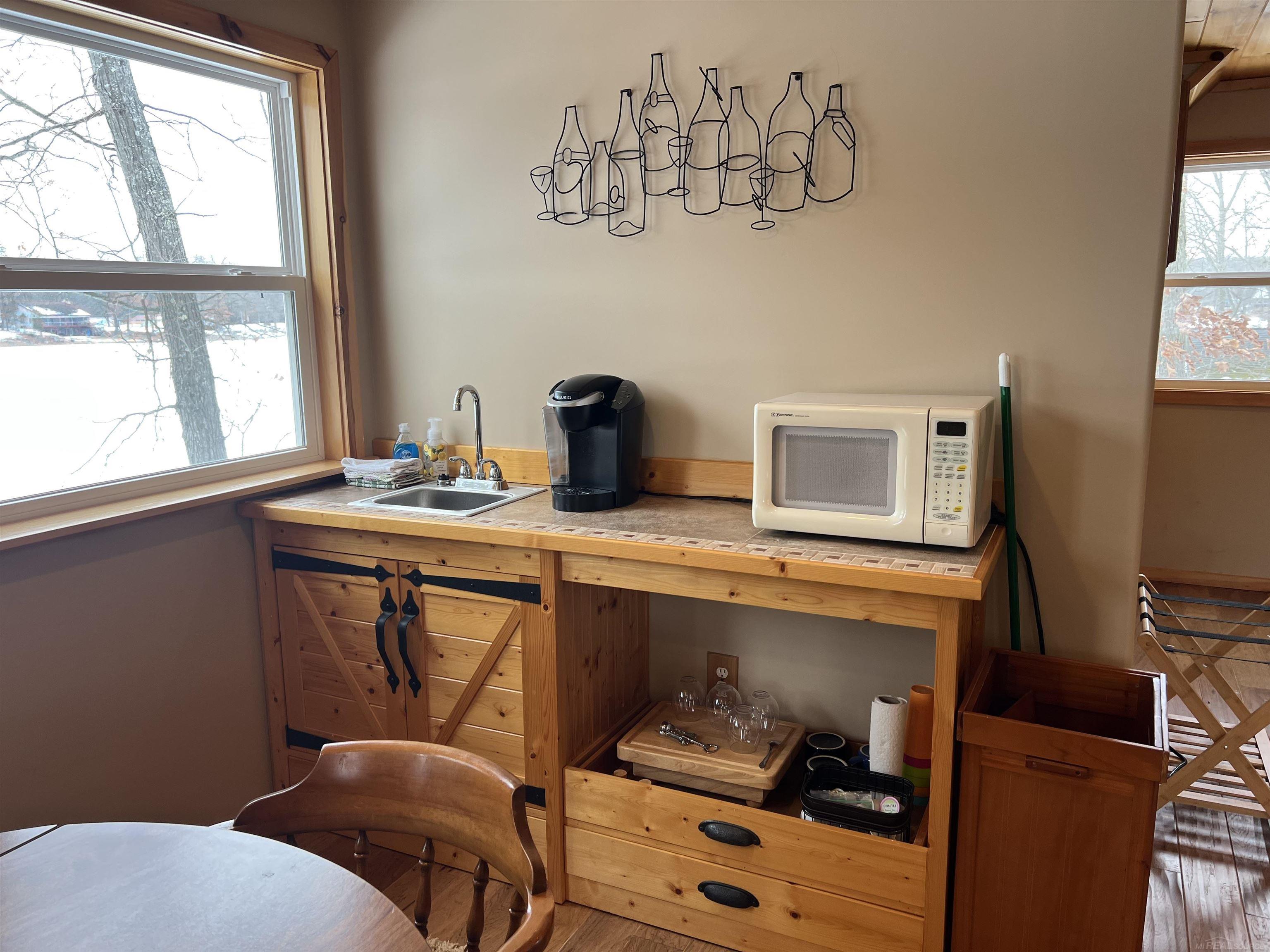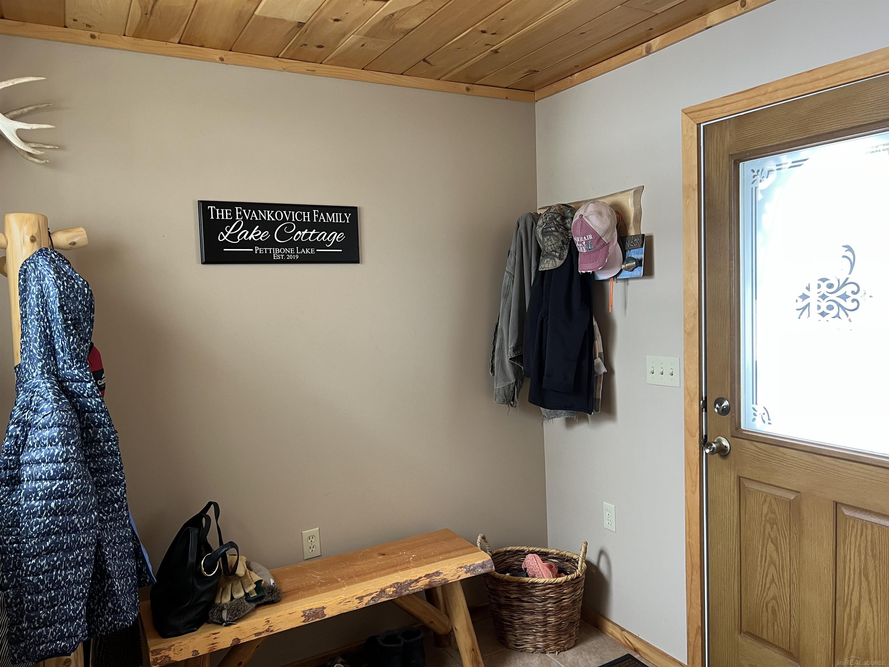 This classic Pettibone Lake cottage offers 190 feet of lake frontage and features 2 bedrooms and 1 bathroom. Above the detached garage is a spacious loft with its own bathroom, currently used as a guest house. Pettibone Lake is an all-sports lake covering approximately 45 acres with depths up to 40 feet. All-sport hours are limited to 10:00 a.m. to 6:30 p.m., and the lake is generally known for its peaceful atmosphere. The cottage has been well maintained and updated over the years. Hardwood floors, earth tones, and knotty pine accents create a true lake-cabin feel. A wall of lakeside windows offers panoramic water views, and a sliding glass door opens to a large elevated deck overlooking the lake. At the water’s edge, you’ll find a landscaped firepit area, storage space beneath the deck, and access to the basement, which houses the utility room. The frontage includes a mostly sandy beach and lake bottom, with a smaller section of natural shoreline. The detached garage measures 28x32 with 10-foot doors and features a full-length covered porch on the lakeside, offering elevated views protected from the weather. Above the garage, the 28x32 private loft includes a three-quarter bath and a small wet bar—perfect for guests or additional living space.