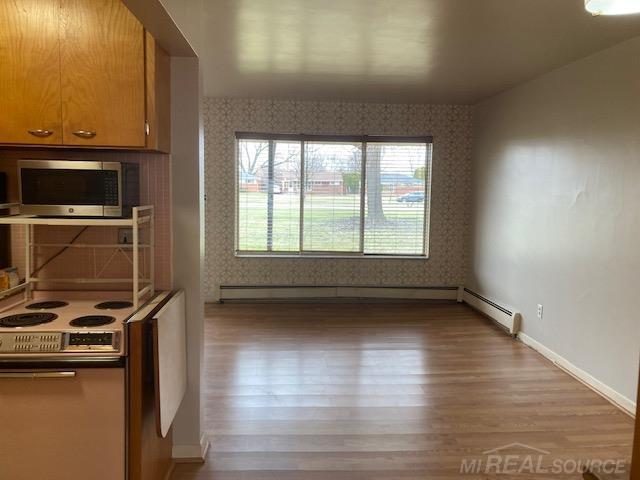 Welcome to this charming 1-bedroom,1-bath ranch-style co-op in the heart of Eastpointe! This cozy, move-in-ready home features an inviting living room with wood style flooring, a kitchen that flows into the dining area, and a spacious bedroom with a full bath designed for functionality Enjoy peace of mind with a low monthly association fee that covers taxes, water, heat, common area insurance, exterior and grounds maintenance, trash, and snow removal, plus access to on-site laundry facilities, assigned parking, and secure storage. . This quiet, well-maintained 55+ senior co-op requires owner-occupancy and board approval with a $60 background and credit check; no pets are permitted.