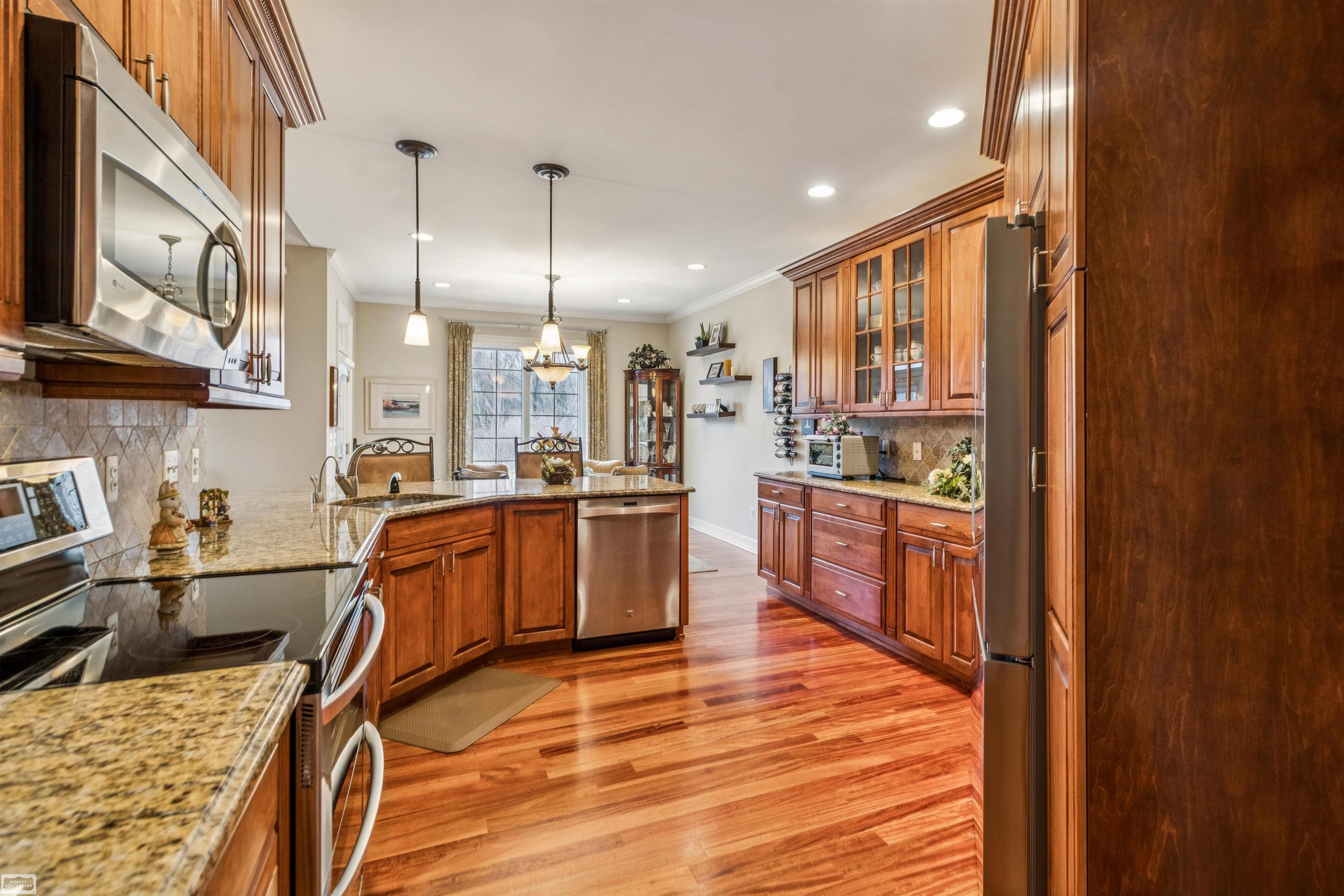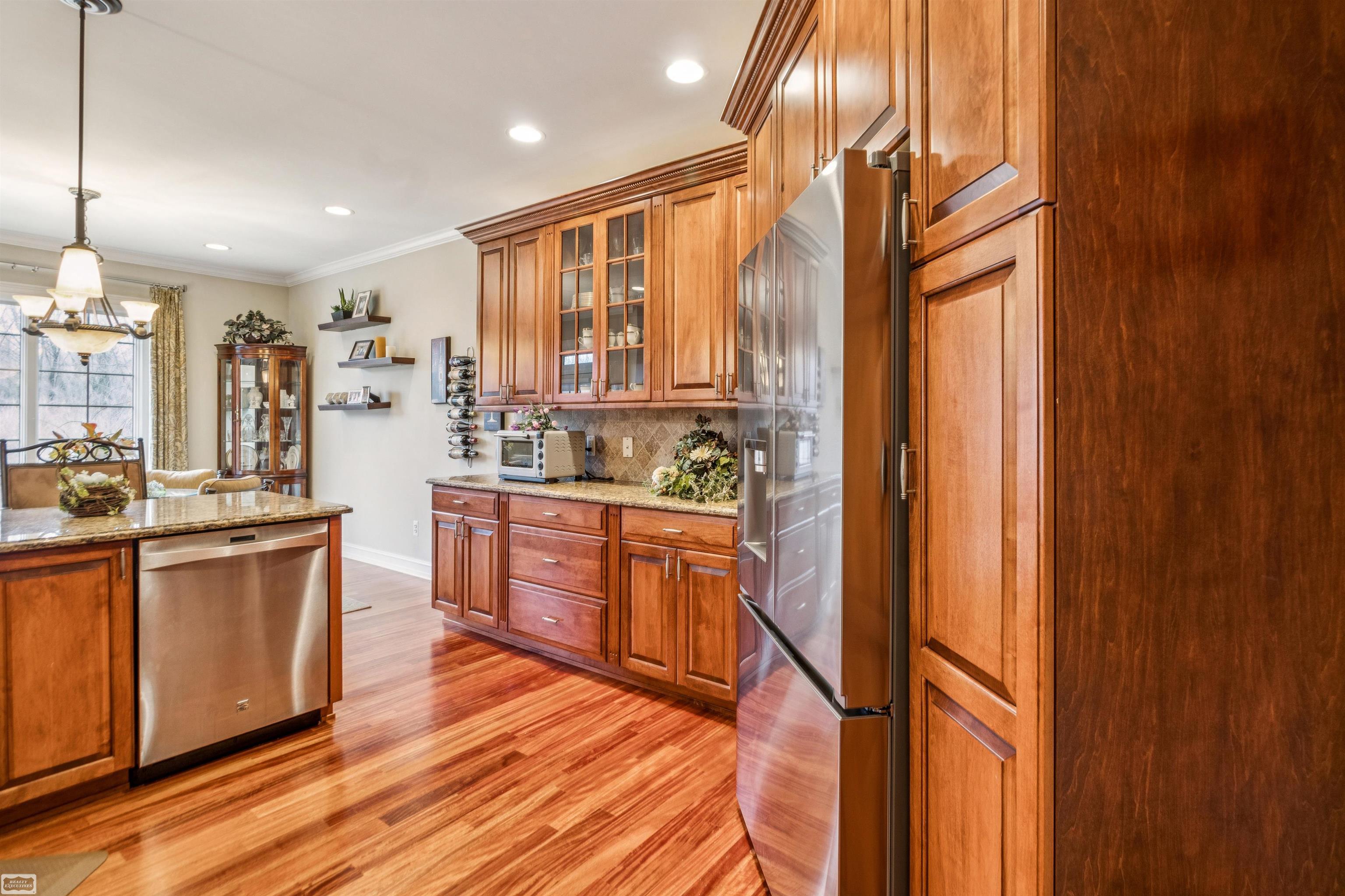 Stunning Custom 2,300 Sq Ft Split Ranch in a Prime Setting! This beautifully designed split-ranch home showcases high-end finishes and an open, airy floor plan throughout. The gourmet kitchen features Lafata 42-inch custom natural cherry cabinetry, granite countertops, and rich Brazilian cherry hardwood flooring that flows seamlessly through the main living areas. Enjoy the spacious great room with a cozy fireplace, vaulted celings and expansive windows overlooking a serene, wooded backdrop—perfect for both relaxing and entertaining. A large den with built-in cabinetry offers the ideal space for a home office or flex room, while the impressive foyer creates a warm and inviting first impression. The private primary suite is a true retreat, complete with a luxurious en-suite bath featuring a walk-in shower, jetted tub, and generous his-and-hers walk-in closets. Two additional bedrooms offer ample space and large closets 10 ft ceilings though out. The home also boasts a full, open basement with 10-foot ceilings and daylight windows, providing endless possibilities for finishing or storage. Additional upgrades include a whole-house generator and a 75-gallon hot water tank and back up sump pump. Step outside through the door wall to a beautifully landscaped yard backing to a peaceful 17-acre park, offering privacy and scenic views. A stunning paver patio creates the perfect setting for outdoor gatherings. A perfect blend of comfort, style, and location is only minutes from Down town New Baltimore restaurants and beach. —this exceptional home is a must-see!