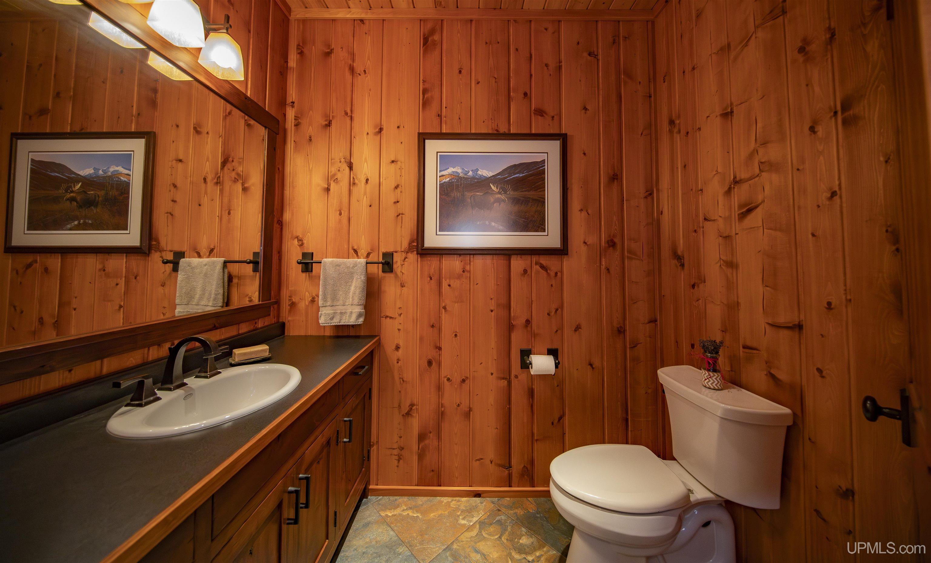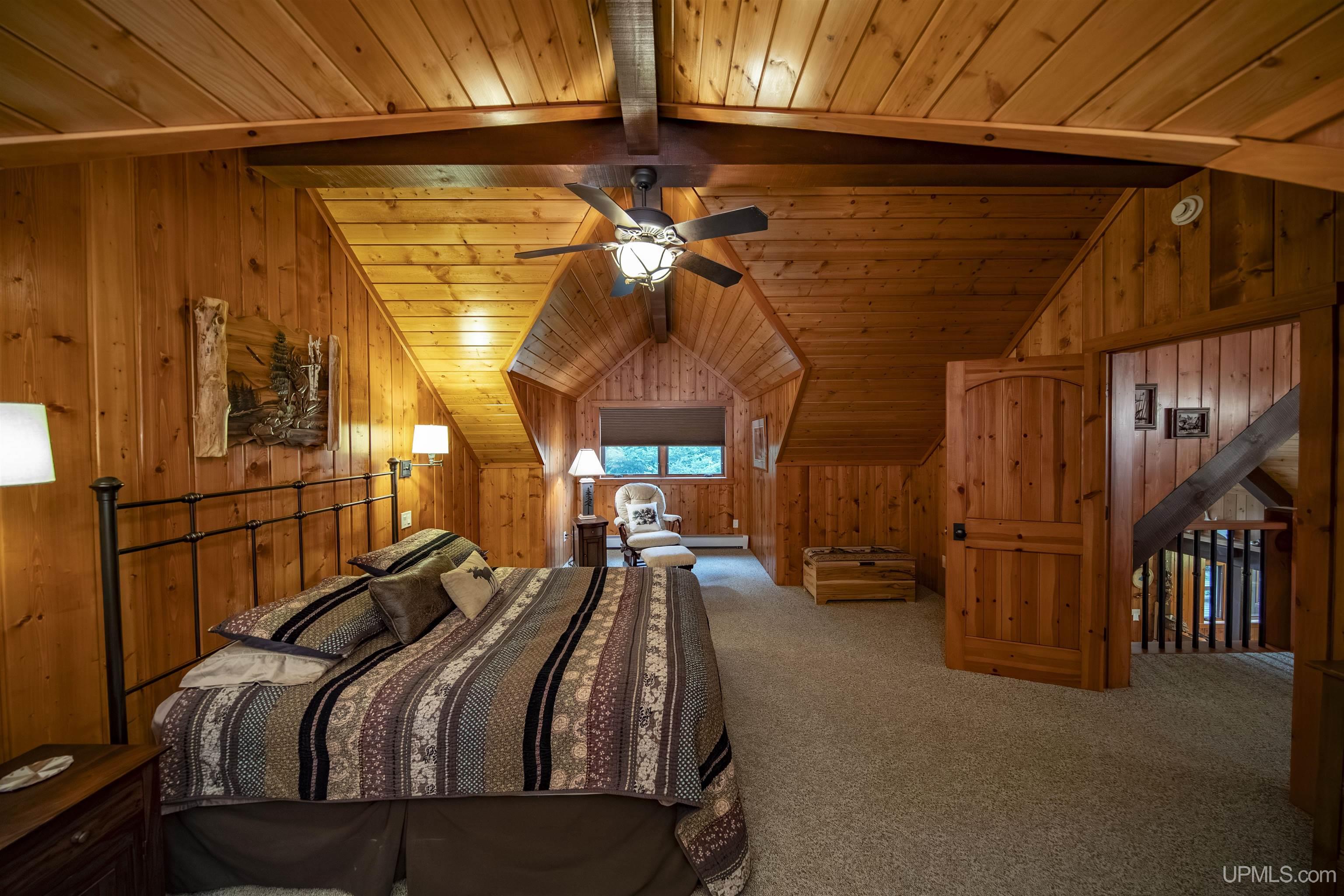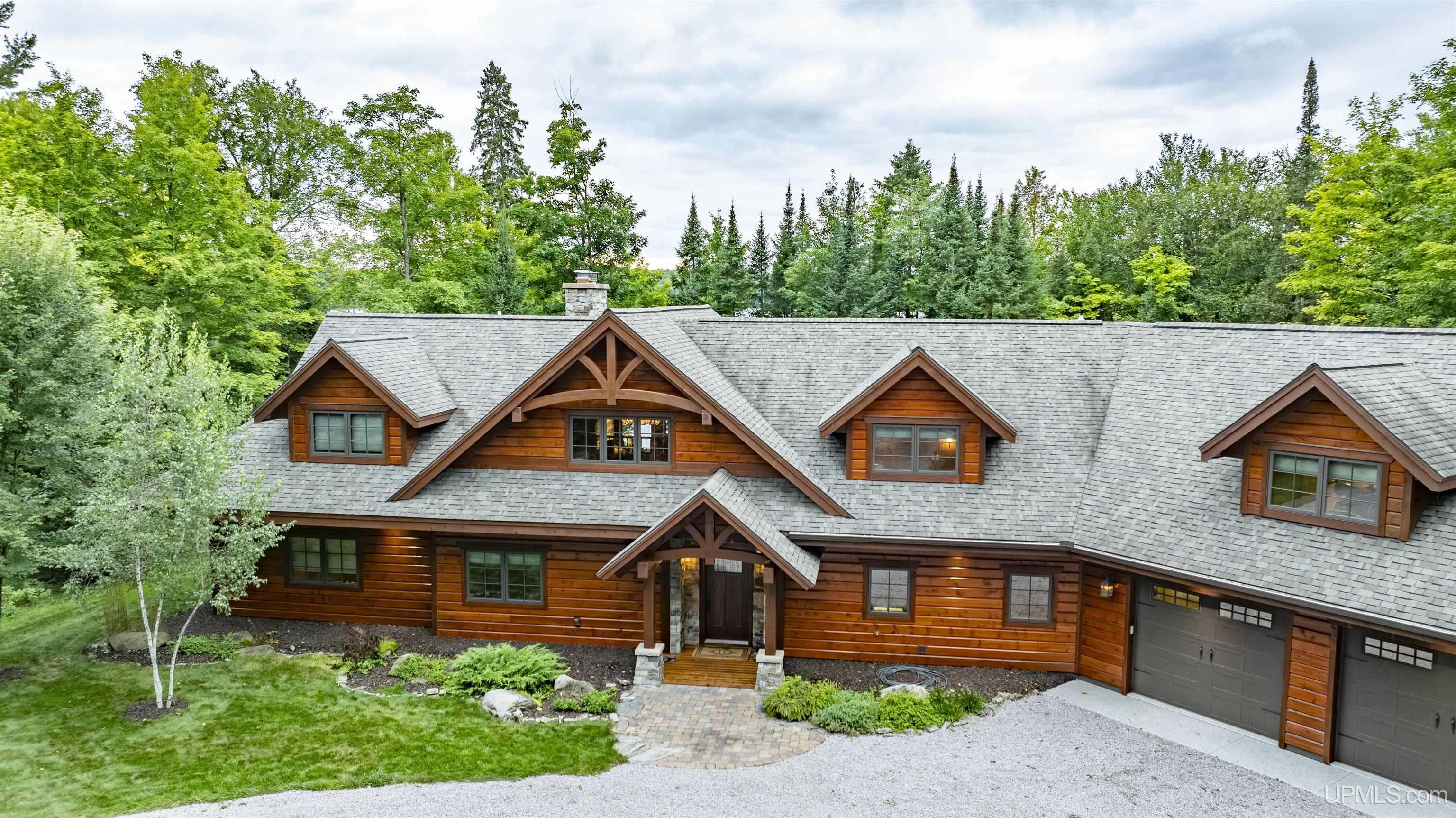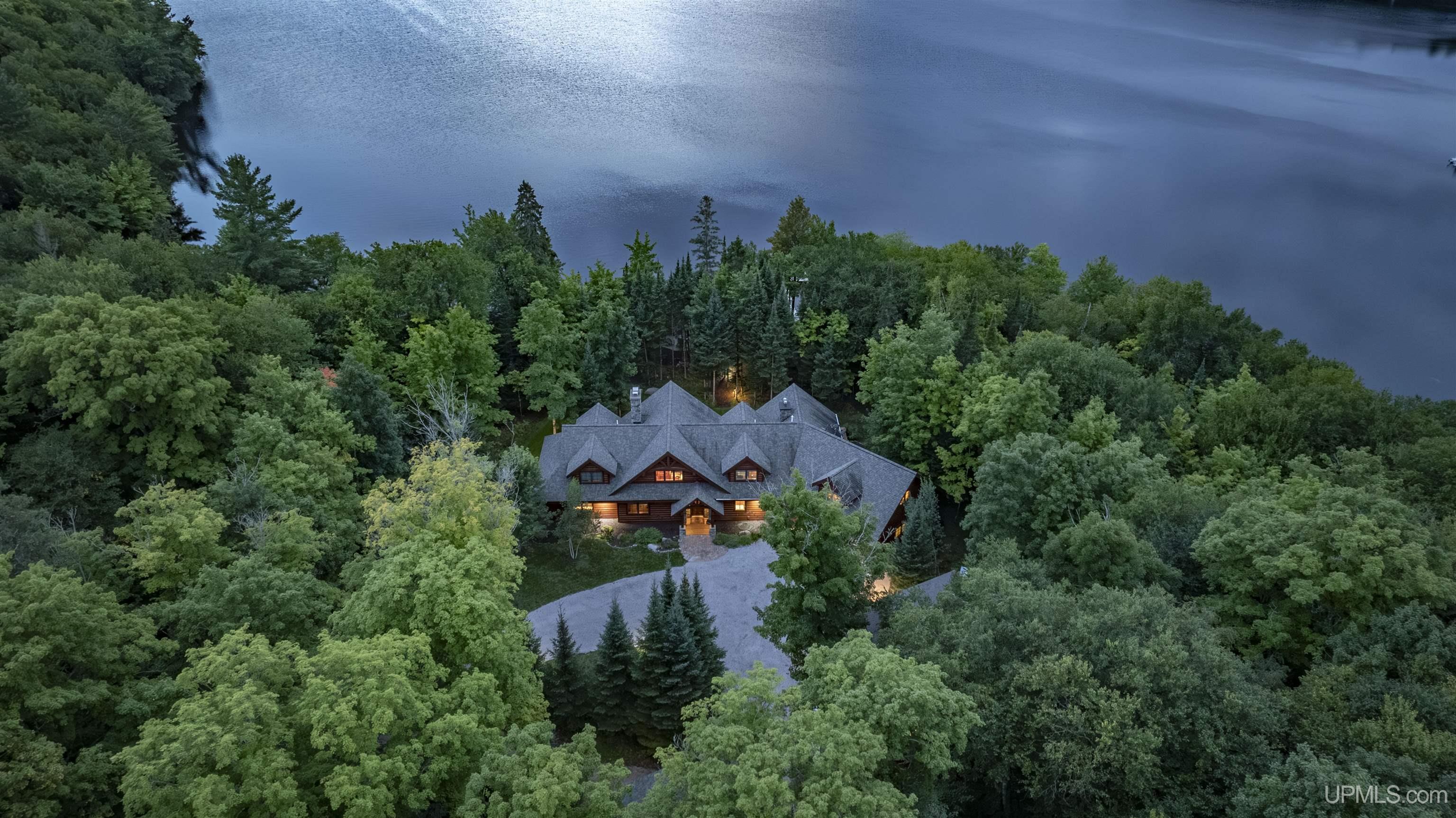 Move-in ready and waiting for you, this executive home on 10 acres is situated on the private, serene Homan Lake in Iron County, Michigan. The moment you arrive, you’ll never want to leave. The property is beautifully landscaped, with recently epoxied garage floors and freshly stained buildings. Step inside to discover engineered elm floors with in-floor heating, extending even to the attached garage. The open-concept layout features a chef’s kitchen with soapstone countertops, Alder wood cabinets, and vaulted ceilings that flood the space with natural light. Entertain guests in the dining area, complete with a freestanding Woodstock Soapstone fireplace, or relax in the all-season sunroom, which boasts a built-in grill, hood, and stunning lake views. The living room offers another cozy retreat with a handpicked Montana stone fireplace. The main home includes four bedrooms and 2.5 baths, with a master bath shared by two bedrooms, featuring a tiled steam shower, soaking tub, and double sinks. Upstairs, includes 2 more bedrooms and a bath with a balcony with views of the outdoors and lake. Main-floor living is made easy with a laundry room attached to the garage and plenty of storage throughout the property Additional living quarters above the attached garage provide a bedroom, bath for overflow of guests. The 1590+ sq ft guest house adds even more versatility with one bedroom, one bath, a sauna, kitchen, living area, and a family entertaining space. Outside, a retractable electric/remote awning provides shade on hot days, while wood soffits and gutters add to the home’s charm. The extra detached garage includes upstairs storage accessible by stairs. The waterfront features a beautiful landscaped firepit area and a 72-foot aluminum dock, making it easy to enjoy the tranquil beauty of Homan Lake, which has a max depth of 37 feet. This private lake setting offers the peacefulness of the Northwoods while still being close to other rivers, lakes, and streams. Most furnishings and all appliances in both the main house and guest house are included, and both homes are equipped with security systems for added peace of mind. Located on a private road, this property is a true retreat, ready for you to move in and enjoy.