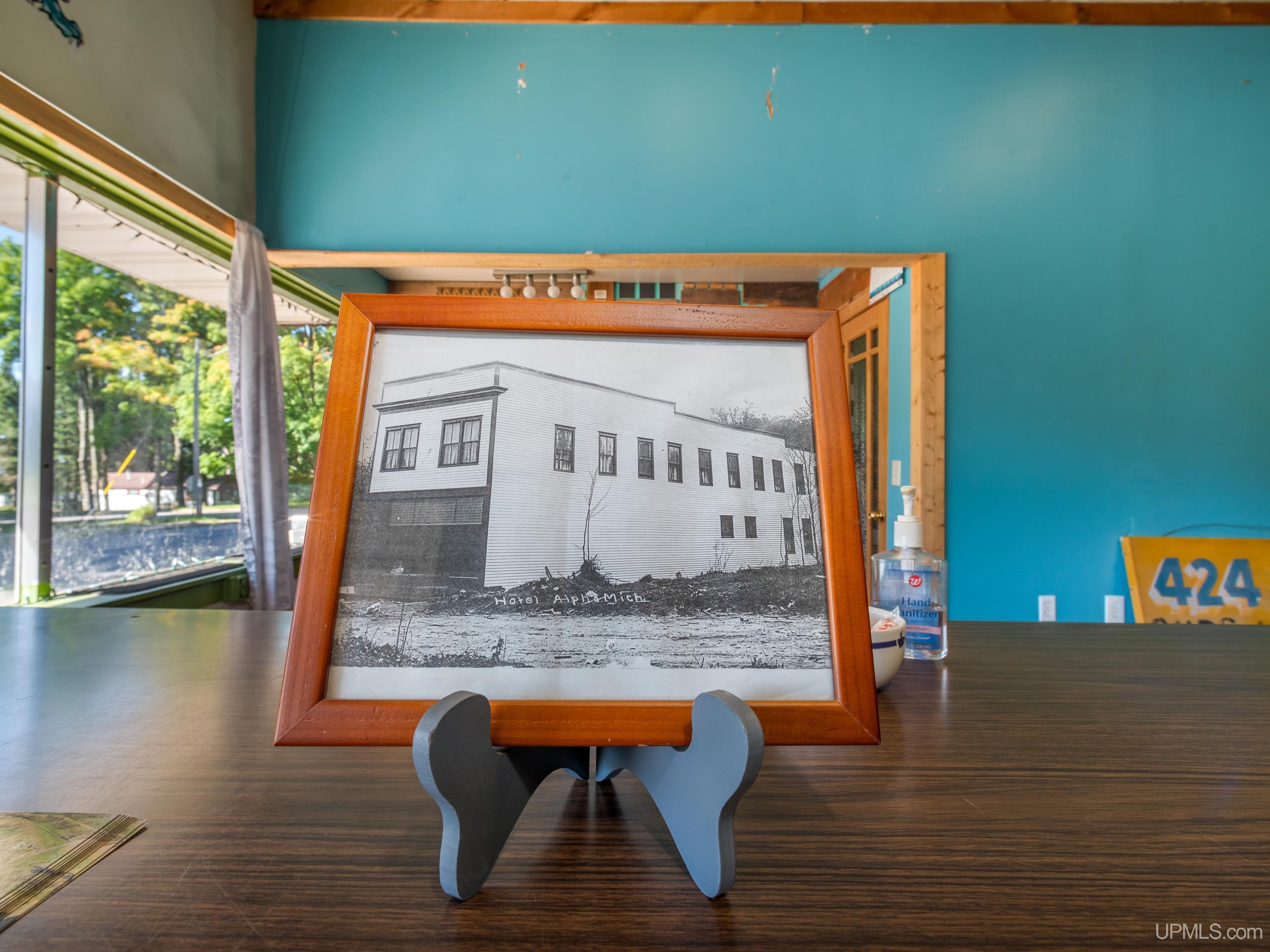 Welcome to 514 Main St. in Alpha, Michigan, a unique property that offers the perfect blend of business, storage, and comfortable living all in one. This expansive 2,700+ square foot space boasts a stunning full-window storefront with a covered entrance, 20 ft ceilings, and original 1914 tin in silver, creating a timeless, classic appeal. Inside, you'll find a versatile bar area, a walk-in cooler converted into afunctional office space, and charming French doors that open to reveal more storage options, including an above-cooler cubby and under-stairs storage. The property features a gorgeous red ceramic tile floor, reflecting the 1914 period, and a staircase leading to additional storage upstairs. The front section includes a grandfathered three-bay sink and a beautiful mosaic backsplash, making it ideal for any type of shop. Three ceiling fans keep the air circulating, adding to the comfort of this space. As you walk through the center of the building, you'll discover convenient storage areas, a laundry room, and a half bathroom leading to a large garage with access to a mudroom and a spacious basement. The basement is equipped with two propane forced air furnaces, a wood-burning furnace, a sump pump, and access to the backyard. Outside, you'll find a 30x50 pole barn/garage with a cement floor, large bay doors, a staircase to the loft, and a large service door, perfect for all your storage needs. The patio features newer stonework, and the garage offers ample space to keep vehicles safe from snow and ice. The living quarters offer a cozy, three-bedroom home with two additional smaller rooms, ideal for an office, craft, or sewing room. The primary bedroom is spacious, with two large closets, and the full bathroom includes a tub and shower. The living area opens up to a stunning 14 ft. vaulted ceiling, with pine wood walls and a beautiful white rock fireplace, complete with a black marble sitting mantel and cast iron insert. Enjoy the views of the surrounding woods through the new Andersen windows or step outside through the French doors to the cement patio and garden wall. Location is key—514 Main St is just two blocks from the Alpha Brewer and four blocks from the Iron County ATV trails. Enjoy outdoor activities with a frisbee golf course and two parks within 5 miles. Pentoga Park and George Young’s Golf Course are less than 15 minutes away, offering endless recreational opportunities. Whether you’re looking to work from home, start a business, need extra storage for your toys, or want to experience the charm of UP living, 514 Main St offers it all. Don’t miss out on this incredible opportunity! Reach out to your agent for a showing today. *All measurements are approximate and were obtained from sources deemed reliable. However, accuracy is not guaranteed, and buyers are encouraged to independently verify all measurements and property details to their satisfaction*