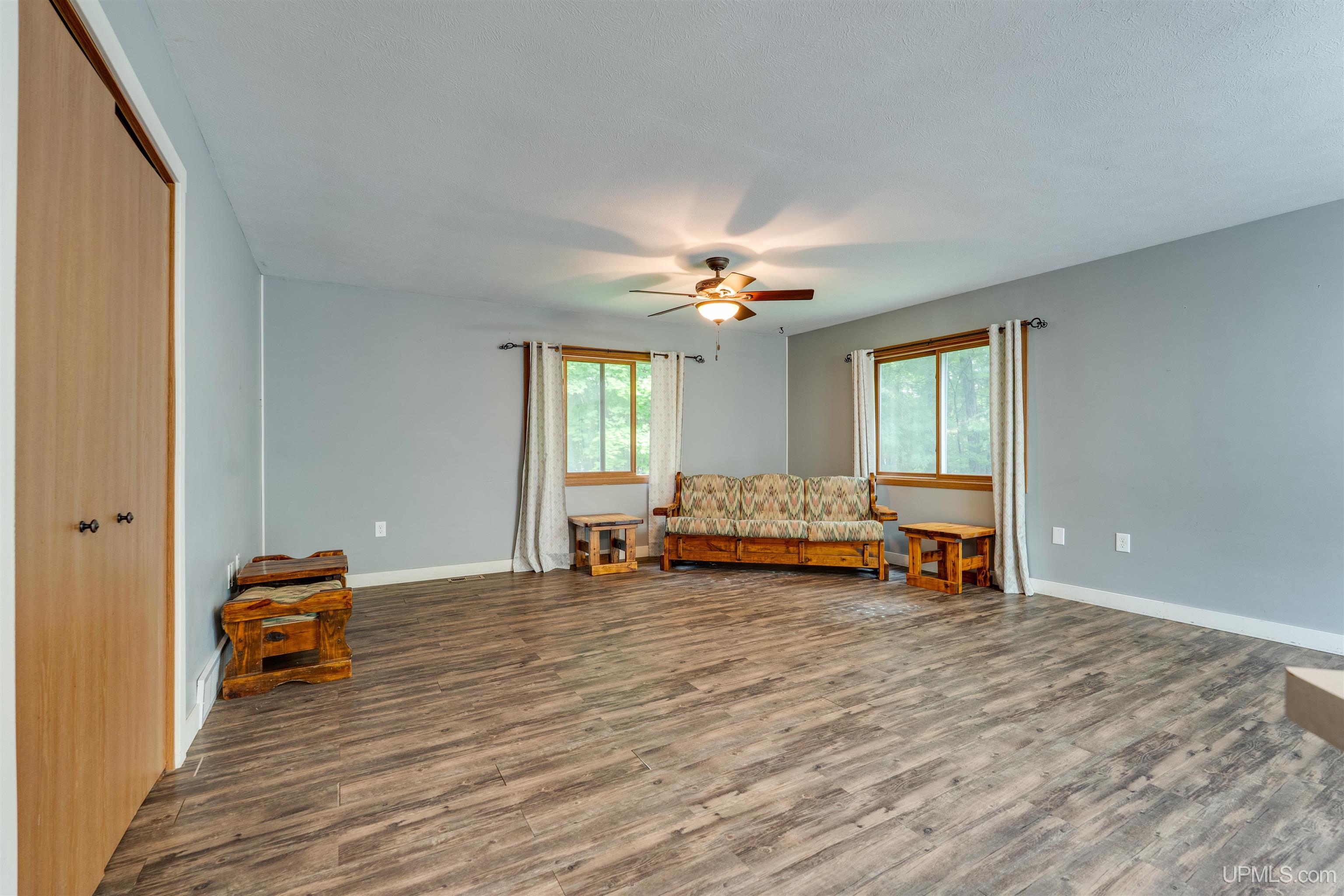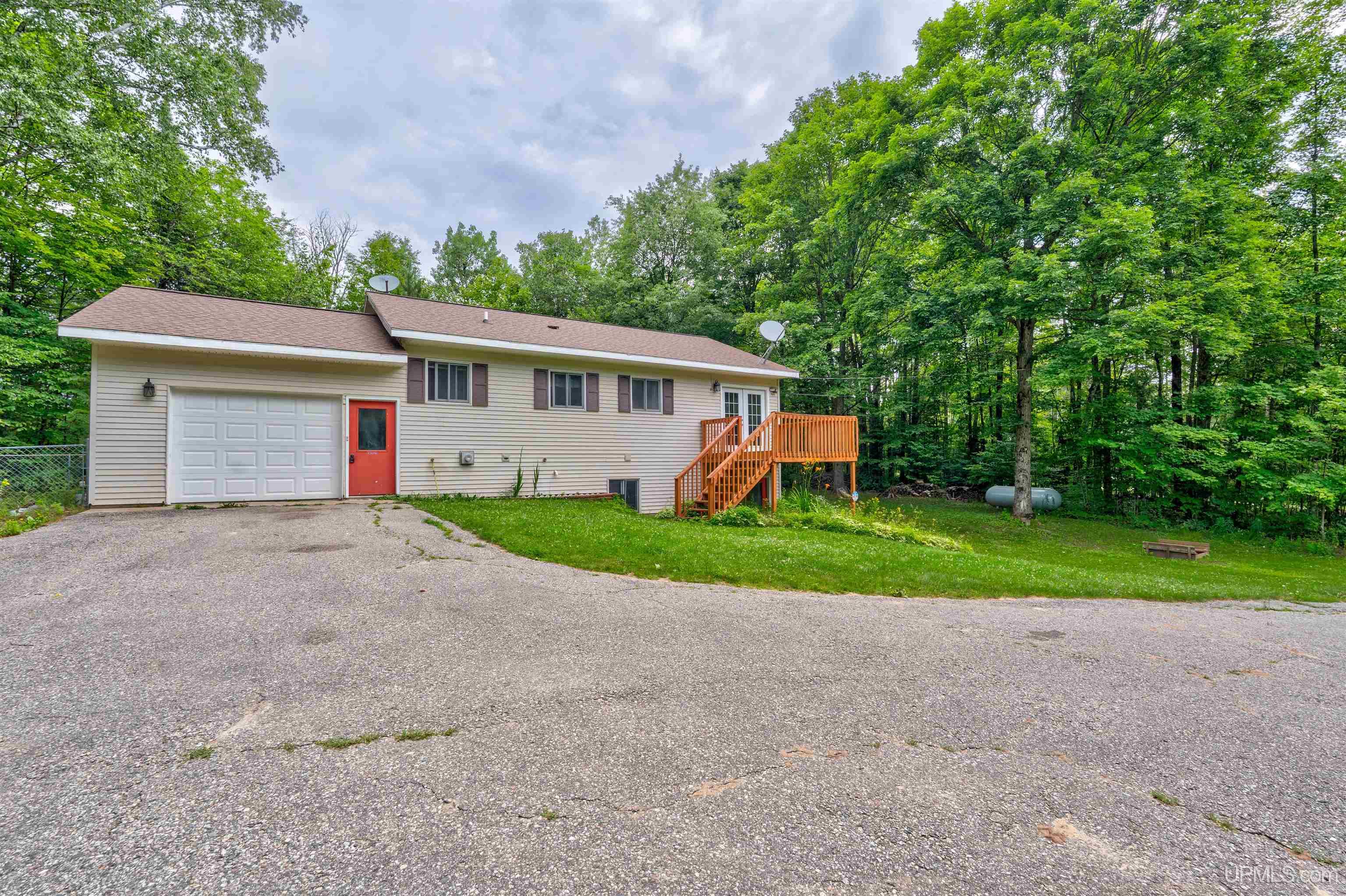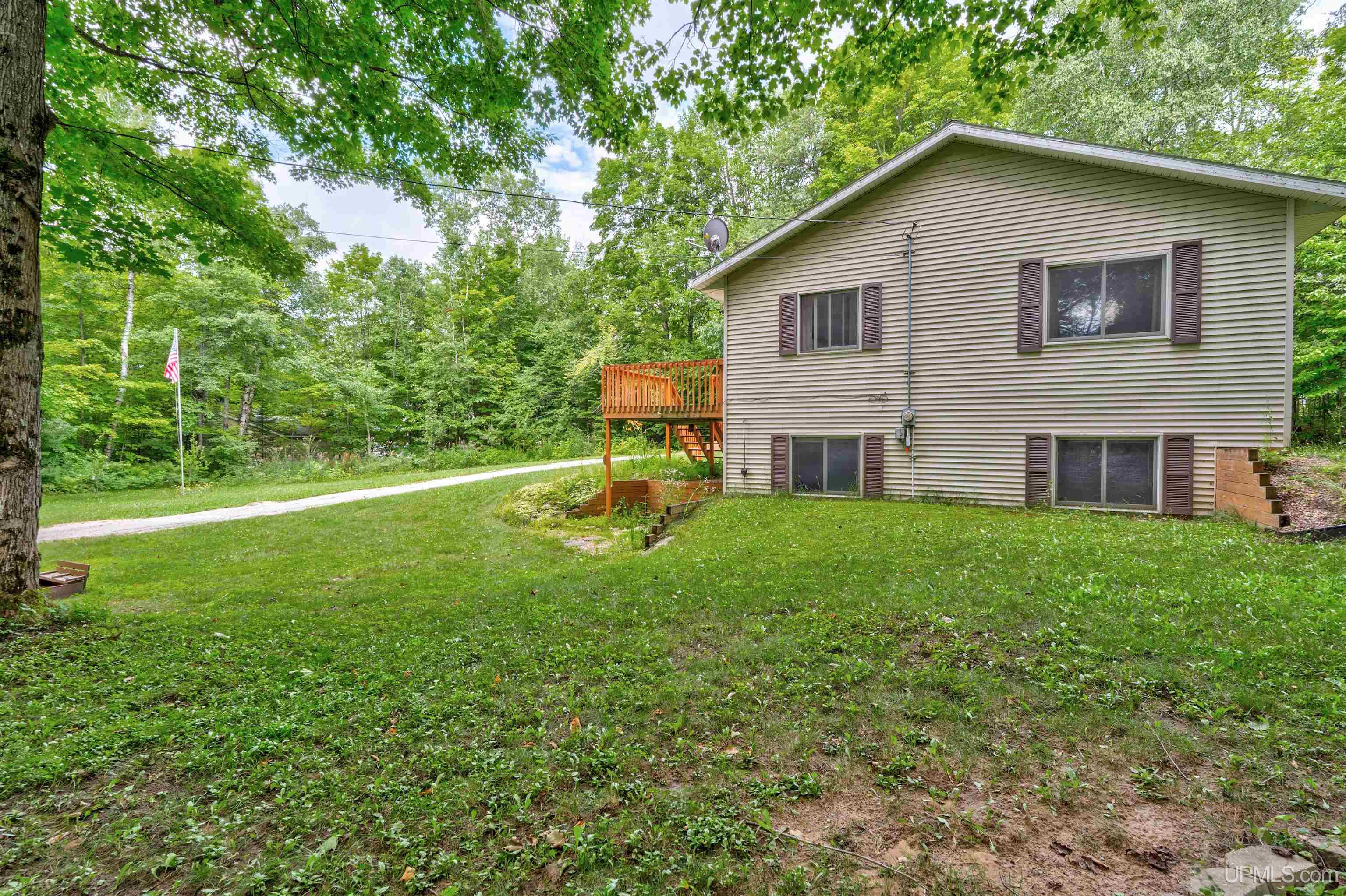 Tucked back in the trees and set in a peaceful, private setting, this 3-bedroom, 2-bath, 1,700 sq. ft. two-story home feels like a place to truly unwind—whether you're settling in for good or looking for a vacation property. The main floor features an open layout with natural light flowing through large windows across the kitchen, dining, and living areas. A kitchen island offers extra storage and seating, while low-maintenance vinyl plank flooring adds modern charm and durability. The primary bedroom includes two large closets and laminate wood flooring, and the main floor also includes a spacious full bathroom and a laundry/mudroom entry. Step outside through newly upgraded French doors that lead to a raised deck, perfect for morning coffee or evening relaxation. The fully finished walkout basement has its own private entry, making it ideal for guests, or potential rental income. It includes a large recreation room, another full bathroom, and two roomy bedrooms, each with big closets and full-size windows for great natural light. The home also offers an attached one-car garage. Fido can access the outdoor dog kennel from the garage. A DNR public boat launch on East Lake is just 300 feet from the property/private road. Conveniently located just off M-28, this property is only about 10 minutes from town and close to snowmobile trails, lake access, and expansive state land. Whether you're looking for a quiet home base or a weekend-ready escape, this one offers flexibility and a little room to breathe.