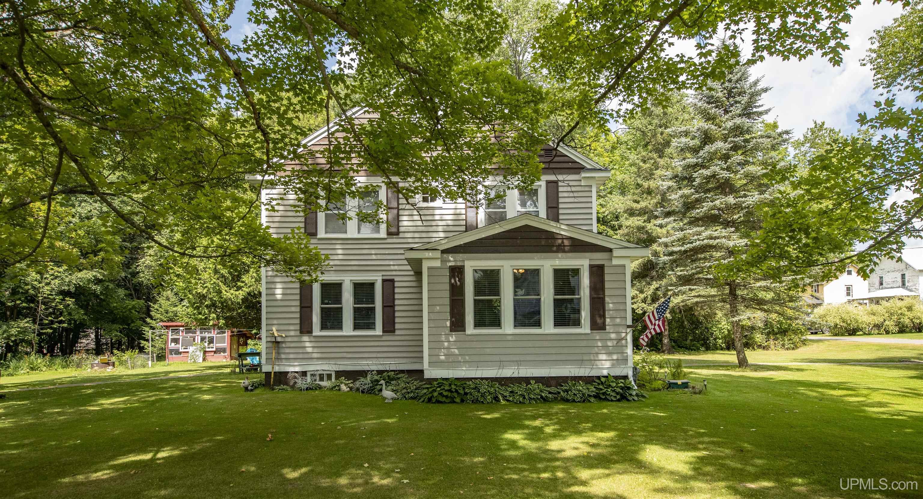 Discover timeless charm in this 2-story, 4-bedroom, 2-bath home located in the scenic beauty of Bates Township, Iron County, in Michigan’s Upper Peninsula. From the moment you step inside, you’ll be greeted by vintage details including graceful arches, original built-ins, hardwood floors, arched walls, and classic wood doors that add warmth and character throughout. The kitchen showcases a nostalgic, old-fashioned sink, abundant cabinetry, and a pantry area for extra storage. A separate dining room sits just off the kitchen, perfect for family dinners or entertaining guests. Natural light floods the living room, where a wood-burning fireplace creates the perfect setting to relax with a book or gather with loved ones on chilly evenings. A den/office off the living room provides flexible space—ideal for working from home, a playroom, or hobby area. Upstairs, you’ll find four comfortable bedrooms and a full bath, plus a walk-up attic that offers exciting potential to finish into additional living or recreational space. The full basement features a second bathroom, ample storage, and room for a workshop or extra living area. Situated on a corner lot, the property offers a generous yard for gardening, play, or simply enjoying the outdoors. A detached garage adds space for vehicles, toys, or projects. Recent fresh paint enhances the home’s inviting feel.