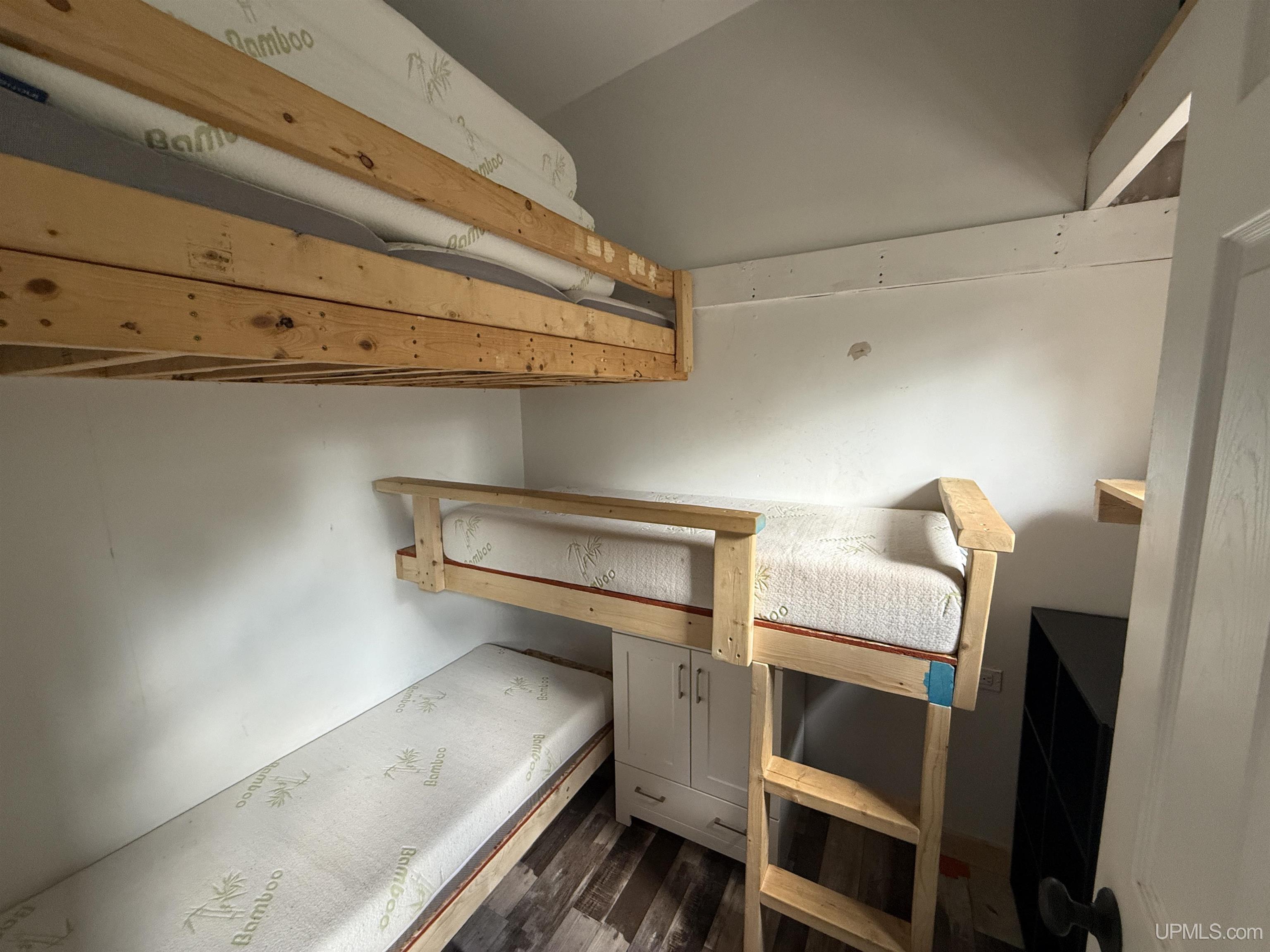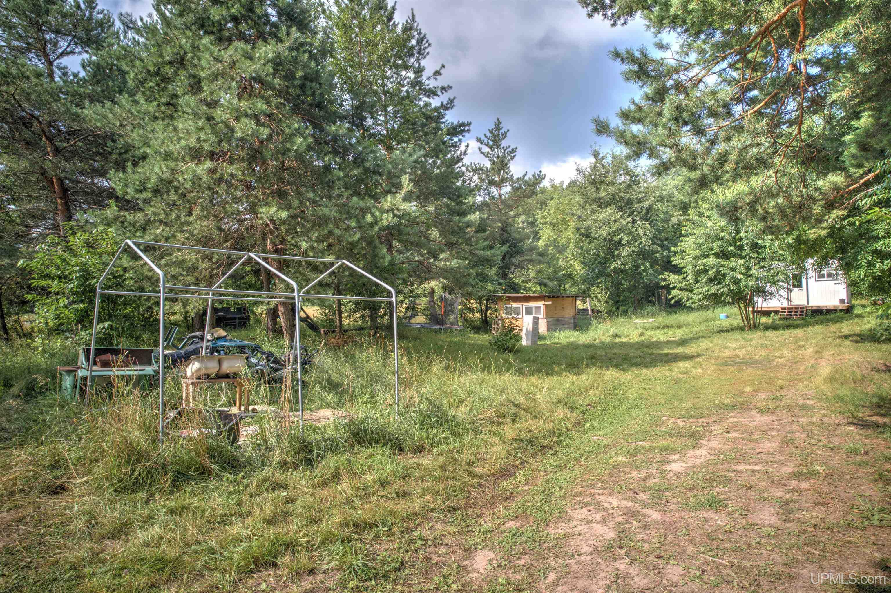 Set on 2.07 acres in a peaceful rural setting, this compact cabin and land package on Aspen Drive in Pelkie offers an excellent start for a weekend retreat, hunting camp, or minimalist full-time living. The property is partially wooded yet cleared enough for easy access, with year-round road frontage and electricity already connected. Inside, the one-room living space is designed for efficiency and anchored by a compact wood-burning stove for cozy evenings. Multiple windows bring in natural light and views of the surrounding trees. The open 'kitchen' features open wooden shelving above, and fabric curtain panels in place of cabinet doors below, practical for storage and in keeping with the rustic style. Adjacent is a custom-built bunk bed arrangement crafted from sturdy rough-hewn lumber, offering sleeping spaces and integrated storage including a white cabinet and shelving. The bathroom, accessed through a white paneled door with full-length mirror, houses an eco-friendly composting toilet, a tall storage cabinet, and a small wall shelf. While functional, many areas inside, especially wall finishes, are in an unfinished state, allowing a new owner to personalize the space. Surrounded by nature, this property combines privacy with accessibility. Whether you finish it to your taste or keep the rustic charm, it’s a flexible, ready-to-use base for enjoying Michigan’s Upper Peninsula year-round.