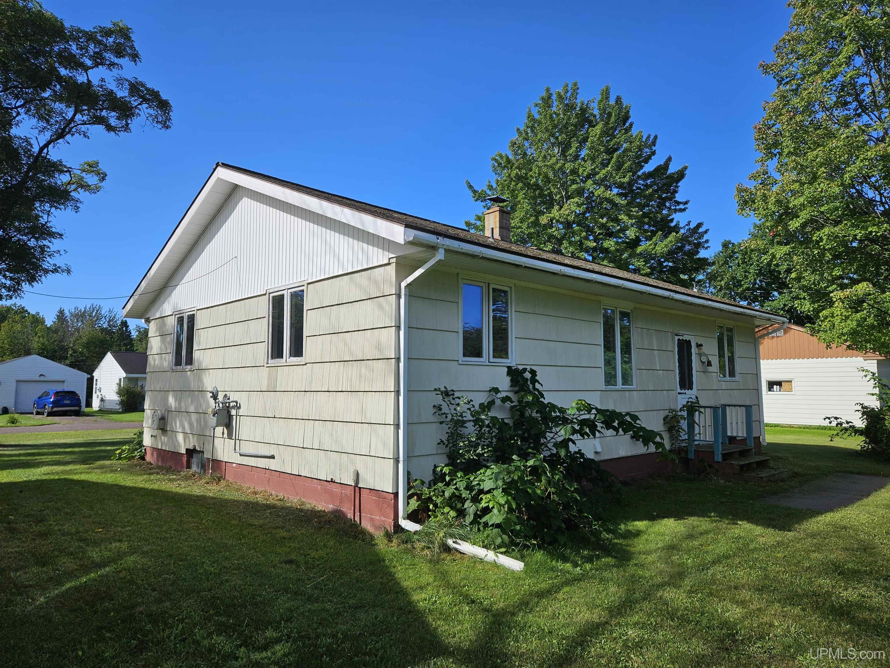Efficient, cozy one level home on 4 lots! This 2 bedroom home features a large living room and kitchen, with 2 large bedrooms providing ample closet space. The basement is equipped with a bar/entertainment area. The home has many cute home made features that you need to see to appreciate. Walk out the back door into the HUGE backyard, with a cement fireplace sitting area framed towards the road with lush blackberry bushes. the detached garage is large enough for 2 vehicles and has a built in workshop for all sorts of projects. Their is also a shed set up for extra storage. This lot is big enough for another garage, or offers plenty of parking for truck/trailers. The snowmobile trail is only 2 blocks away as well making it easy to get out and enjoy the area.