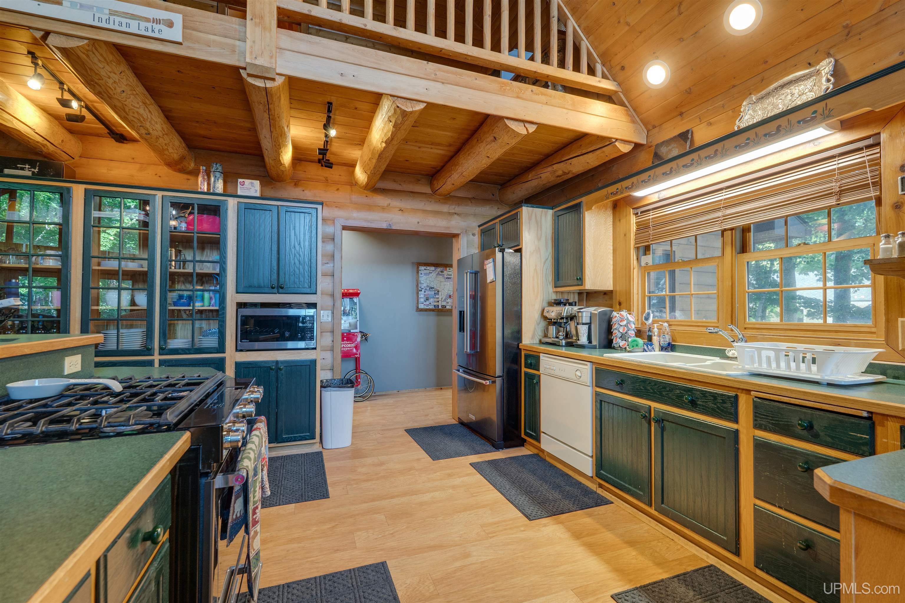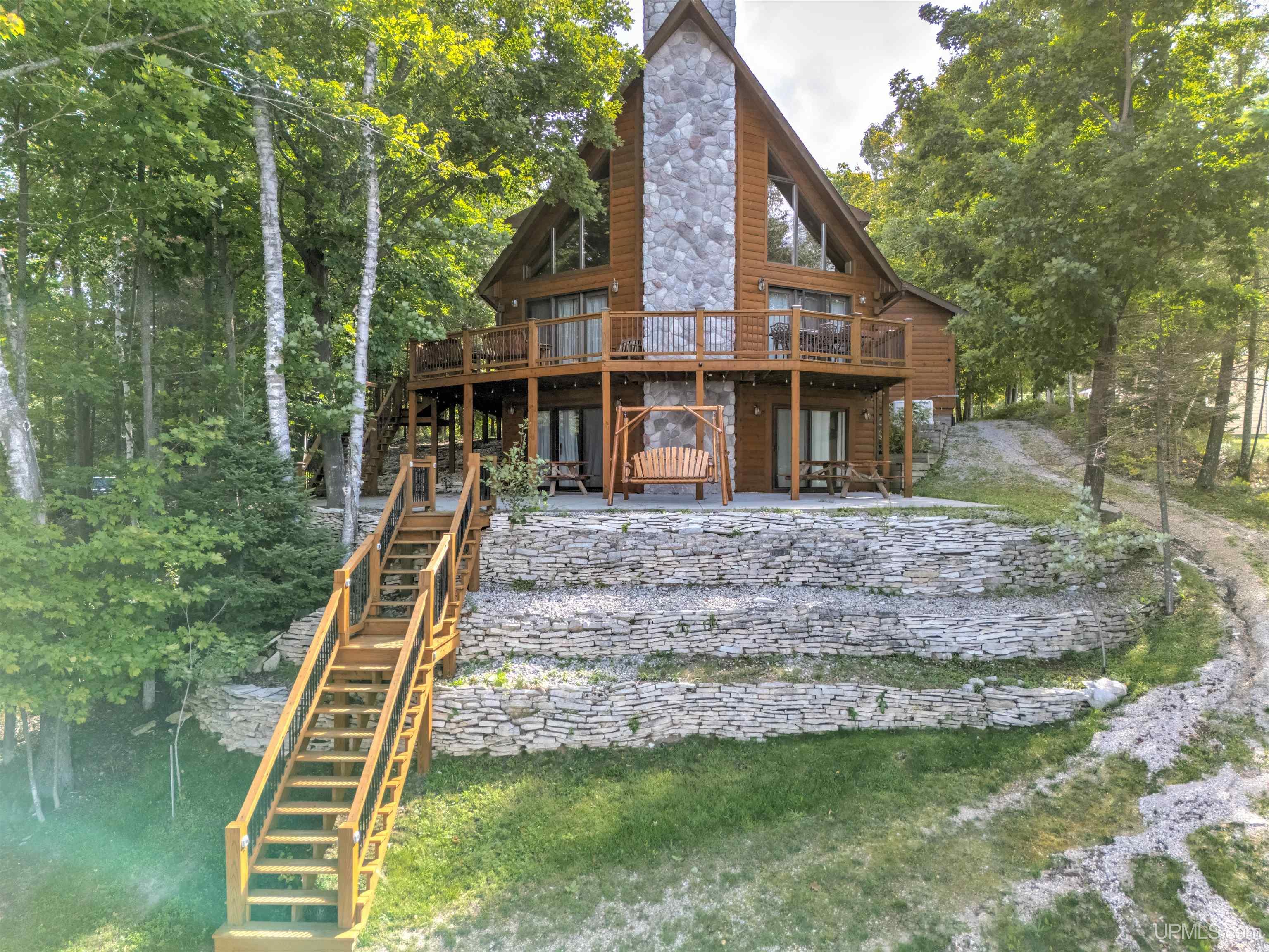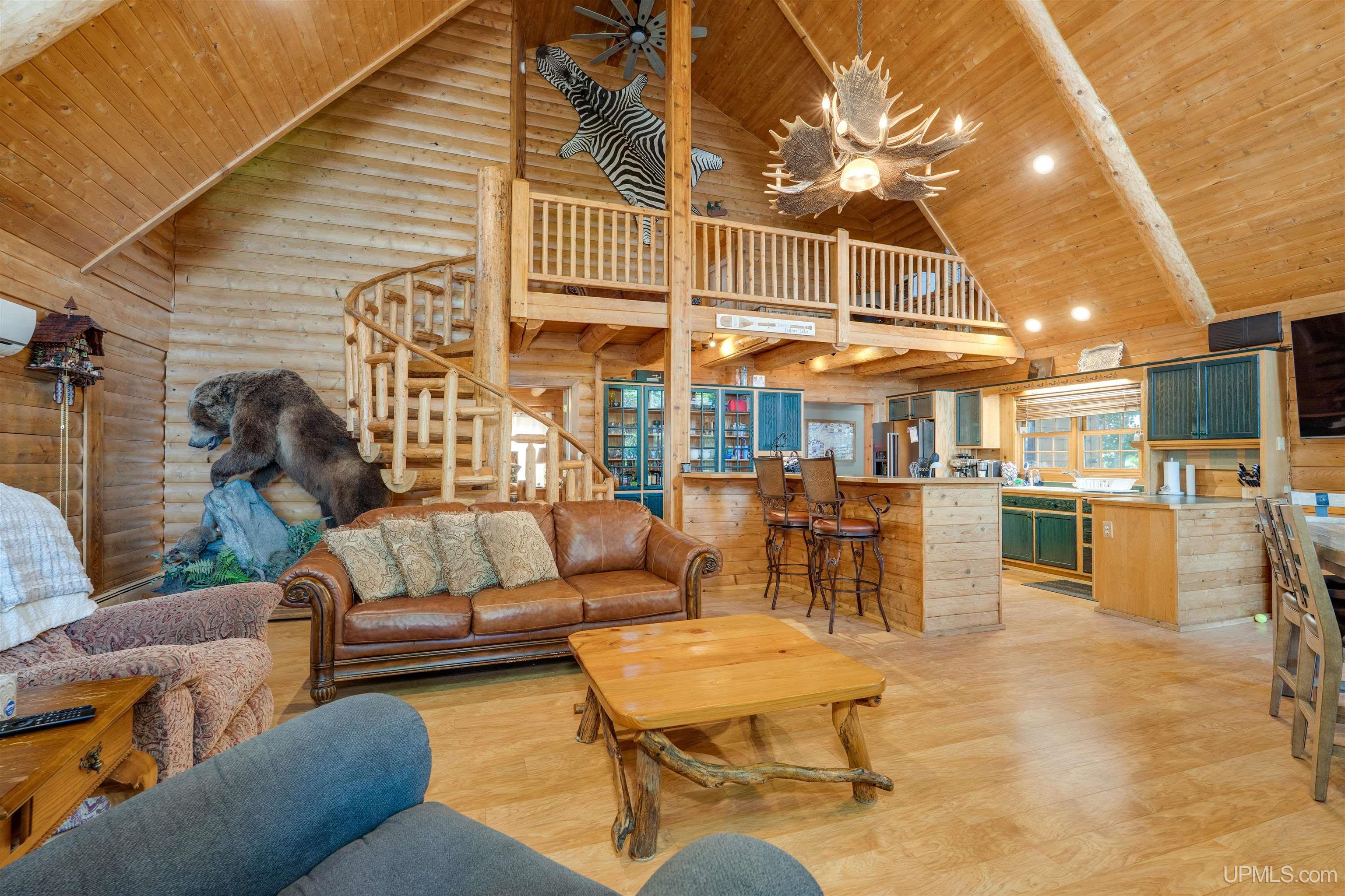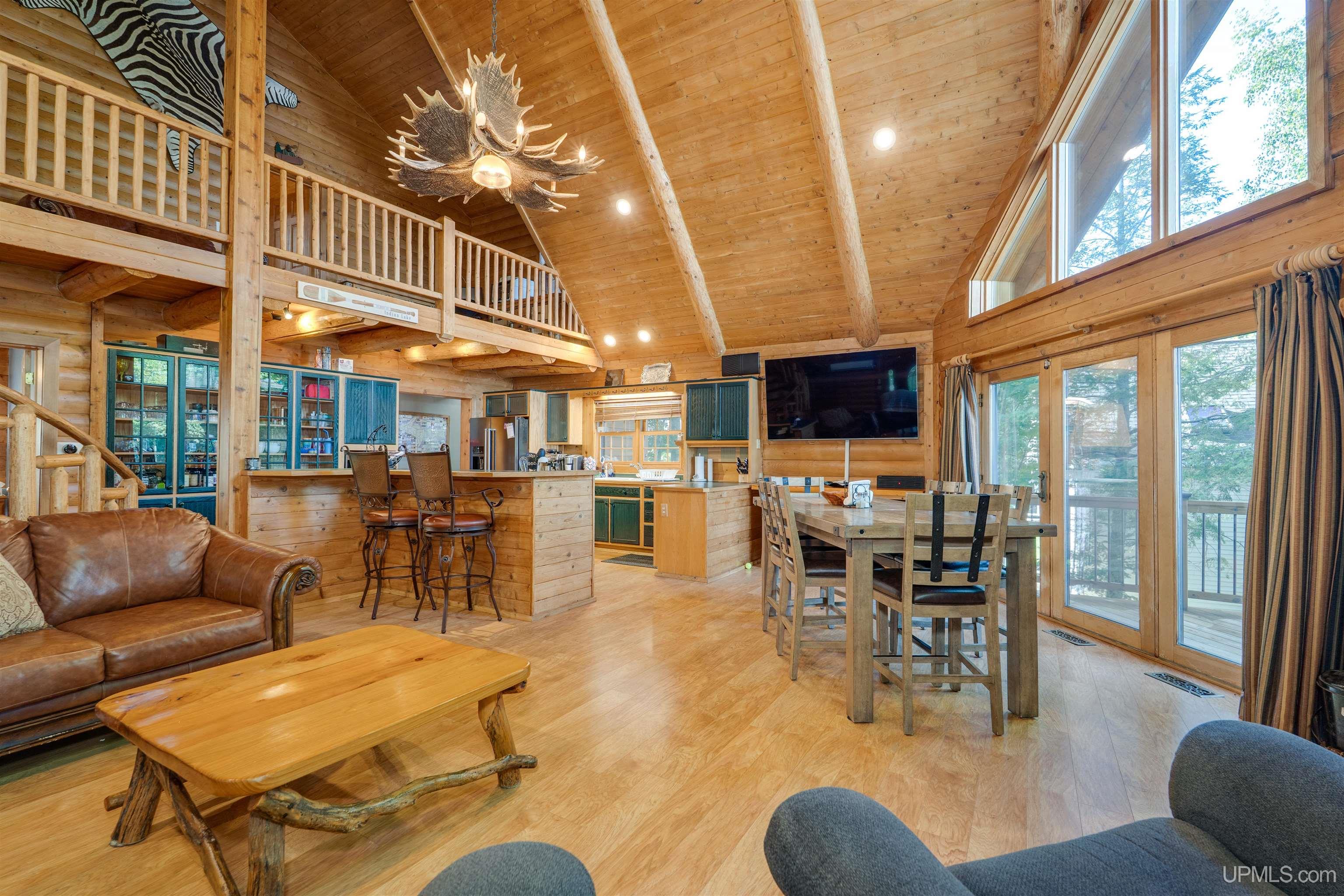Exceptionally well maintained full log home with direct frontage on beautiful Indian Lake. Located on the east shore, where you’ll enjoy breathtaking sunsets and year-round comfort. This three-level home is thoughtfully designed and has lots of spaces over three levels. The finished walkout lower level features two bedrooms, a full bath, laundry, storage, and mechanical rooms. The main level offers an open-concept living, dining, and kitchen space highlighted by a massive fieldstone fireplace that rises from floor to the vaulted cedar tongue-and-groove ceilings, complemented by full log beams, a natural stone hearth, and a full log mantel. The main floor also includes the spacious primary suite with an oversized bath boasting a walk-in tile shower and soaking tub, abundant closet space, and a guest half bath. Upstairs, you’ll find two additional bedrooms, a full bath, and a large sitting area. Enjoy lake views from all three levels. The log construction, cedar accents, and drywall details blend for timeless charm throughout. Recent upgrades include the exterior logs cleaned, caulked and stained, new natural gas service and appliances, whole-house AC, Generac standby generator, water filtration system, shoreline restoration and stabilization, cement patio installation, and extensive landscaping. The attached two-car garage adds convenience, while included security cameras provide peace of mind. For some of you the best part is yet to come! Directly across the road, you’ll own additional lots featuring a remarkable 60’ x 80’ barn—half is fully finished with heat, electric, water, full bath, and its own well and septic, while the other half is cold storage with built-in organization. You can park all of the toys you want and have room to spare. Trail access is not far away to bring the snow machines and ATV’s to enjoy millions of acres and hundreds of miles of public land trails. 8,400 acre Indian Lake is located near Manistique, a welcoming Upper Peninsula community on Lake Michigan’s north shore. You’ll be close to shops, dining, schools, and hospital services while enjoying access to endless outdoor recreation. Appliances are included and furnishings are negotiable. This rare property offers the perfect blend of rustic charm, modern updates, and exceptional amenities—an ideal hub for year-round living in the U.P.