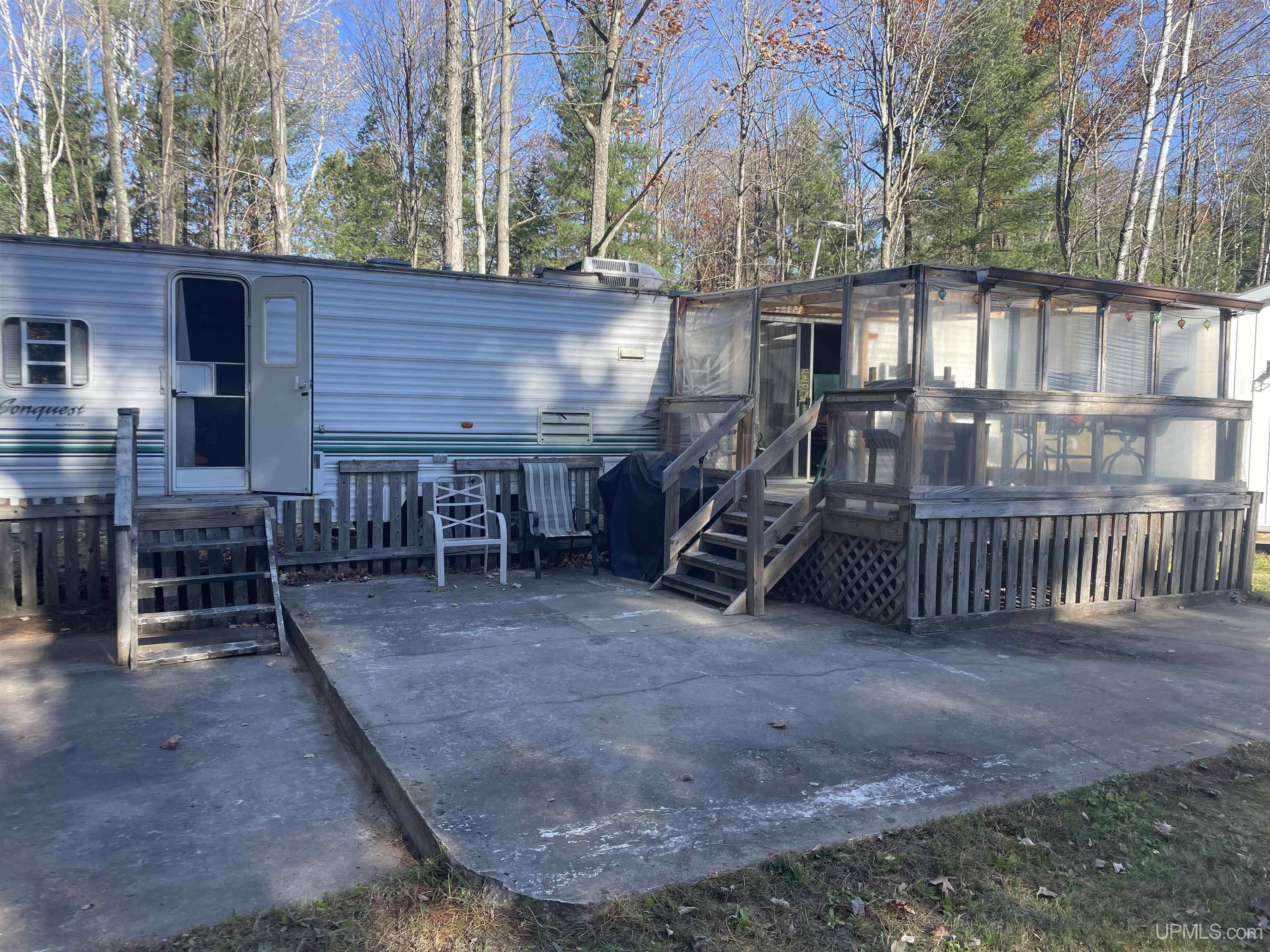 Affordable getaway offering frontage on a shared pond, with the majority of the pond located on this property and depths of approximately 10 feet. A dock is in place for easy access to the water. The property includes a camper on a concrete slab connected to a holding tank, 250-gallon water storage, and electric service. A new electric pedestal provides four 120V and one 220V outlets. Additional features include a fenced yard, storage shed with porch overlooking the pond (wired for electric and ready for finishing), and a firepit area perfect for enjoying cool fall evenings by the water.