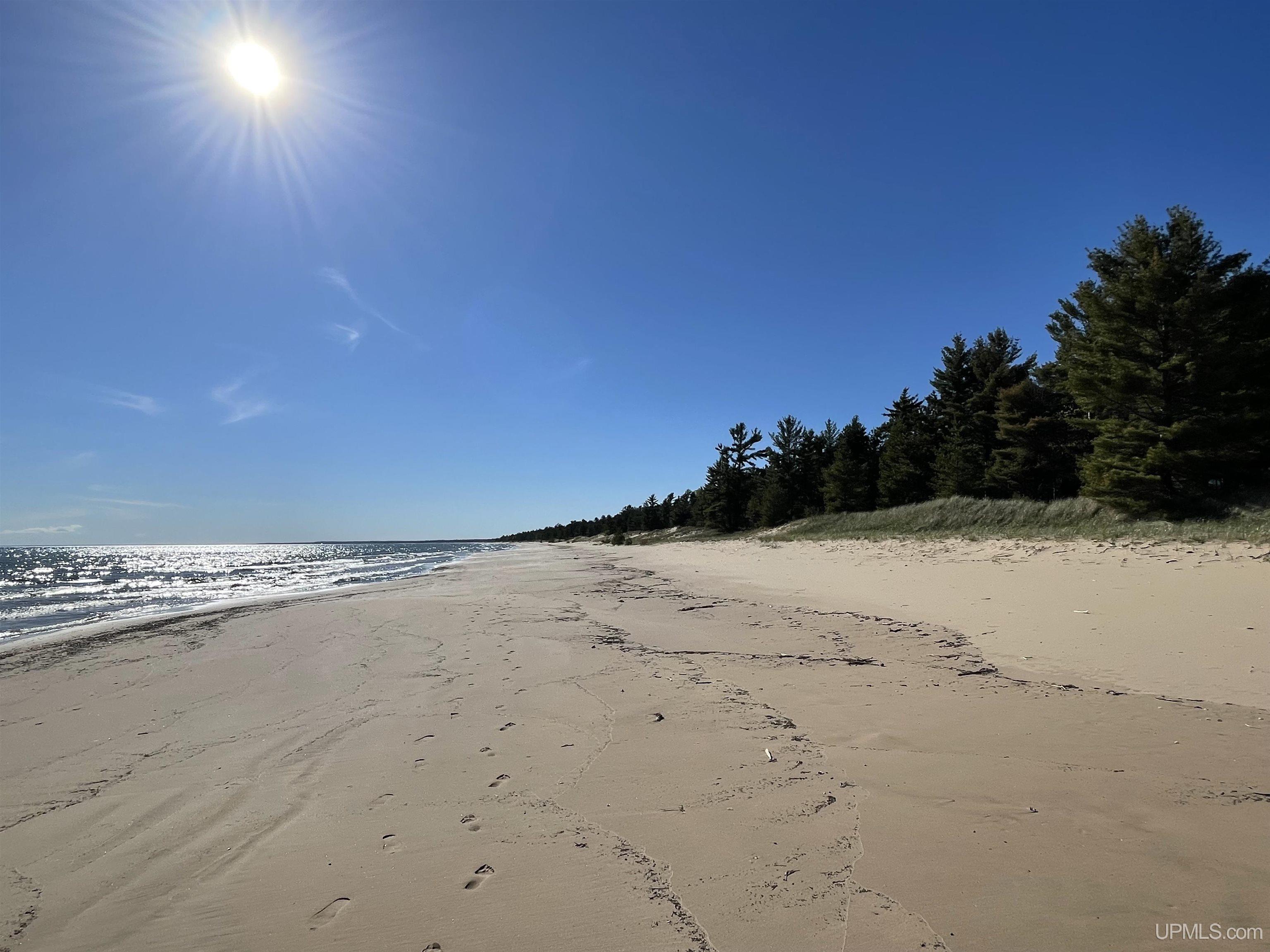 On the Top of Lake Michigan you will find one of finest waterfront parcels anywhere. The location provides a gorgeous southerly view with the occasional freighter passing by. There is so much to enjoy with the incredible qualities this property has to offer, but our favorite is the deep and plentiful sugar sand! The beach goes for miles in either direction and offers some of the best recreation you will find anywhere. This parcel has 403’ of water frontage, is approximately 43 acres and has a good route to the quality building site which is elevated and will offer excellent views over the front dune area. The beach is wide and the sand continues in the lake to well beyond where anyone would venture by swimming or paddling. The predominant trees are red oak, red pine and white pine and the forest is mature and majestic and the upper limbs are often visited by the many eagles in the area. The access is by a private gated road that runs along the shoreline for close to two miles and there is no outlet making this property so very quiet, secluded and secure. Building your vacation or forever beach home here could be the dream you have been looking for!