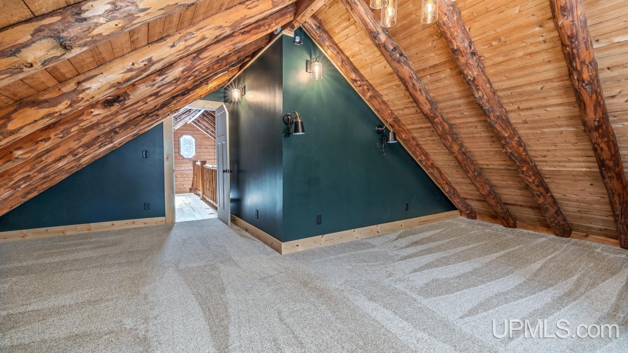 A rare opportunity to own a peaceful getaway nestled on 40 acres, thoughtfully upgraded with modern amenities! This unique 3 bedroom, 1 bath log home features a stunning newly remodeled bathroom and primary bedroom, recently upgraded roof, newly sealed/stained siding, and a breathtaking natural setting with the Sturgeon River forming the southern boundary of the property. The open living area showcases real wood floors and offers a warm, inviting atmosphere. A newly upgraded wood stove provides cozy comfort even on the coldest Upper Peninsula winter nights. The kitchen flows seamlessly into the living space and features a large island, making it ideal for hosting and gathering. Two mirrored bedrooms branch off the main living area and feature newly carpeted floors. The bathroom is a true spa-like retreat, featuring a jetted soaking tub, beautifully stone-tiled waterfall shower, new LG washer/dryer tower, handcrafted Amish sink cabinet, and both a new primary water heater and a backup electric water heater to ensure extended comfort and relaxation. A loft overlooking the living area offers versatile space for storage, a playroom, or a cozy nook tailored to your needs. It also hosts the spacious primary bedroom with newly installed egress window. With high-speed Starlink internet available, this space is also perfectly suited for a work-from-home office. Homes like this are rarely available, so whether you’re seeking a private escape from city life, a remote-work-friendly retreat, or a dream property for outdoor enthusiasts, this one-of-a-kind setting delivers.