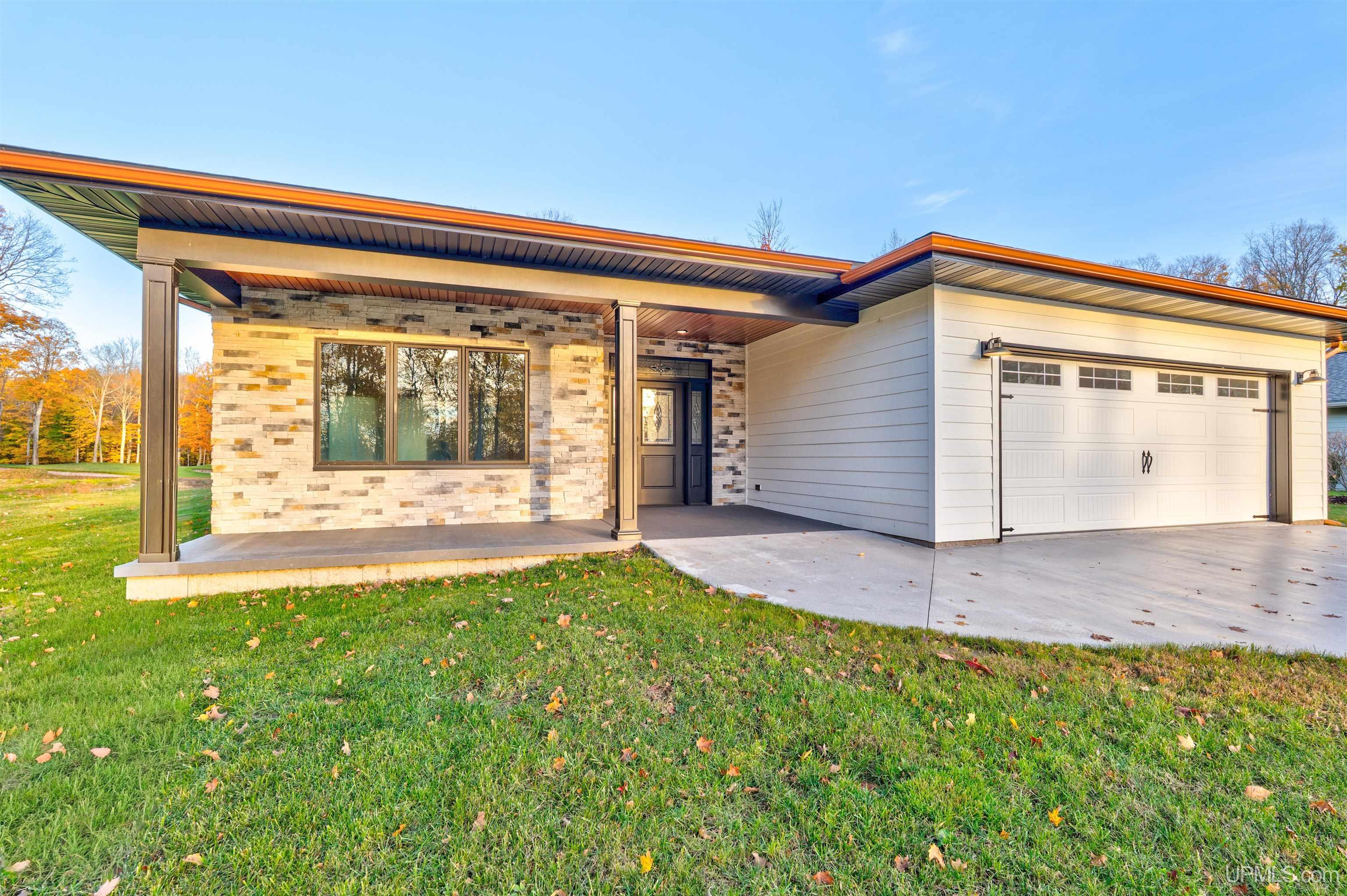 Experience refined modern living in this stunning 2025 custom-built home, ideally situated along fairway #7 near the green of Indian Lake Golf Course. With deeded access directly across the road to Indian Lake—an all-sports, 8,400-acre lake known for its excellent fishing, swimming, and recreation—this home delivers the best of both golf course and lakefront lifestyles. Located on a quiet cul-de-sac, it offers sunset views over Indian Lake and a peaceful, private setting. This 3-bedroom, 2-bathroom home spans 1,900 square feet and is thoughtfully designed with high-end finishes and energy-efficient features. The exterior showcases Smart siding with rain defense paint, a 50-year rating, and a 170-foot-long poured concrete driveway. Cultured stone with copper-colored accents adds warmth and elegance to the front porch area, while the stamped black concrete back patio offers a stylish outdoor space to relax or entertain. Aluminum door frames and seamless gutters complete the polished look. Barrier-free entrances enhance accessibility throughout. Inside, custom “Cretens” soft-close cabinetry, luxury Cambria Quartz countertops in the kitchen and bathroom, and a marble natural gas fireplace set the tone for upscale comfort. The fireplace hearth and built-in bookcases are also finished with Cambria Quartz, creating a beautiful focal point in the living space. The dining area overlooks the greens with walkout access to the back patio. Soaring 9-foot ceilings and strategically placed windows offer abundant natural light and privacy. The primary suite is a luxurious retreat, with a spa like full bath featuring a heated tile floor, custom walk-in shower with bench seat, dual sinks, and a spacious walk-in closet that connects to the laundry area. The third bedroom offers flexibility as an office or guest space, with lake views and elegant glass French doors. Lighted closets, dimmable and 3-way lighting, and spray foam insulation throughout—including the ceiling—highlight the thoughtful attention to detail. The tall, insulated crawl space provides generous storage, with 5" thick flooring and 2" foam underneath. The home features an on-demand hot water heater, natural gas forced air heating, and central air conditioning. It's serviced by a private well and septic system and is already set up for a water softener if desired, plus all utilities are on the main level for true one level living! The oversized three-car garage includes a drive-through door at the back for a golf cart, an 18-foot wide insulated door, hot and cold water, a floor drain, ample outlets, and electric vehicle charging readiness. Located at 1522 Country Club Dr in Manistique, this one-of-a-kind property offers the perfect blend of sophistication with upscale design, functionality, and unbeatable access to golf and waterfront recreation.