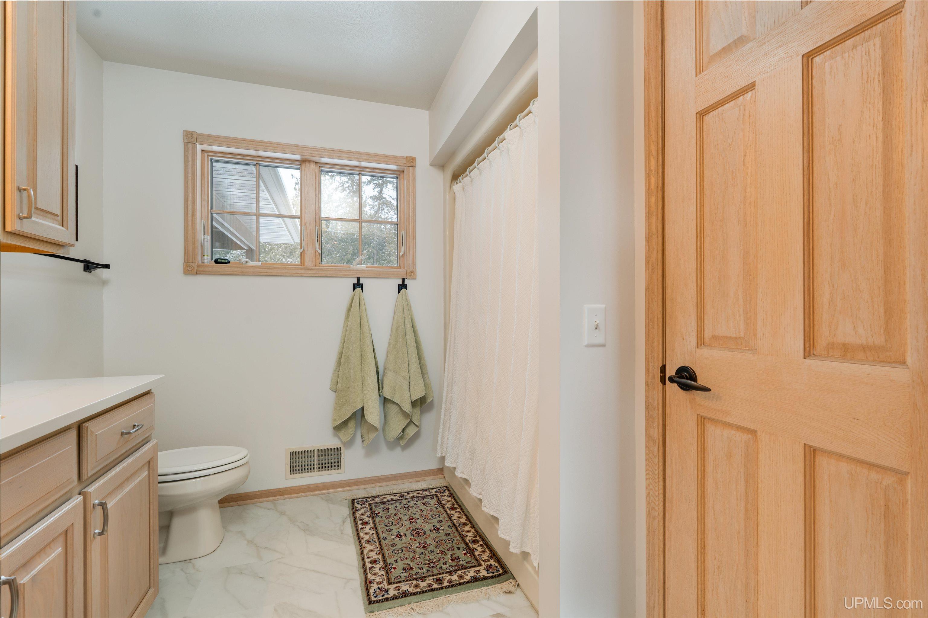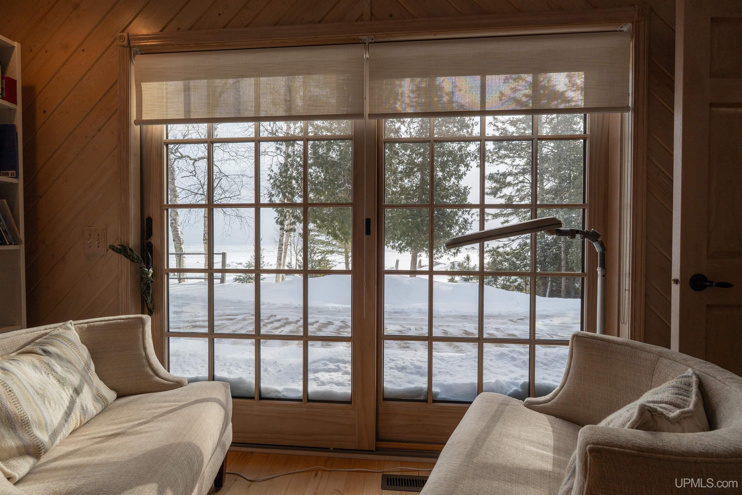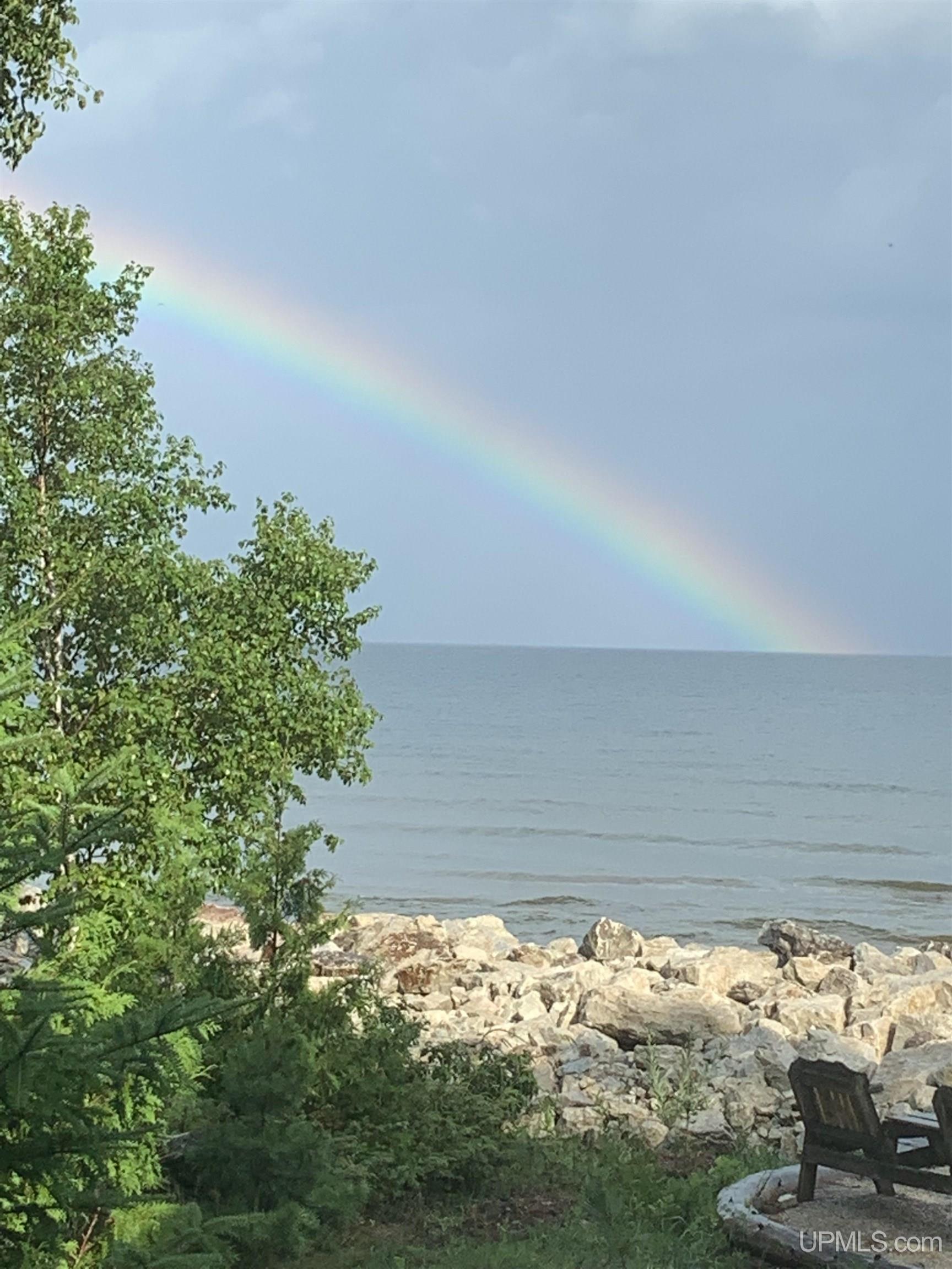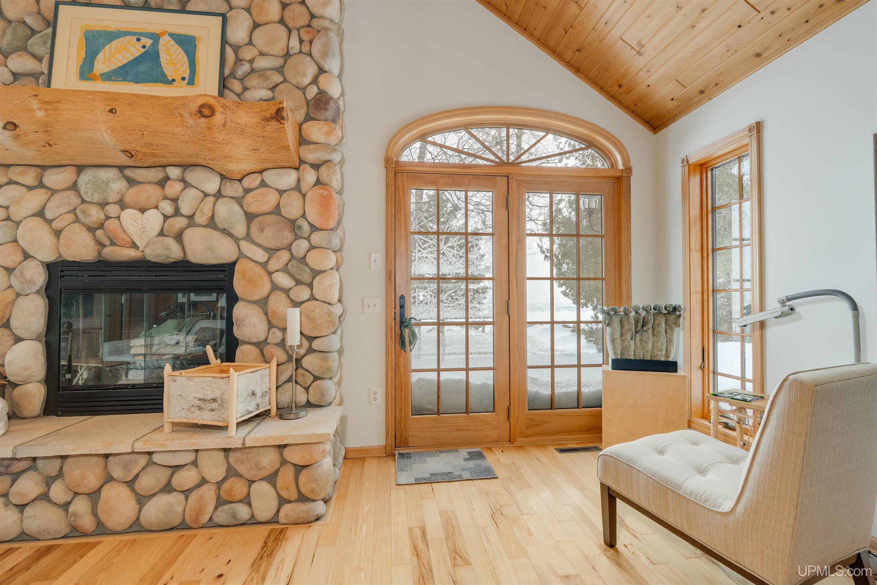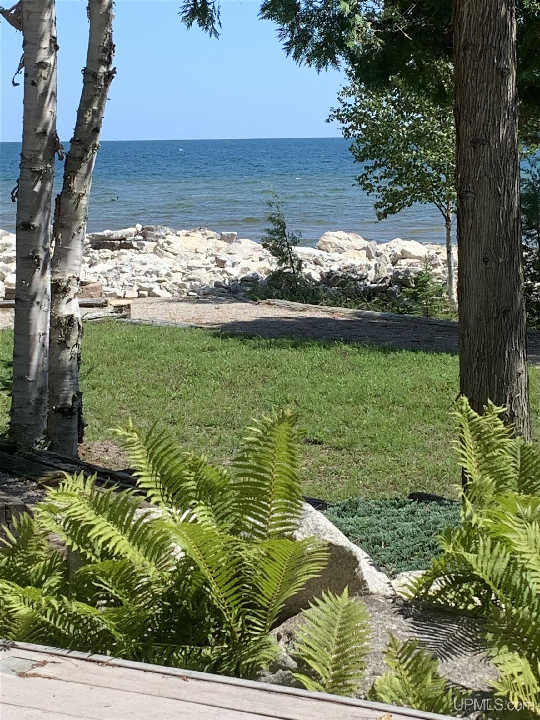 A beautiful escape awaits you on the north shore of Lake Michigan. This inviting 1,800 sq ft ranch-style home sits on 2.84 acres with approximately 200 feet of Lake Michigan shoreline, offering breathtaking sunrise views and a peaceful natural setting that brings serenity and tranquility to everyday life. Accessed via a private road and conveniently located just a few miles from town and the local hospital, the home features beautiful hickory hardwood floors, white cedar tongue-and-groove cathedral ceilings, creating an open and welcoming atmosphere. A stunning floor-to-ceiling stone chimney and wood-burning fireplace serves as a warm and inviting focal point in the living area. The home features three bedrooms, two full bathrooms, and a dedicated office, ideal for remote work or a quiet retreat. The kitchen is both stylish and functional, showcasing rich hickory cabinetry, quartz countertops, and marble-patterned luxury vinyl tile flooring that offers durability with timeless appeal. The primary bathroom features a neutral quartz countertop, while the second bathroom is finished with a porcelain countertop, both complemented by luxury vinyl tile flooring for easy maintenance. Quality Andersen windows and doors enhance the home’s design while providing excellent protection from the elements. The crawl space includes a full concrete slab with storage and is deep enough for easy access and maintenance. Outside, the exterior is just as impressive with low-maintenance Trex decking, a limestone breakwall to protect during periods of extreme high water. Above the detached two-car garage, you’ll find a bonus woodworking shop ideal for hobbies, projects, or additional storage. The property is set within a beautifully wooded landscape of cedar and white birch trees, enhanced by established perennial flower gardens that add seasonal color and charm. Just minutes away, the waterfront community of Manistique offers a lively downtown with shops, bars and restaurants, hiking trails, a public marina, and a wide range of year-round amenities. Whether you’re seeking a year-round residence or a serene lakeside retreat, this exceptional property offers privacy, space, and unforgettable Lake Michigan views in a truly special setting.