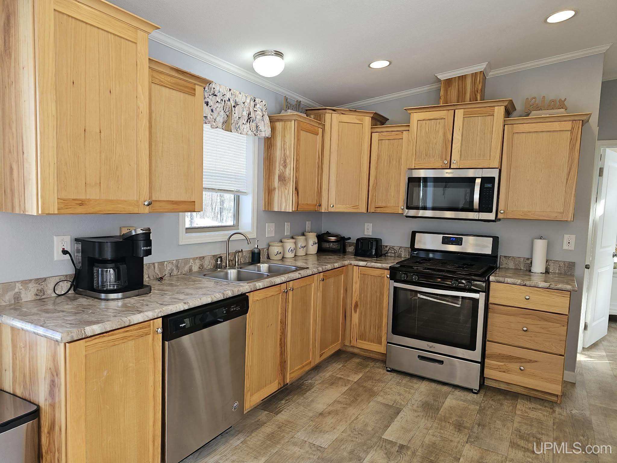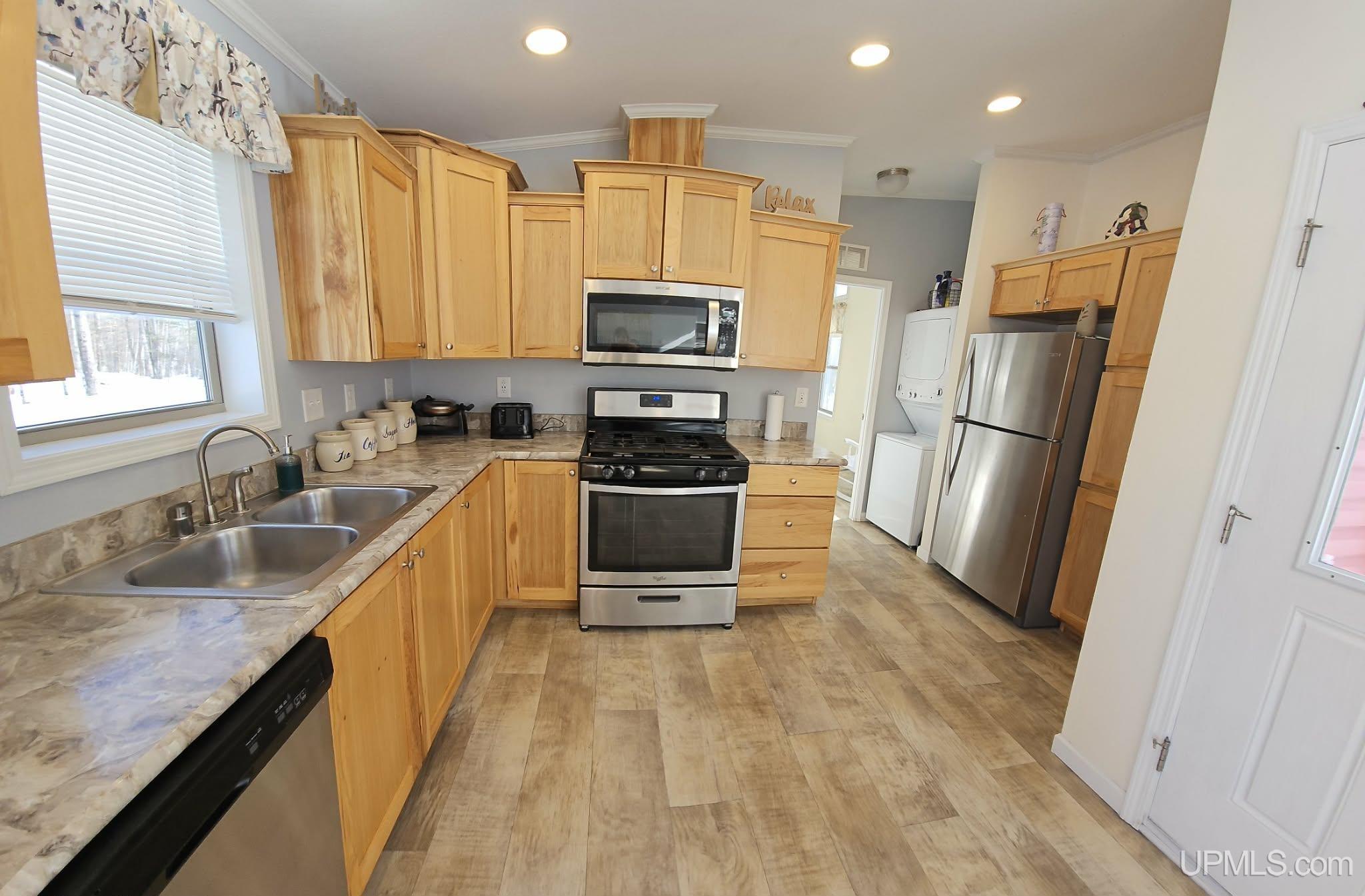 Well-maintained 2021 manufactured home offering 2 bedrooms and 2 full baths on secluded 2.93 wooded acres. This inviting home features a bright, open-concept living area which flows into a well-appointed kitchen showcasing beautiful cabinets and ample storage, perfect for everyday living or entertaining. A spacious master suite with a private bath, providing comfort and privacy. The property provides a peaceful country setting with groomed walking trails nearby, abundant wild berries, and plenty of secluded privacy. Outdoor enthusiasts will appreciate the proximity to off-road trails and the scenic Groveland Mine Ponds with 600 acres, known for fishing, areas for camping and for hunting. The spacious insulated and heated garage built in 2021 features 220 amp service, 2 offices & warehouse ideal for projects, storage, or recreational vehicles. Additional improvements include a double-door storage shed, gazebo for outdoor relaxation, and camping areas for guests or extra flexibility. Enjoy the quiet of rural living while still being conveniently close to local amenities. Ideal as a year-round residence, recreational getaway, or investment opportunity.