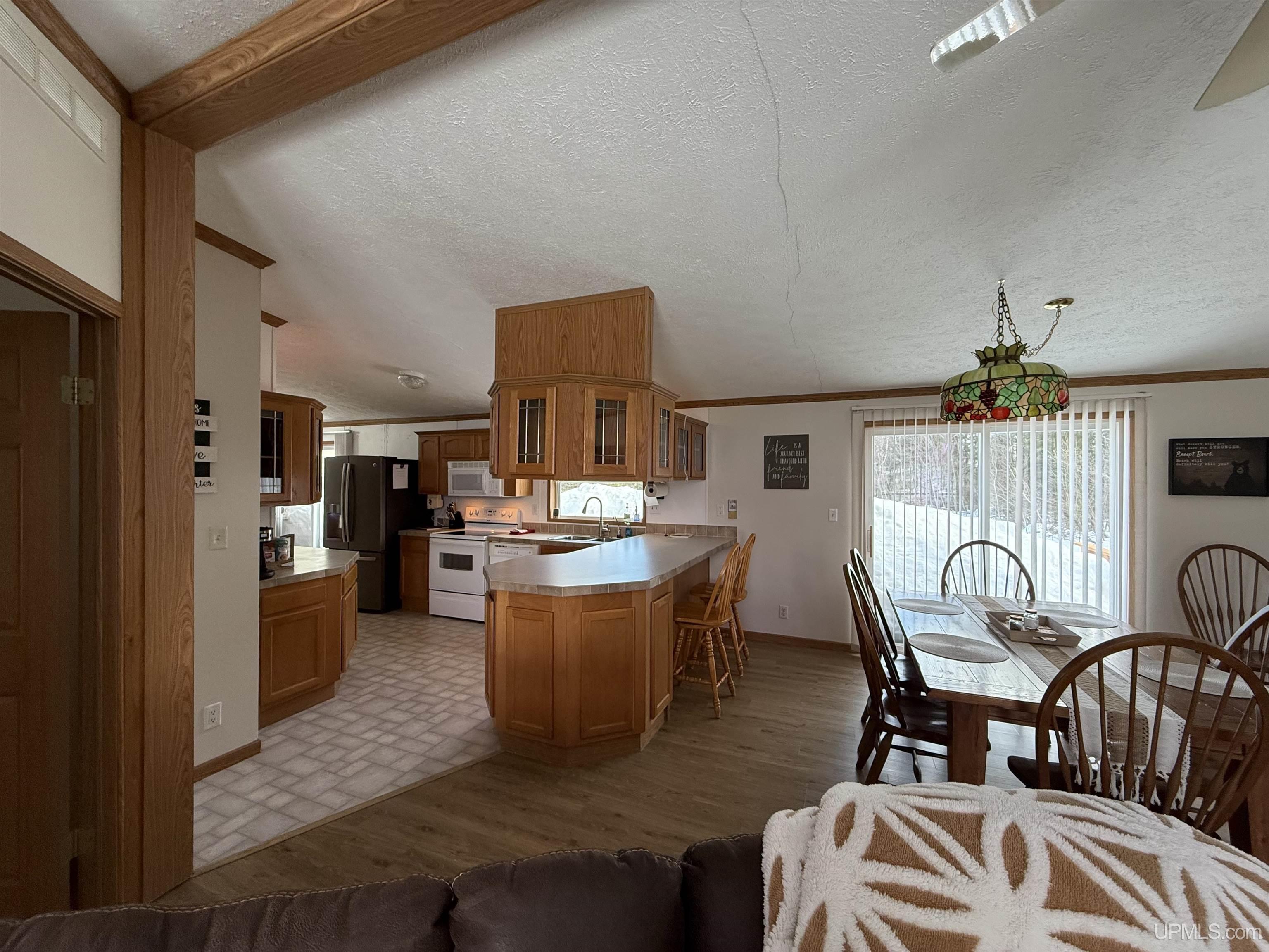 In a small quiet town surrounded by the Ottawa National Forest sits a 3-bedroom, 2 bath home ready to enjoy. One floor living with a great flowing floor plan that includes an open concept between dining area and living room. Kitchen has plenty of oak cabinets and along with a breakfast bar. Dining and living room have a great view of the backyard through a patio door that leads out to an outside deck. Primary bedroom has a walk-in closet along with its own private bathroom that includes a soaking jet tub and a separate shower. Down a hallway are 2 more bedrooms and a bathroom. Finally, a 2-door attached 30'x40' garage that can host cars and toys and also has a garage door leading out the back. There is a sitting room (transition room) leading into the home or the back yard. ATV/Snowmobile trail 2 is within riding distance. Pristine lakes in the Ottawa National Forest, waterfalls and the gem of the U.P., Lake Gogebic. This is your neighborhood!