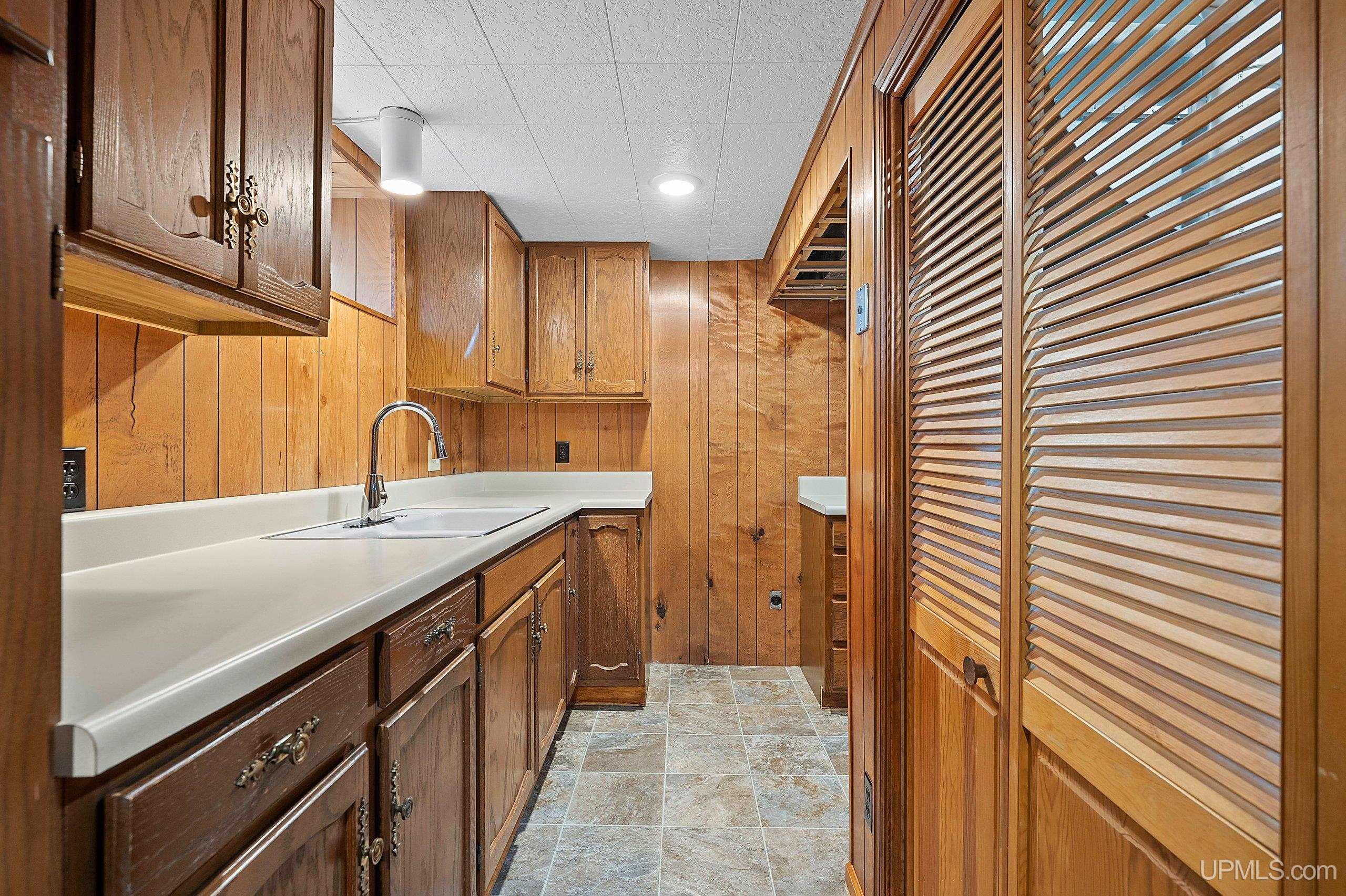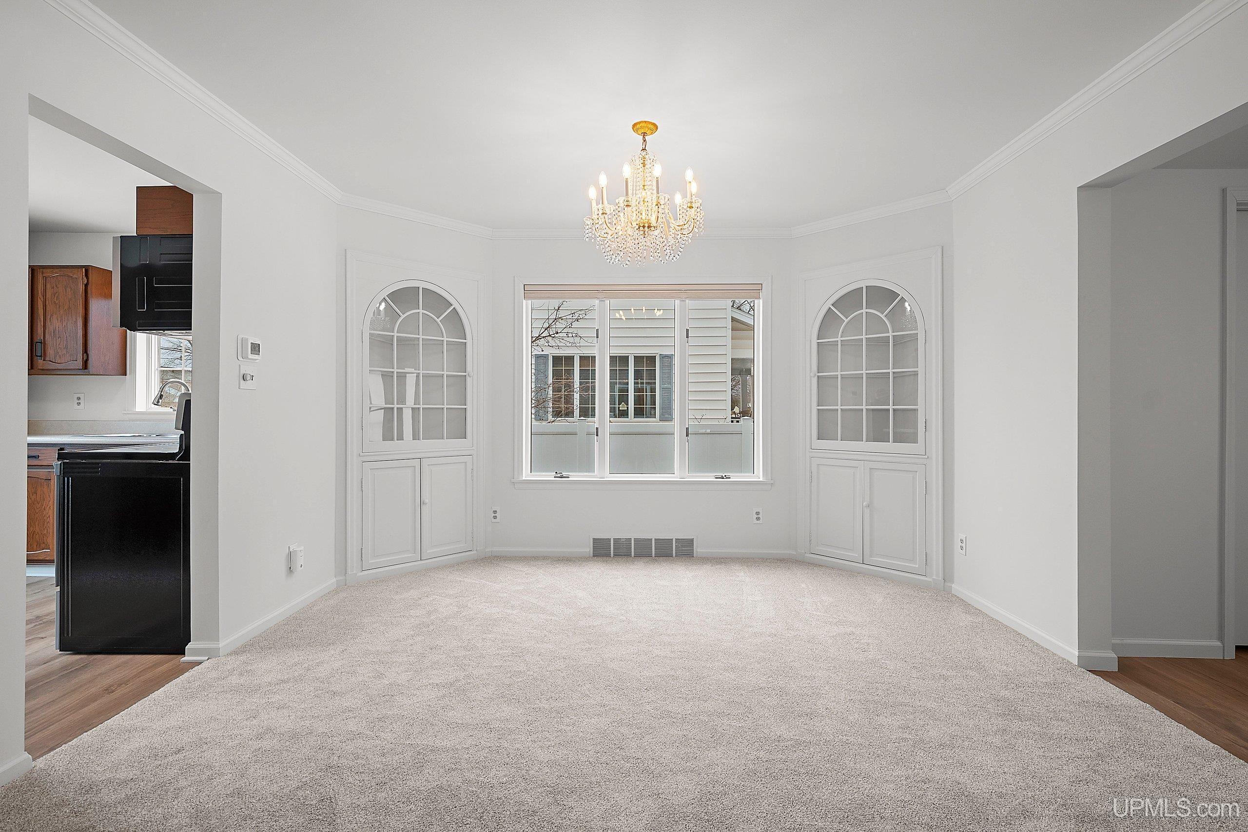 Located in the highly sought-after Historic Ford Addition in Kingsford, this charming home sits on a large corner lot with a fenced backyard and patio—perfect for relaxing or entertaining while enjoying the sounds of Friday night football from the nearby school. Pride of ownership shines throughout, both inside and out. Built with the craftsmanship of years gone by, this home offers timeless character paired with thoughtful updates and maintenance-free exterior improvements, including newer siding, a newer roof on both the home and garage, updated 200-amp electrical service, and a newly installed fence. Inside, hardwood floors, abundant natural daylight, and recessed lighting in the living and dining areas create a warm and inviting feel. Built-in cabinetry adds character to the dining space, while the front entryway doubles as a functional office and features a spacious walk-in cedar closet, along with a convenient half bath. The updated eat-in kitchen offers newer countertops, stove, refrigerator, and microwave, and flows seamlessly into the combined dining and living areas. Upstairs you’ll find two bedrooms, including a generous walk-in cedar closet. The lower level provides additional living space with a full bath, laundry area, and a versatile great room complete with a second kitchen setup—ideal for entertaining. Conveniently located within walking distance to schools, shopping, and Ford Park, this home blends charm, updates, and location beautifully. See complete list of improvements under assoc docs.