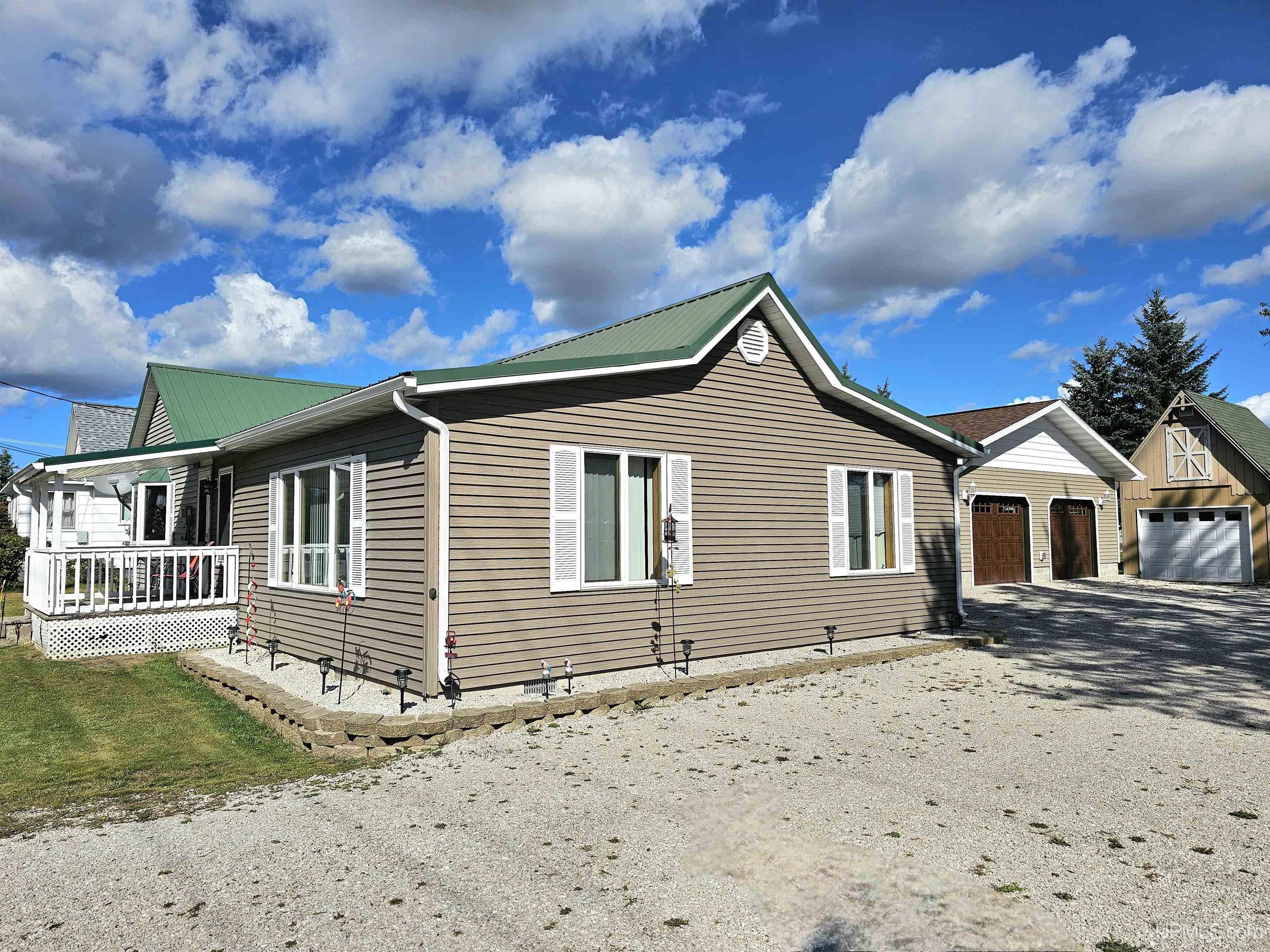 Discover ranch-style living with a dream garage! This immaculate 2-bedroom, 2-bathroom home is move-in ready and full of charm. The spacious living areas feature vaulted ceilings in both the living room and master bedroom, adding an open, airy feel throughout. The master suite includes a full bathroom and a large walk-in closet for added convenience. Dining options abound with a formal dining room, a kitchen counter with bar seating, and space for a small breakfast table. The kitchen design allows you to stay connected with guests in the living room, thanks to a thoughtfully placed opening between the two spaces. The laundry room doubles as a mudroom, keeping shoes, jackets, and clutter out of the main living area. Storage is no issue here! This property comes with a brand-new 30x30 insulated garage plus 12' overhang, complete with a 10-foot covered patio at the back and a convenient pass-through garage door. In addition, three large storage sheds are included, ensuring you'll never run out of space. Situated on a double lot just within city limits, you'll enjoy easy access to all the amenities of town while maintaining a peaceful, residential feel. This home is a must-see!