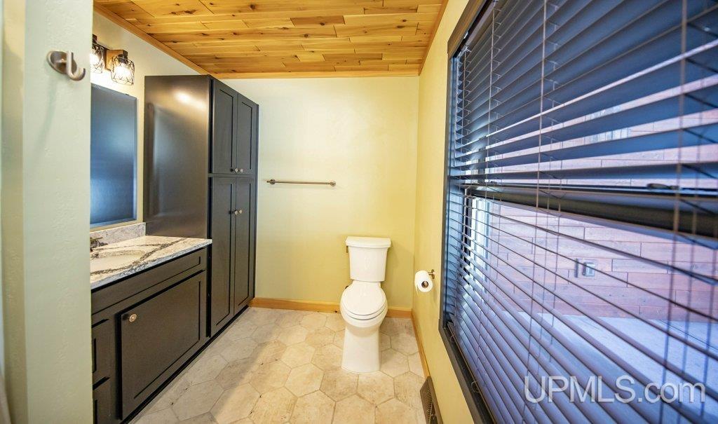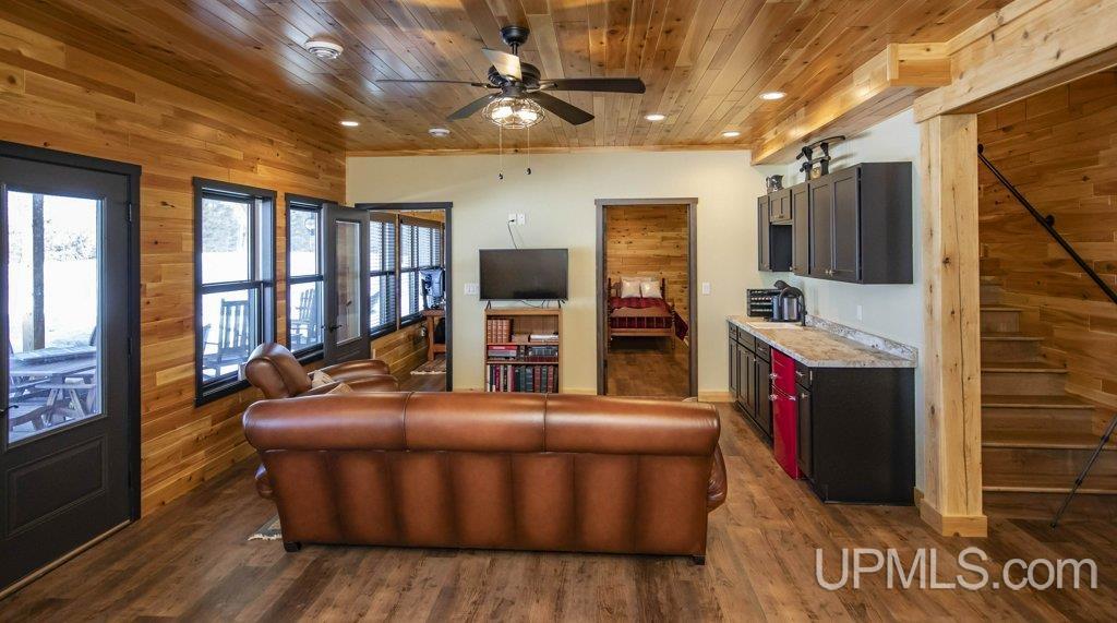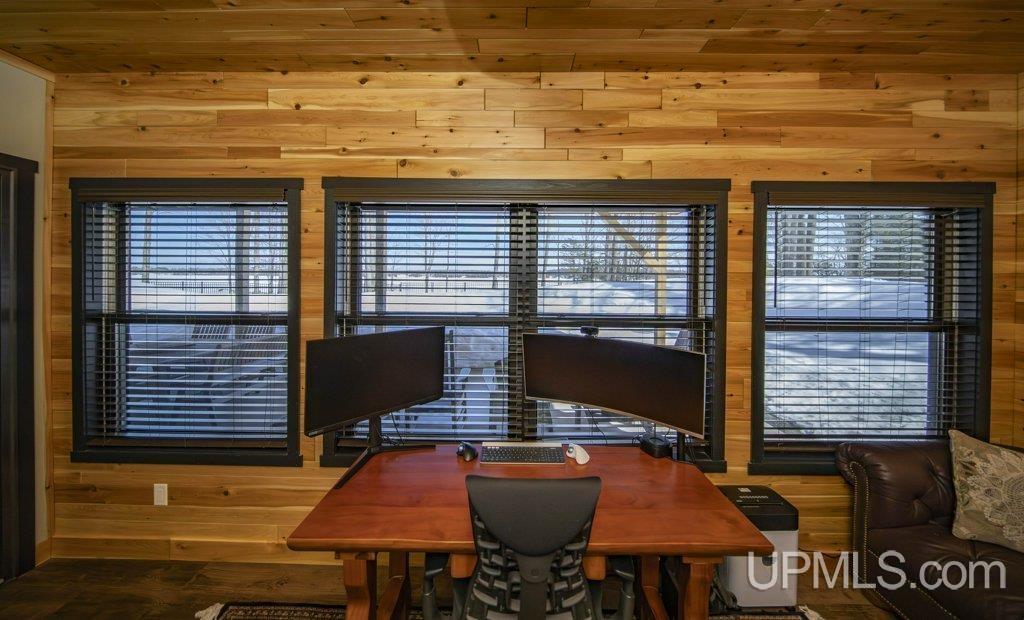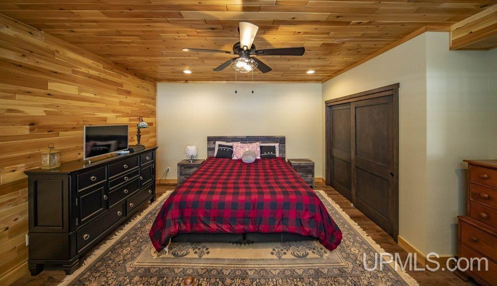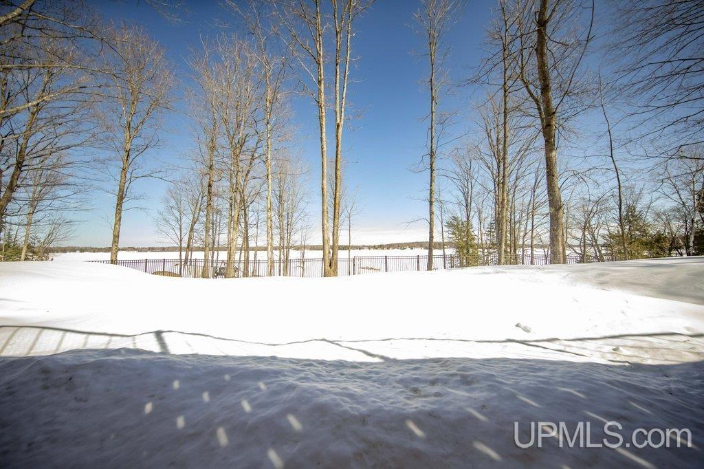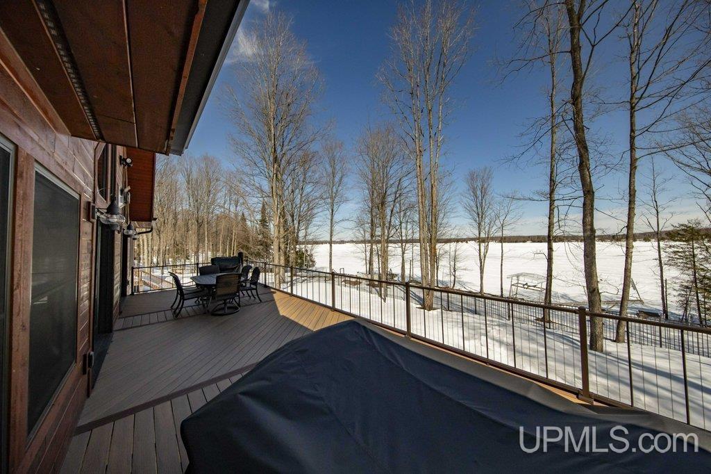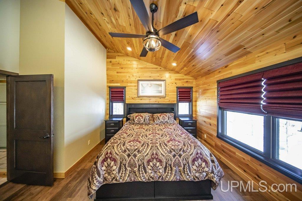 Experience elevated Northwoods living on the shores of Sunset Lake, a breathtaking 560-acre all-sports lake in Bates Township known for its crystal-clear waters, public beach, pavilion, and year-round recreation. Newly constructed in 2024, this exceptional ranch-style waterfront residence offers 100 feet of pristine frontage and showcases a seamless blend of refined design and timeless Northwoods character, highlighted by warm wood ceilings, rich wood accents, and a beautifully crafted staircase that carries the aesthetic throughout the home. From the moment you enter, you’re welcomed by soaring cathedral ceilings and a dramatic floor-to-ceiling fireplace, perfectly positioned to frame panoramic lake views. The open-concept layout flows effortlessly into a thoughtfully designed kitchen featuring quartz countertops, custom cabinetry, and an inviting bar area, ideal for both intimate gatherings and entertaining. A private sunroom or office just off the kitchen provides a quiet retreat with sliding doors and tranquil water views. The main-level primary suite is a true sanctuary, offering expansive lake-facing windows, walk-in closets, and a spa-inspired bath complete with a tiled walk-in shower, Kohler soaking tub with ceiling-mounted filler, and in-floor heat for added comfort. With 4 to 5 bedrooms and 3 full baths, this home is designed to accommodate both everyday living and hosting with ease. The walkout lower level extends the living space with additional bedrooms, a full bath, and a warm, inviting family room with kitchenette and bar, creating the perfect setting for guests. A bonus room currently serves as a yoga studio, while a charming under-stair book nook adds a touch of character. Multiple living spaces, including a four-season room overlooking the water, offer flexibility for relaxation or work-from-home needs. Quality finishes continue throughout with ceramic wood-look tile flooring, a spacious utility and storage area, and an extra-deep 2+ car attached garage plumbed for heat. Outdoors, a concrete driveway leads you home, while a fenced yard adds convenience. Evenings are best spent lakeside around the smokeless Breeo firepit, taking in the unforgettable sunsets that give Sunset Lake its name. The dock with steps and all appliances are included, making this a truly move-in-ready offering. Whether you’re seeking a year-round residence or a private waterfront retreat, this property delivers a rare opportunity to own a piece of Michigan’s Northwoods at its finest. Private showings available for preapproved buyers.